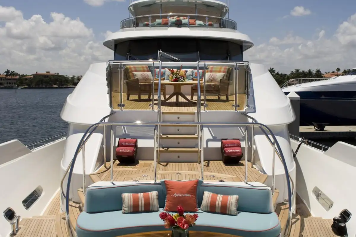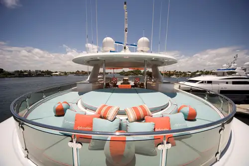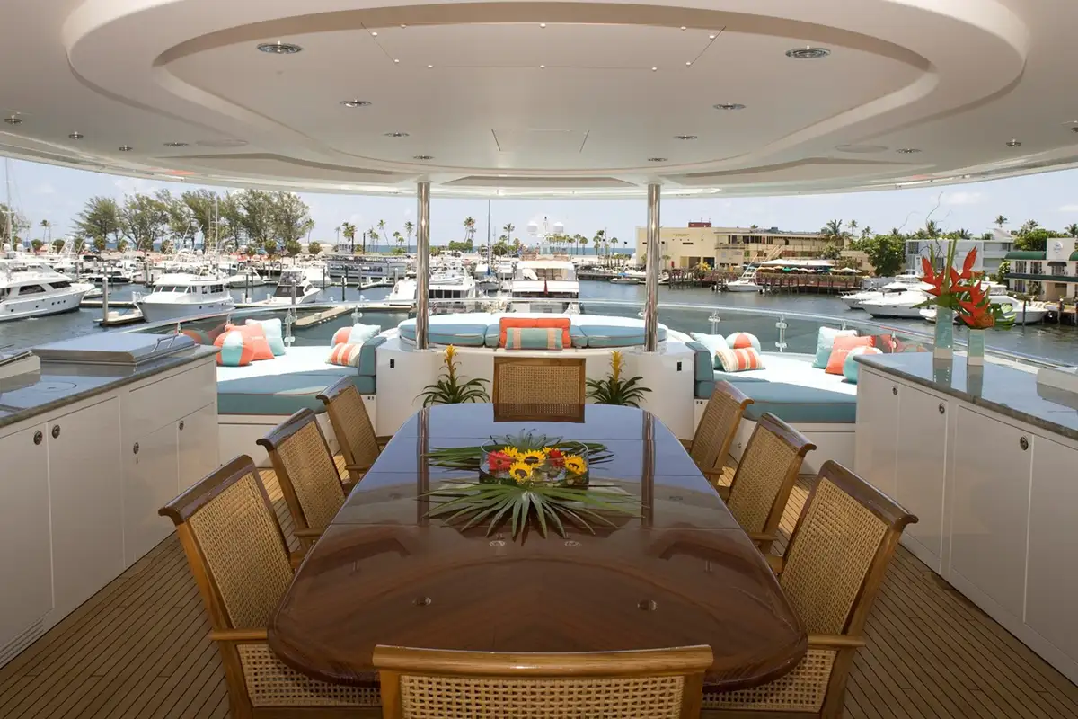 Up on the sun deck there’s a jacuzzi pool forward, encircled by sunpads, a spacious dining area amidships in deep shade with an eight-seat table, and sun loungers aft with a pair of parasols. It’s a great place for a small party or for a family to enjoy some quality time together.