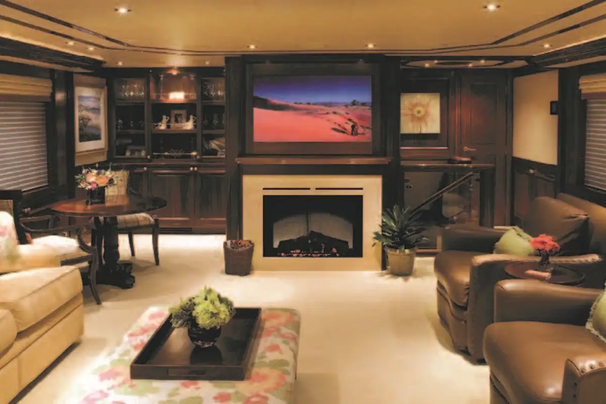 One level down, the upper deck’s sky lounge is a cosy sitting room with armchairs and sofas, a big TV, a fireplace and a games table off to one side. You can step straight out onto the upper aft deck where there’s a lounge with plenty of shade.