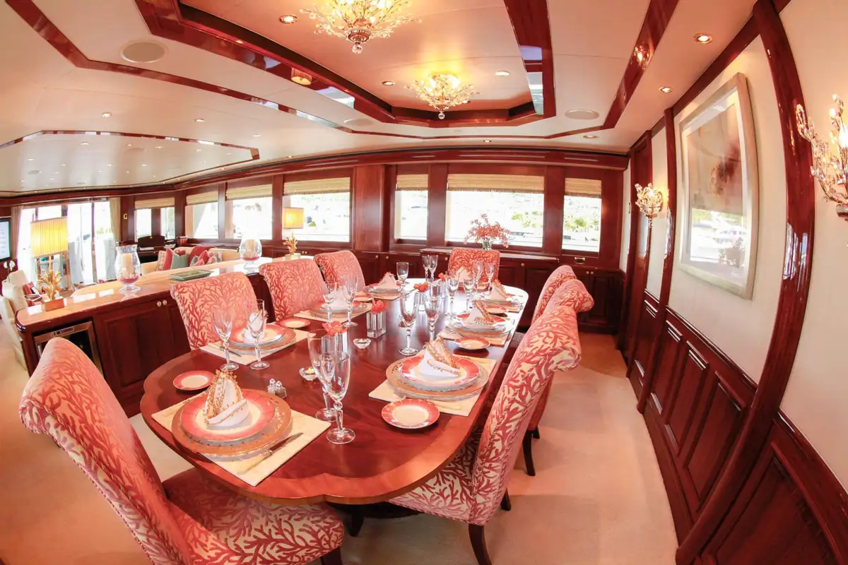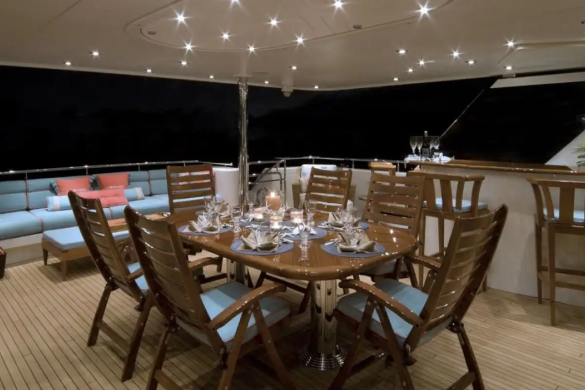 The main deck is an inviting, open plan space with a sociable lounge and a formal dining table with twin chandeliers overhead. It’s finished in traditional mahogany with cream sofas and carpets to give a classic, opulent vibe. Stepping out onto the main deck aft, you’re in another outdoor dining area – the perfect place to gather for breakfast – with a sit-up bar on one side and comfortable seating aft.