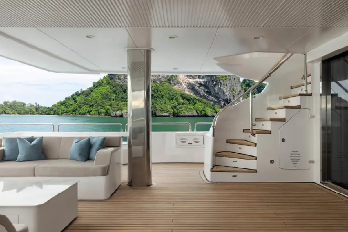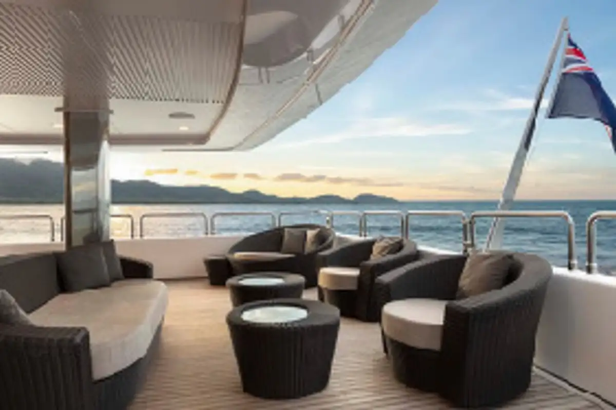 It's not just the inside that takes advantage of her shrewd design. From the main deck upwards, PANAKEIA has three full-width decks, climaxing in the amazing sun deck. Here, you and your party can enjoy al fresco dining at its finest. You can also enjoy drinks at the bar or the raised jacuzzi. In the cockpit and on the upper deck there are also beautiful al fresco lounge areas to enjoy. And wherever you are on PANAKEIA, you’ll be having a delightful time.