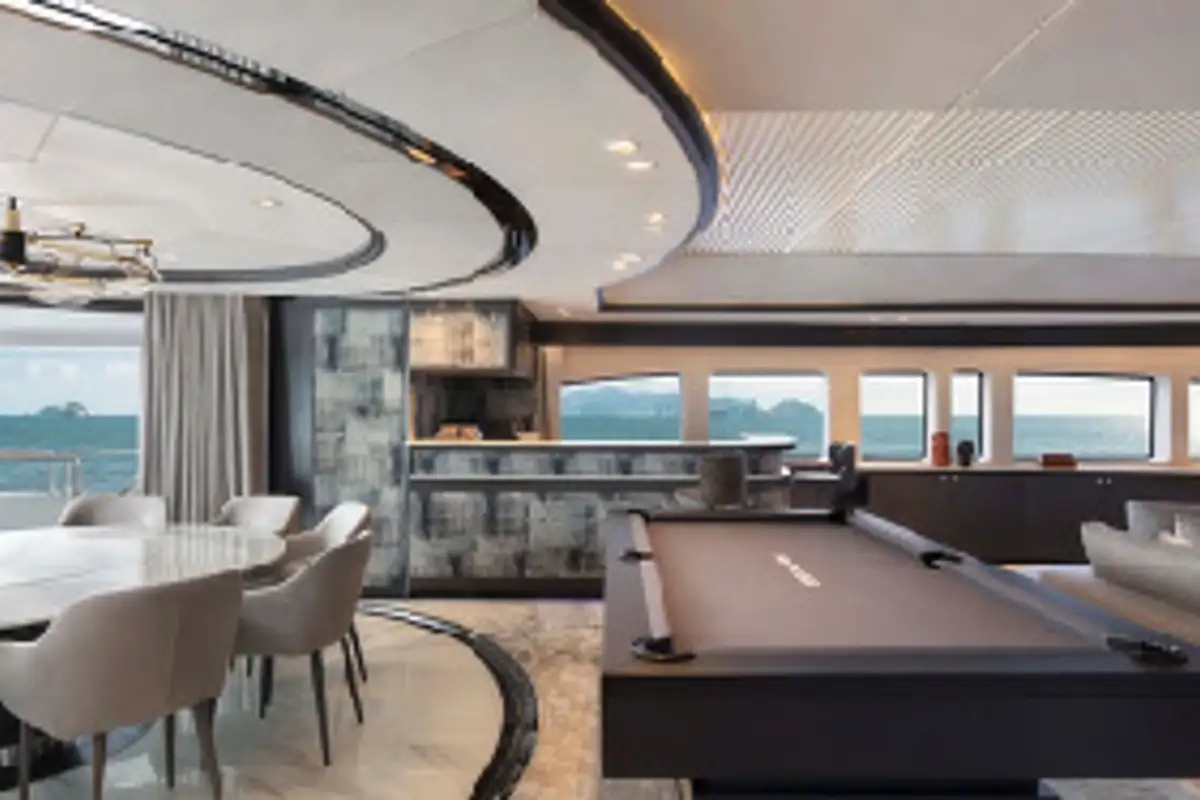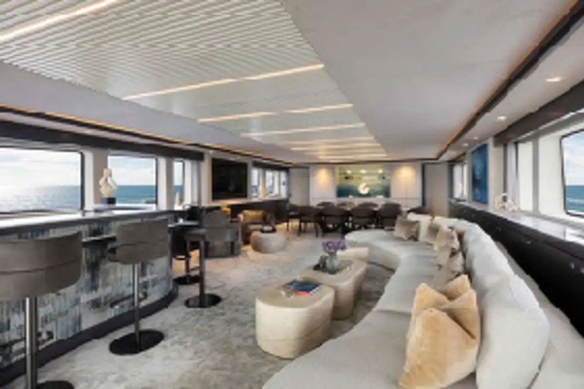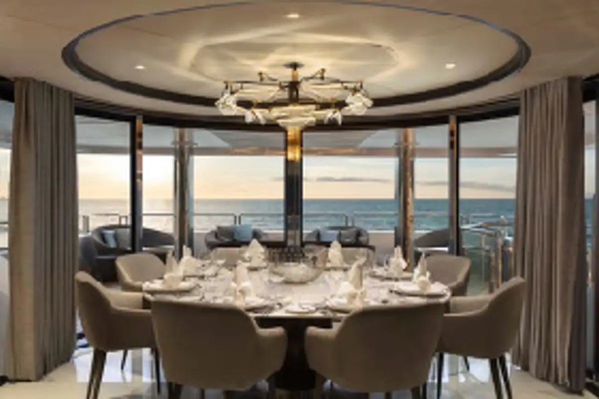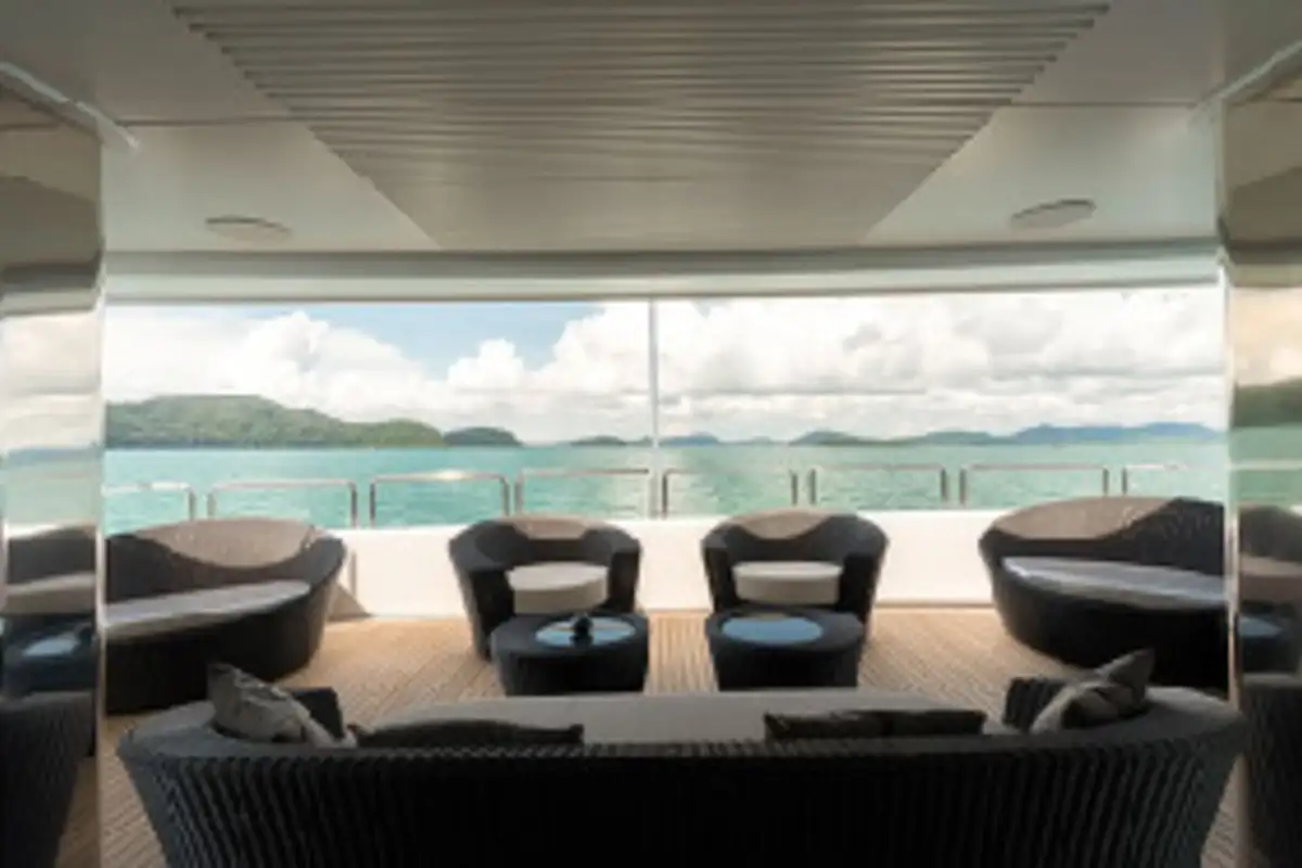 The full beam layout has allowed many areas of PANAKEIA to flourish. Like the forward master suite, furnished with a huge walk-in wardrobe and full-beam en suite bathroom. There’s also an elevator to take guests effortlessly from the guest suites on the lower deck, via the lobby, to the beautiful sky lounge. The expansive sky lounge gives the impression of relaxing on a much larger yacht. It’s here you unwind in the plush sofas and perhaps watch a movie with a drink from the marble-topped bar. Dinner can be served around the glorious dining table at the rear of the lounge. Wraparound floor-to-ceiling glass doors can be enclosed to create an intimate dining area. Alternatively, they can open to the sky lounge, the upper aft deck, or both.