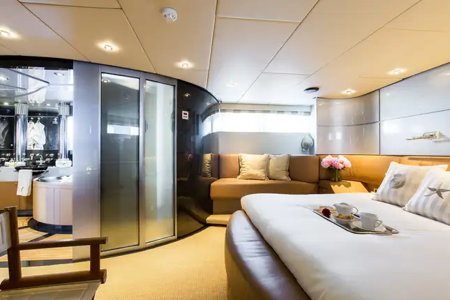 Ten guests are accommodated across four cabins on the lower deck- all of which feature modern furnishings and understated features. In 2007 and again in 2016, she underwent full refurbishments when all the interiors were upgraded to ensure she remains fresh and contemporary. The master suite is located forward and fills the full width of the yacht with a king-sized bed, large bathroom with jacuzzi spa bath set out on a semi-circular floorplan. The bedroom and bathroom is separated by a glass panel to provide a feeling of a much greater space; at the flick of a switch this glass can turn opaque or clear. There are a further three suites- two double cabins and a quadruple cabin, all with en suite shower rooms.