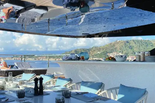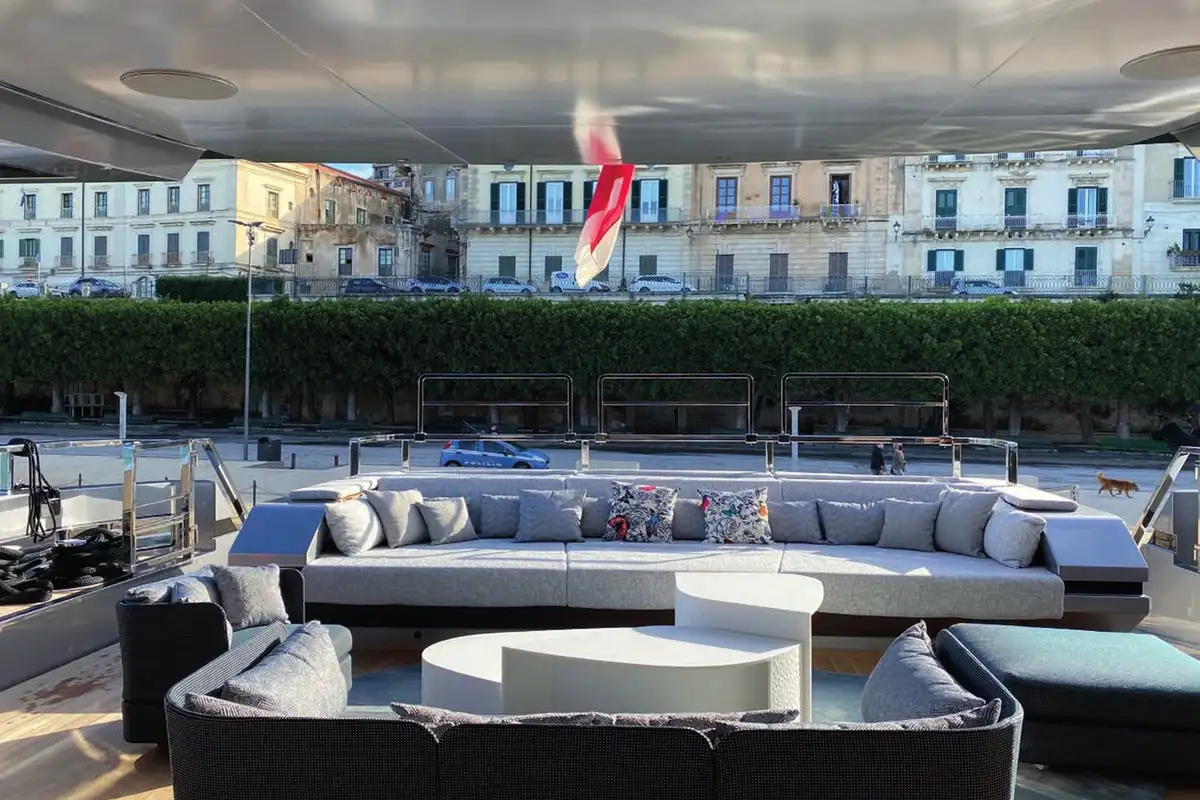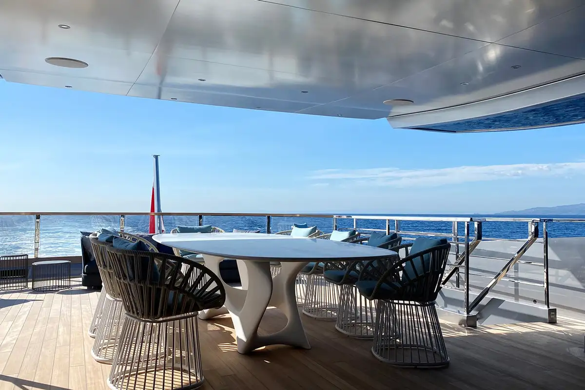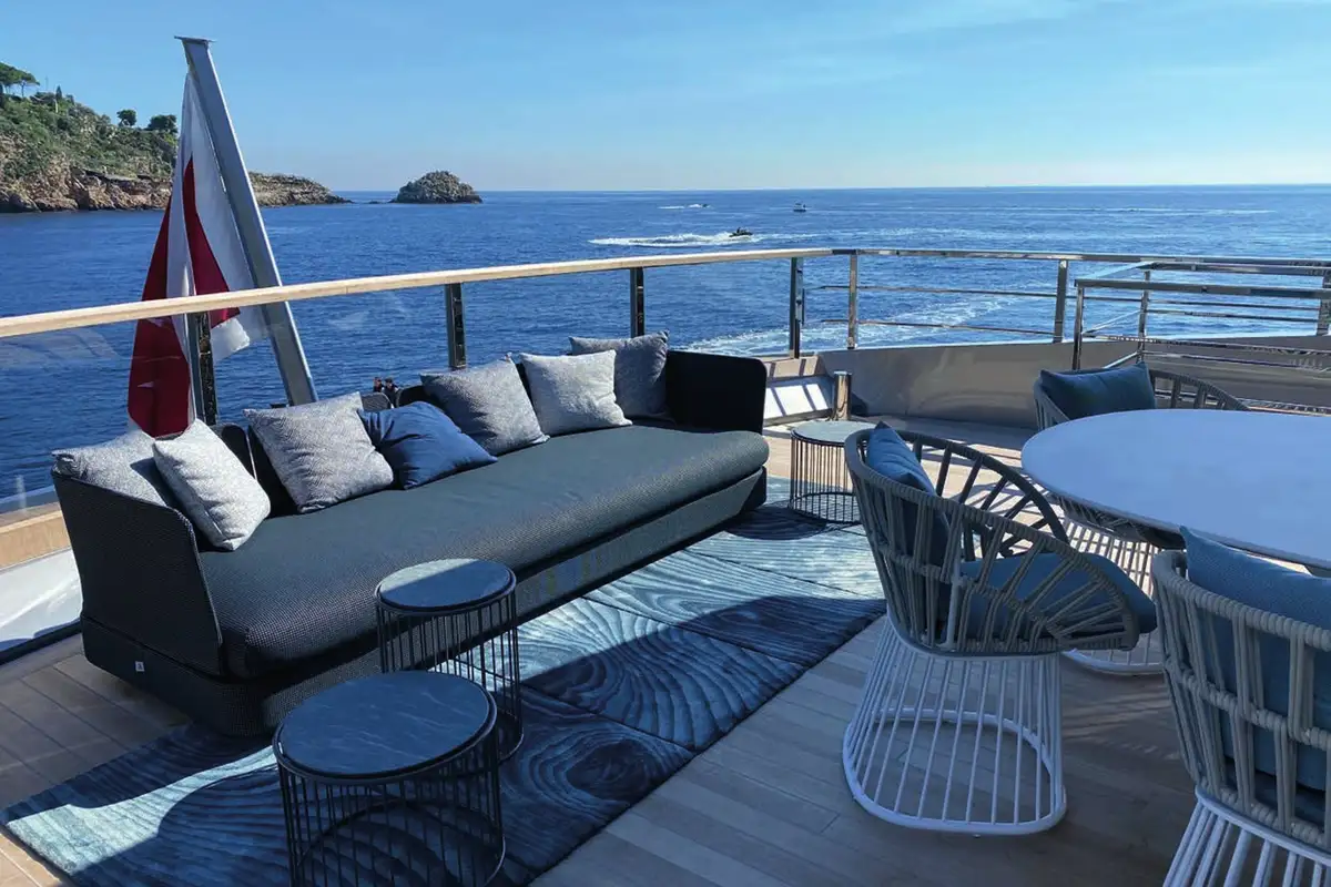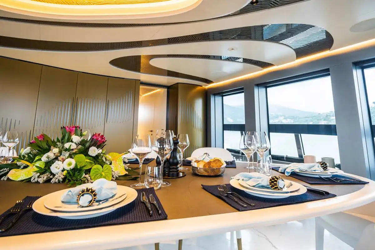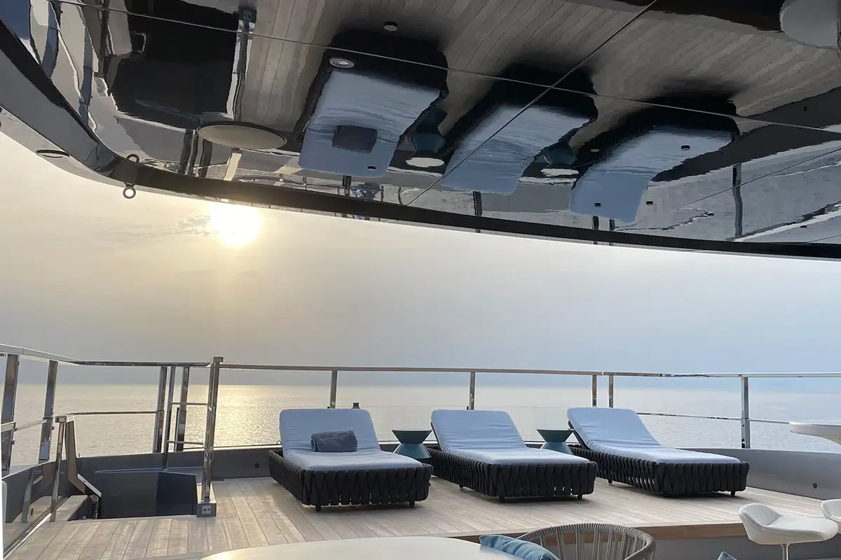 The square glass jacuzzi pool on her foredeck is a notable highlight with ample elbow room for at least six guests to chill out and cool down, or play and splash around. The sun deck is another superbly designed open-air space with a raised sunbathing deck up front, a bar and dining area in cool shade and a lounge with full-beam day beds aft. The main outdoor dining area is on the upper aft deck where the 10-seat oval table is a splendid setting for the chef’s fine cuisine and there’s a quadruple day bed for cosy after-dinner drinks as the sun sets into the sea.