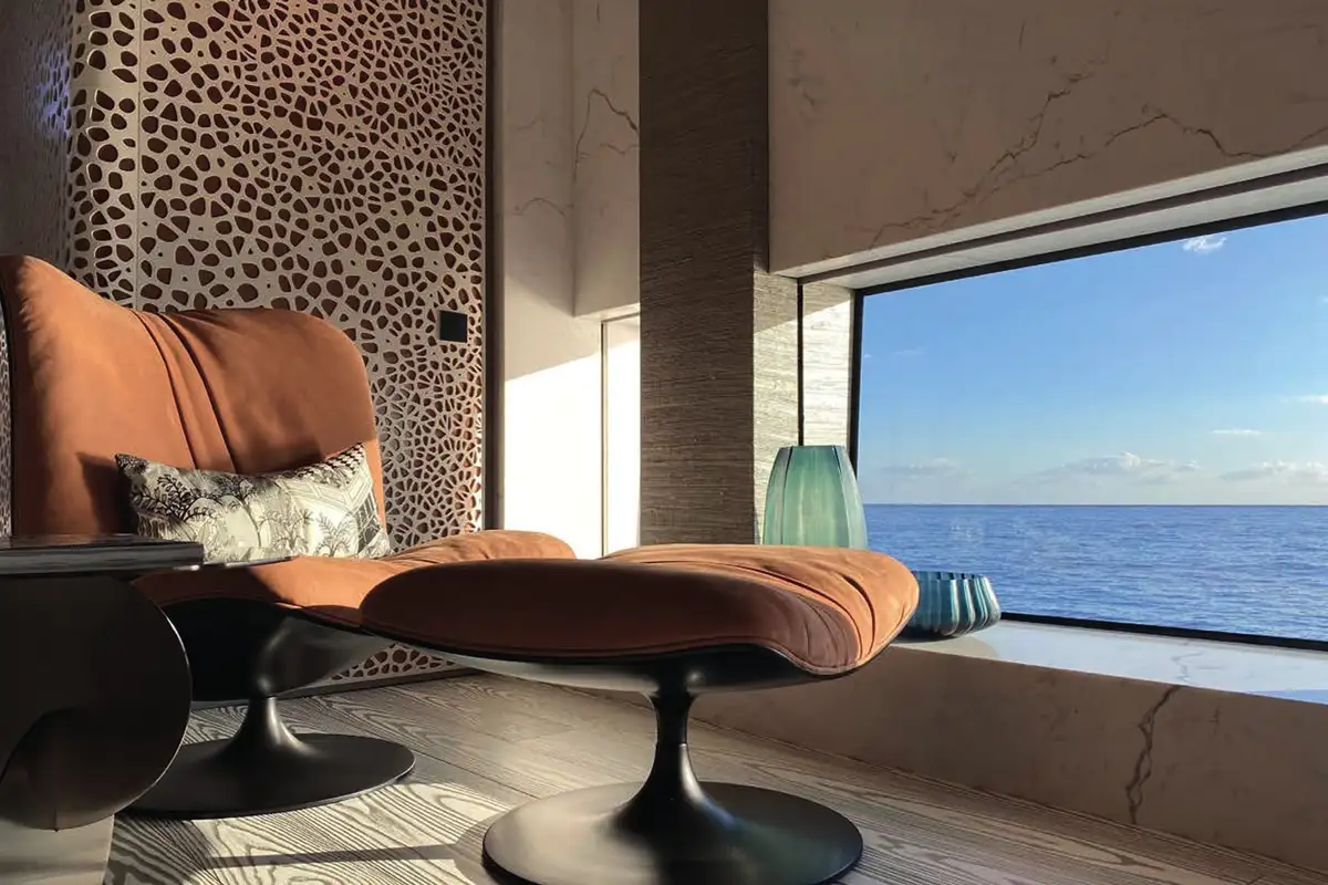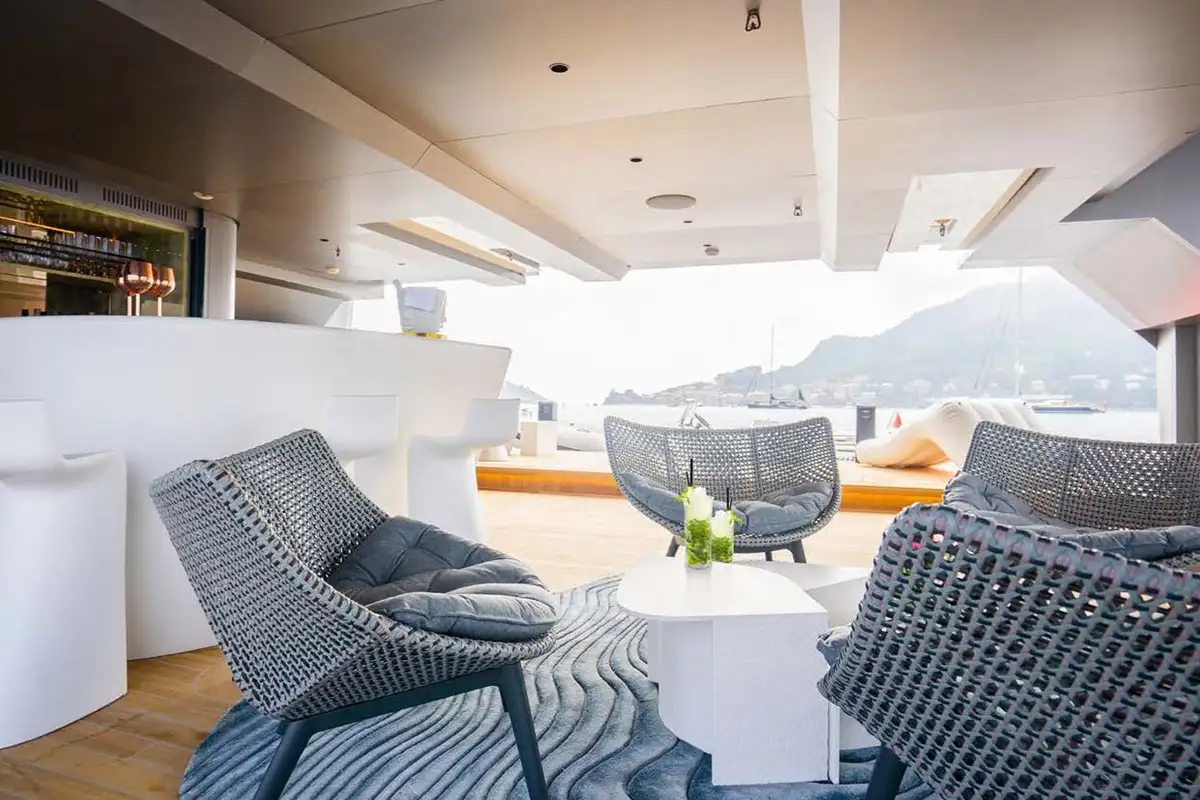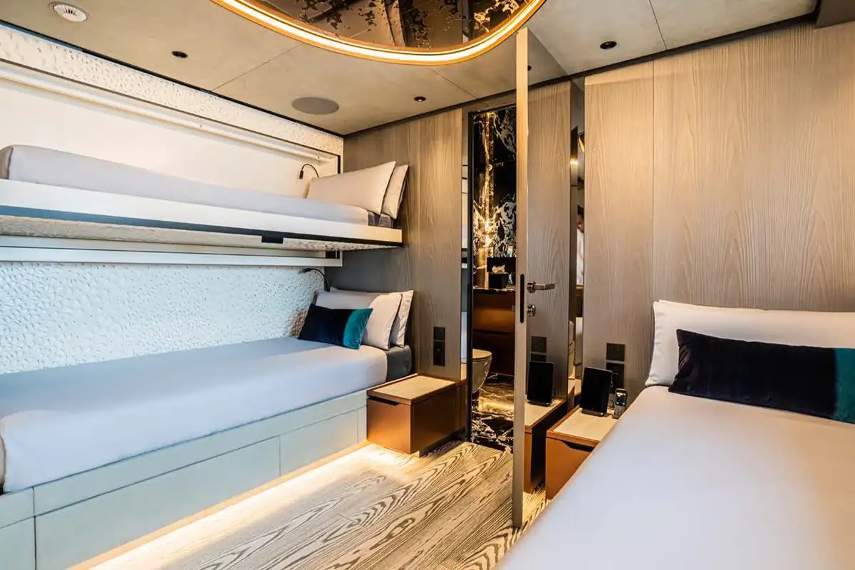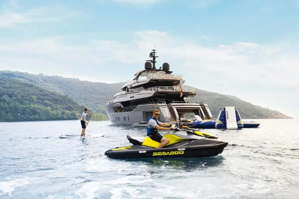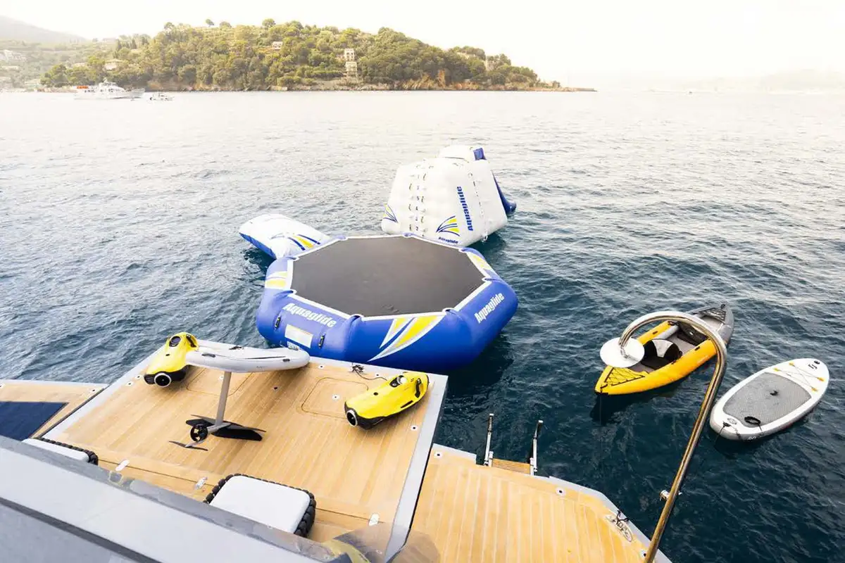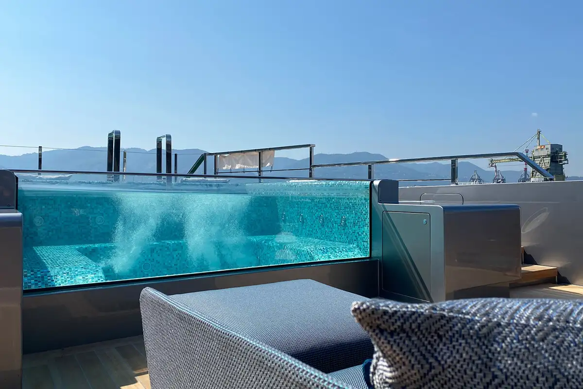 There’s also an excellent beach club in her stern, where a comfortable lounge and cocktail bar are set up when the anchor goes down and her tenders and toys are deployed. With large opening platforms on three sides, it’s the perfect place to take a break between sessions of Fliteboarding, kayaking, jet skiing, trampolining, wakeboarding, SeaBob excursions and many other aquatic activities. Exhilaration and fun for all ages and abilities is assured, and there’s a large seawater swimming pool where kids can safely swim.