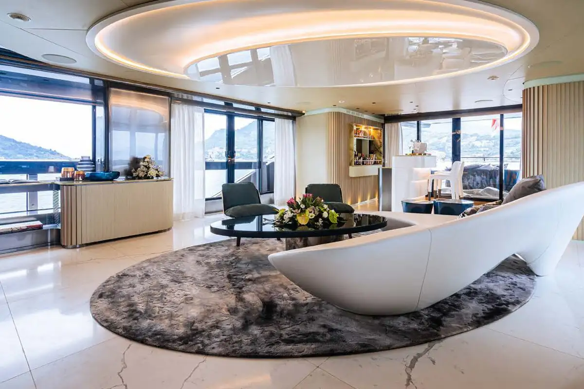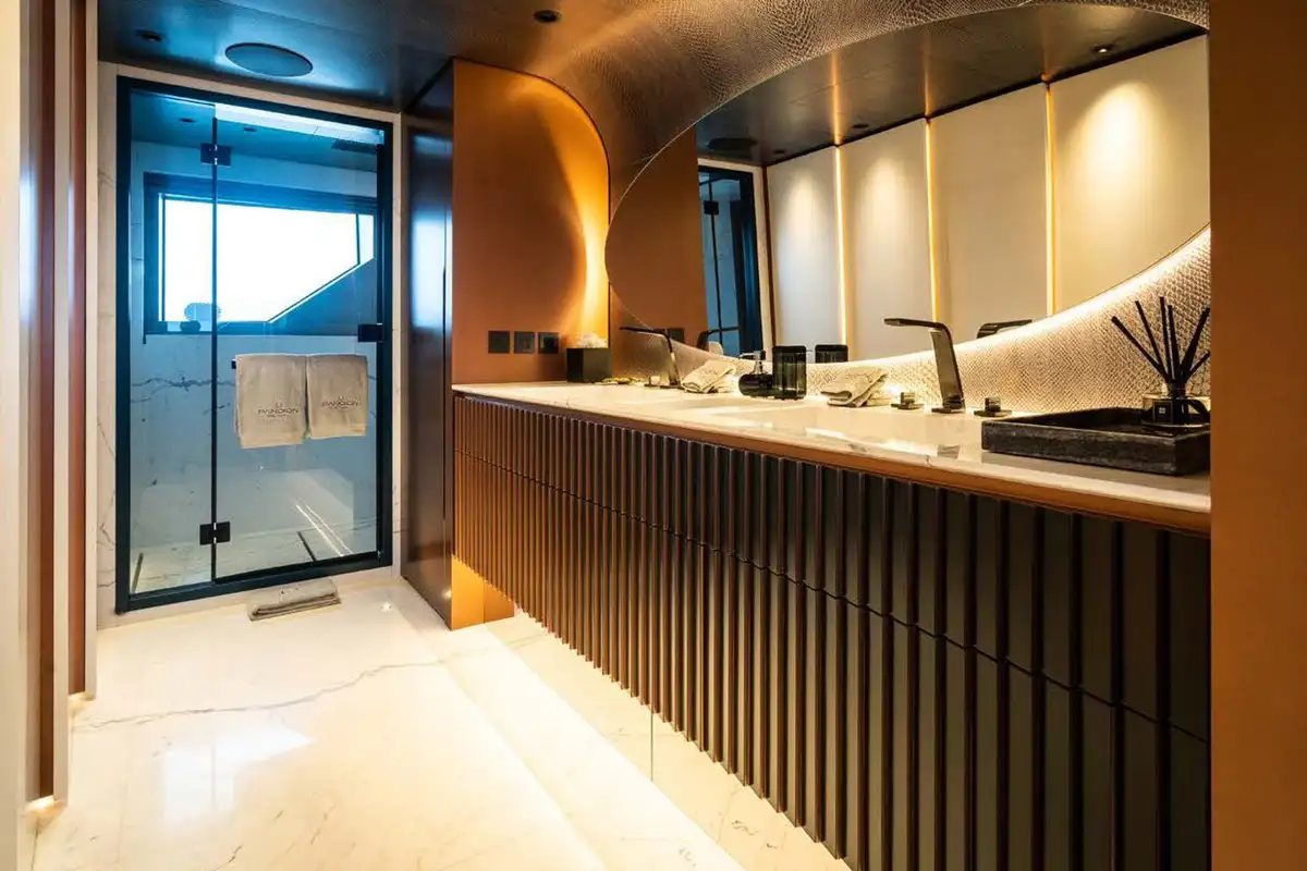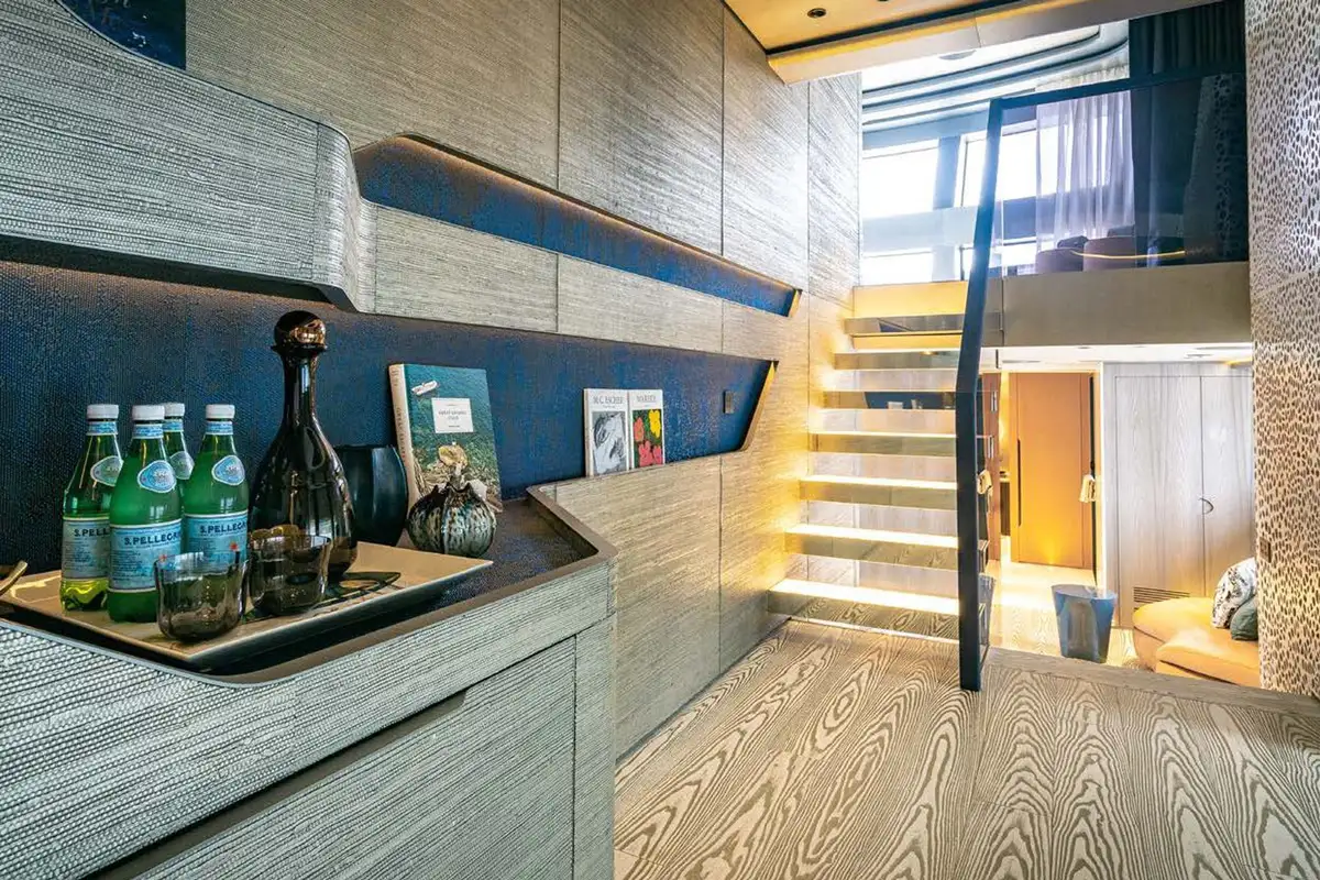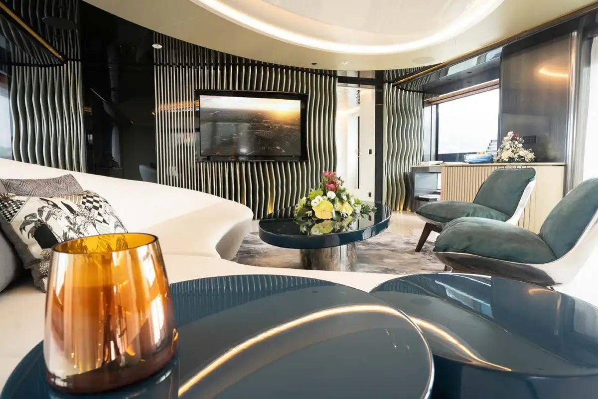 Thanks to her extra-wide hull, there’s a luxurious sense of space throughout her interior – and especially in the lush master suite, which spans three decks, and whose floor plan adds up to almost 150sqm with several private seating areas and direct access to the foredeck. The main deck saloon is equally impressive, with some striking details in its stylish lounge and dining areas.