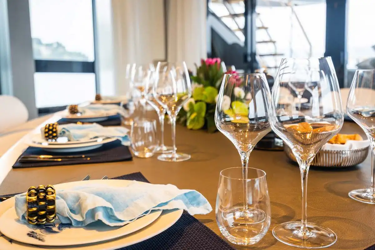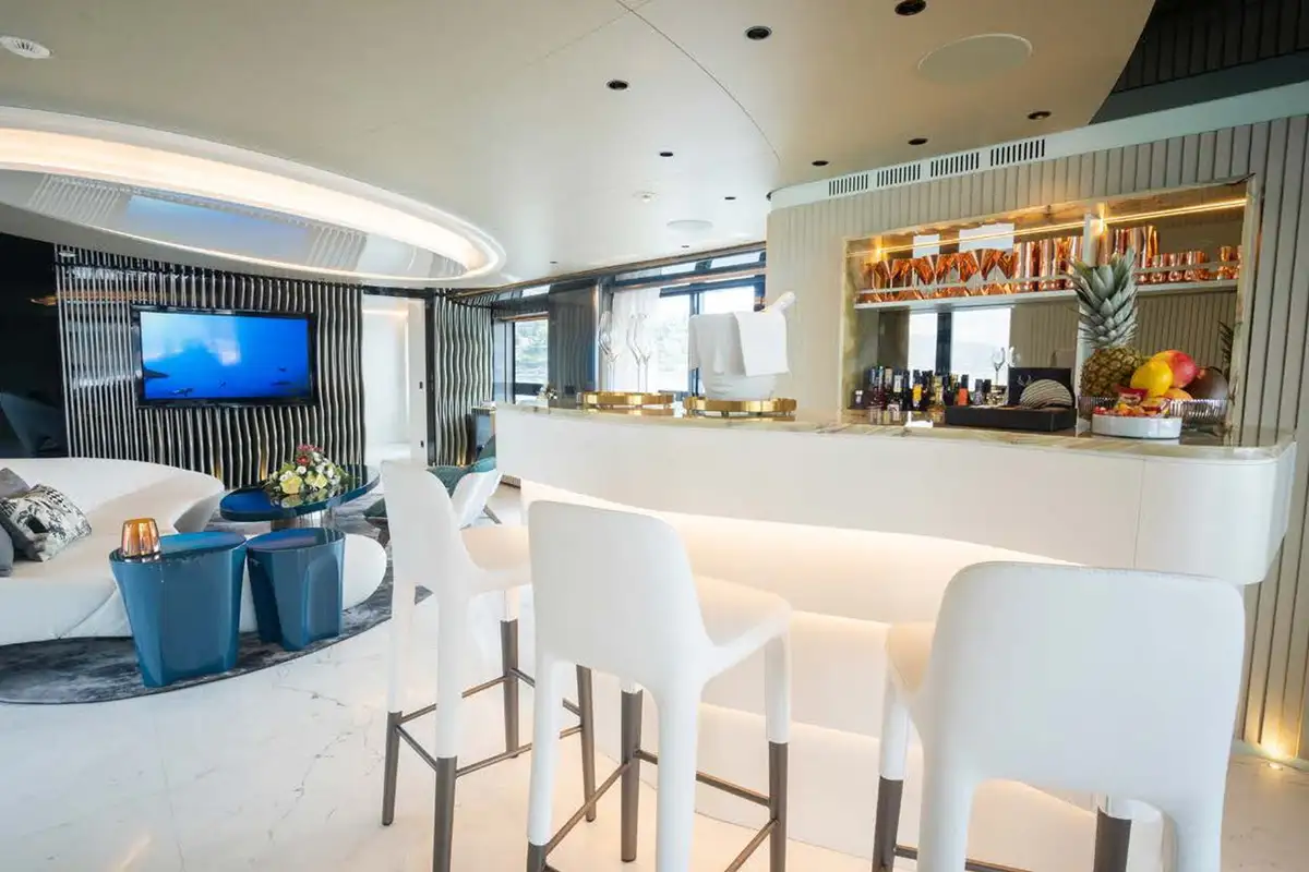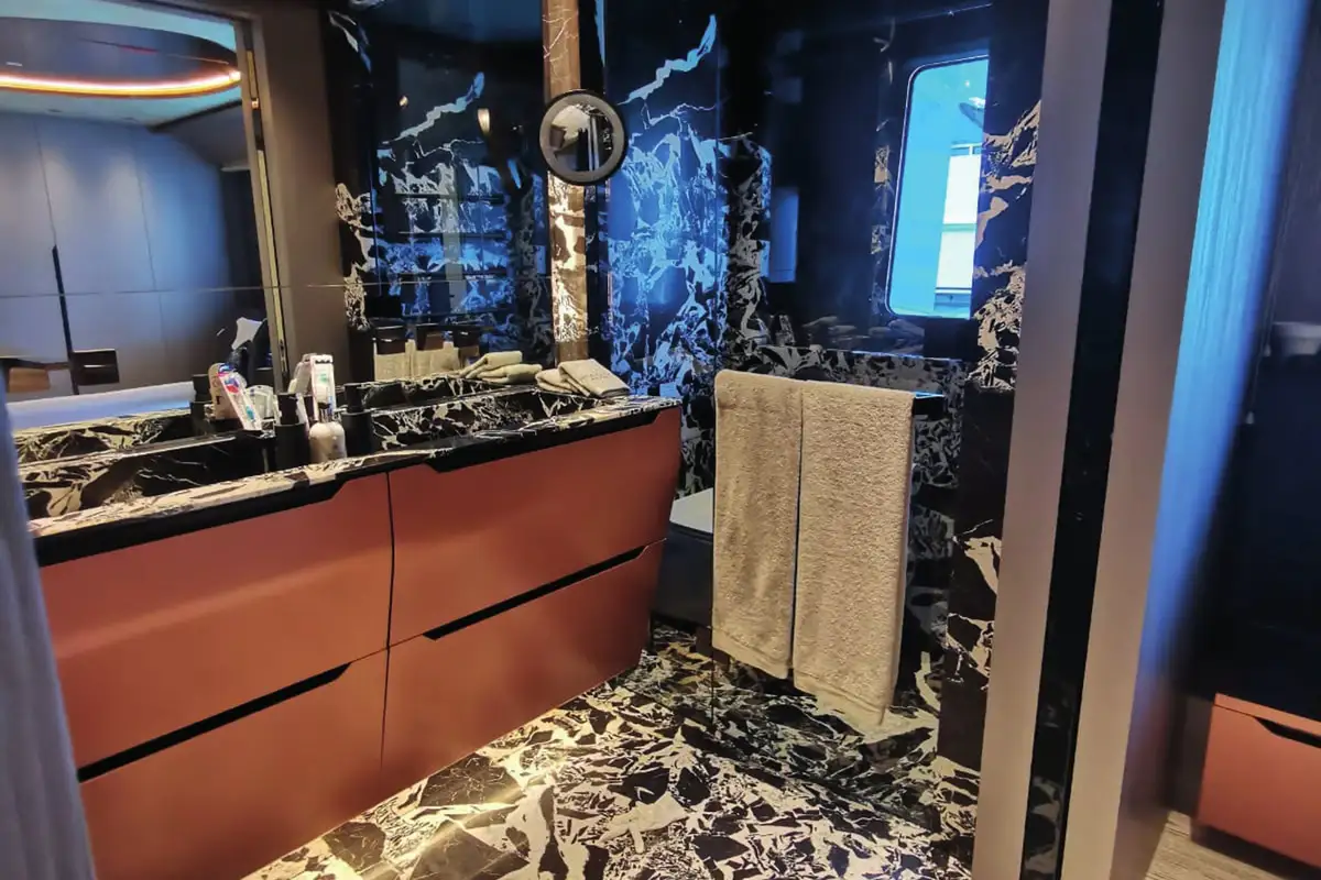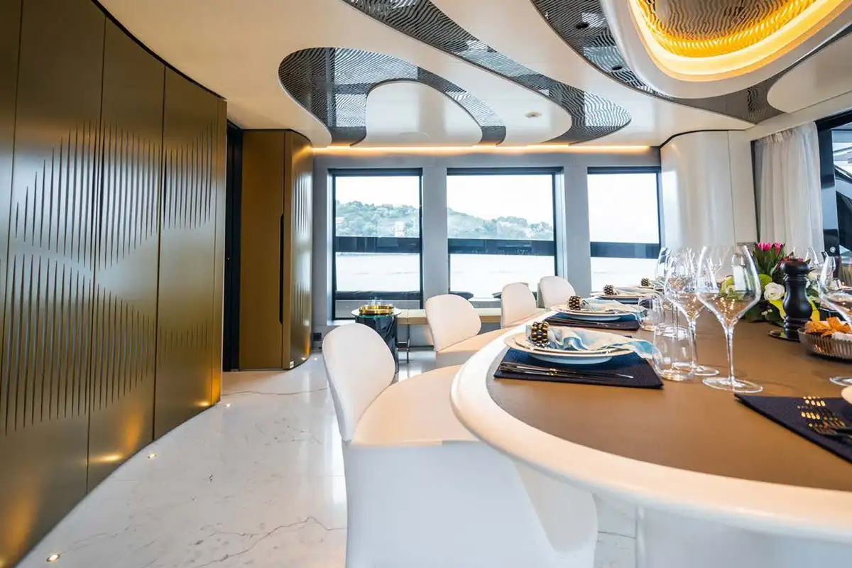Thanks to her extra-wide hull, there’s a luxurious sense of space throughout her interior – and especially in the lush master suite, which spans three decks, and whose floor plan adds up to almost 150sqm with several private seating areas and direct access to the foredeck. The main deck saloon is equally impressive, with some striking details in its stylish lounge and dining areas.