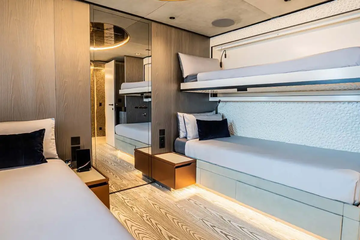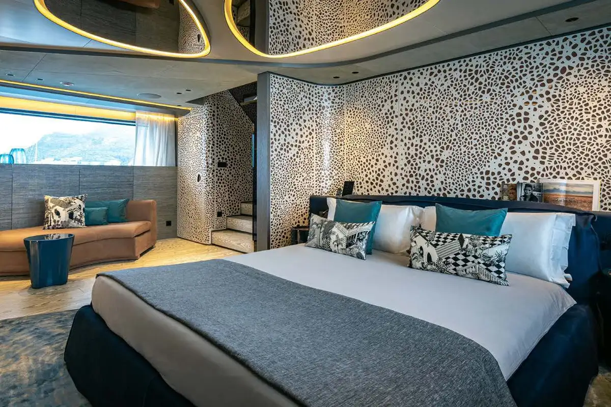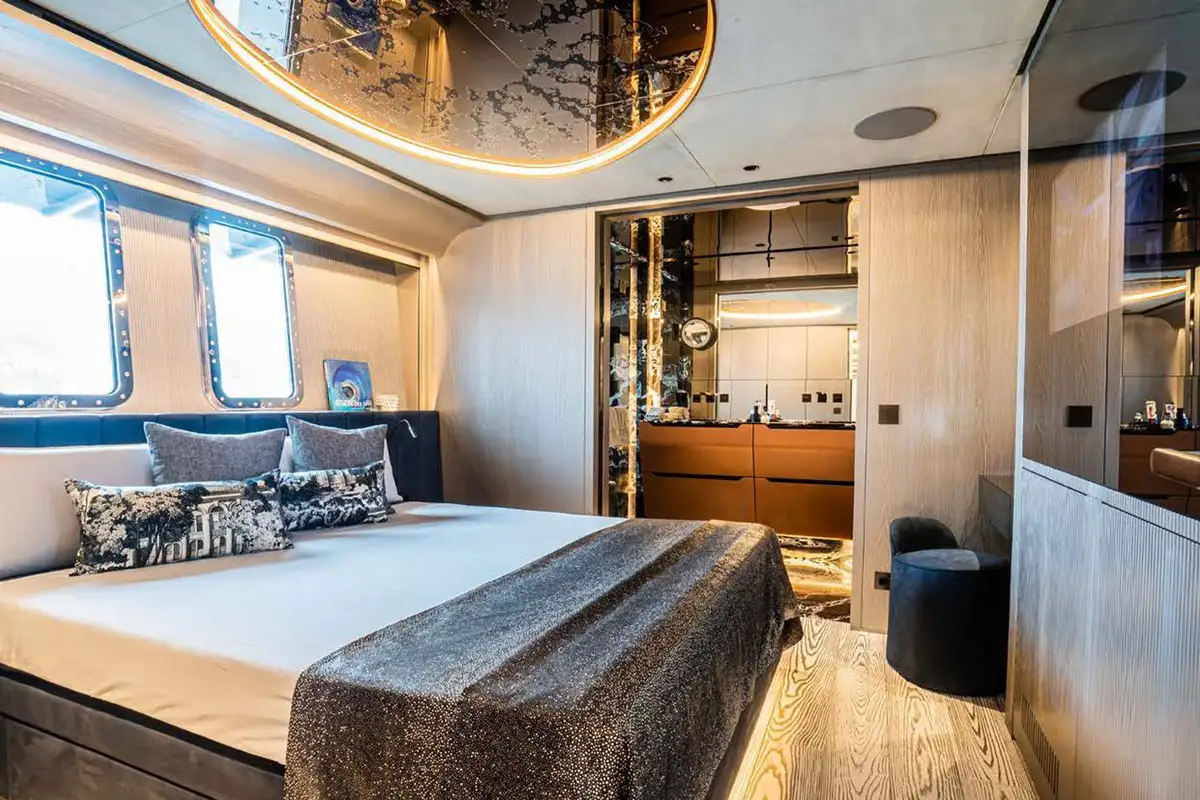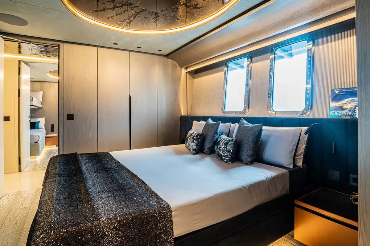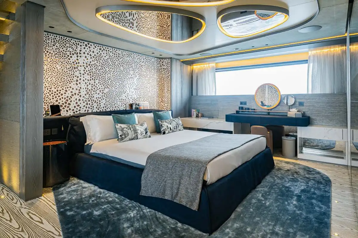 - Main deck master cabin connected to private owner's gym on the upper deck