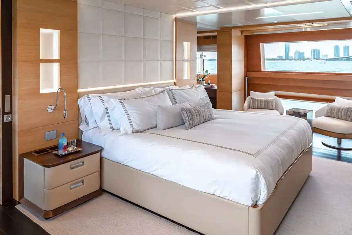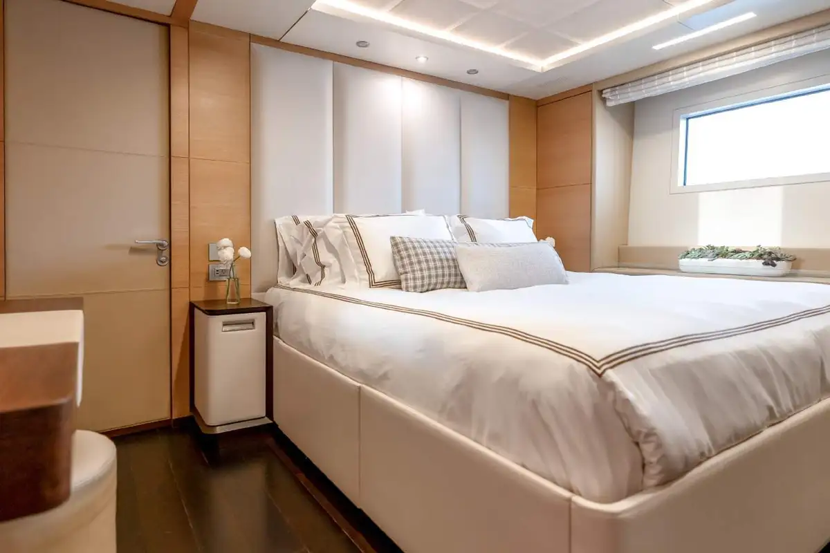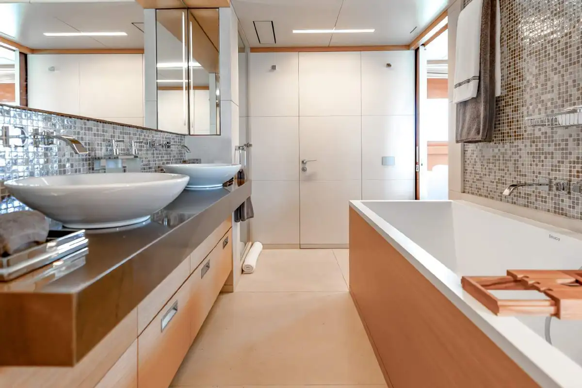 The master is forward and features all the luxuries you could want, including a private office, foldout private balcony, walk-in closet, and a large ensuite with a soaking tub and separate shower. Four guest cabins are below deck and are comprised of two double cabins and two twin cabins, all with their own ensuite.