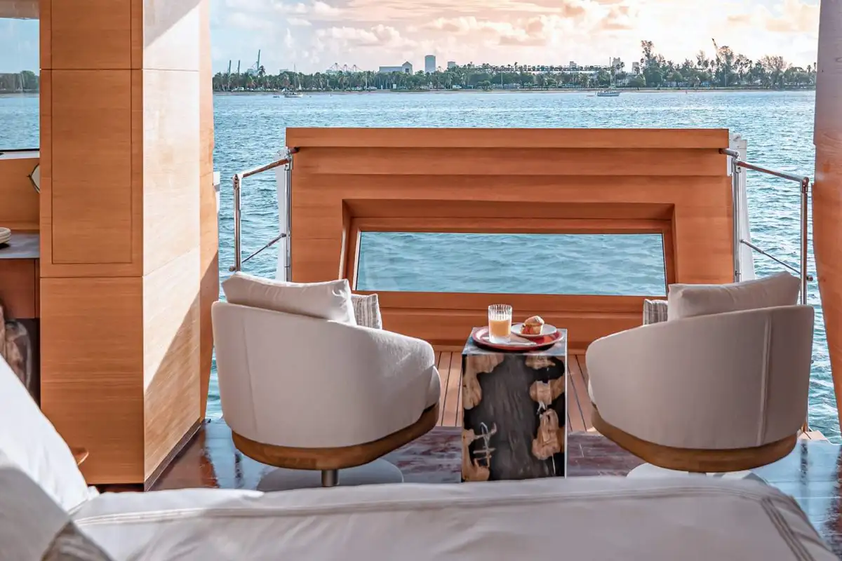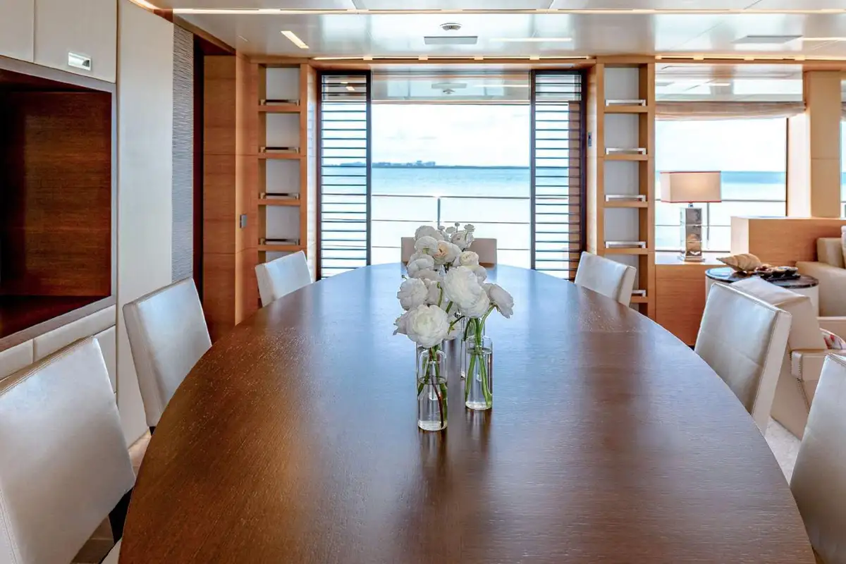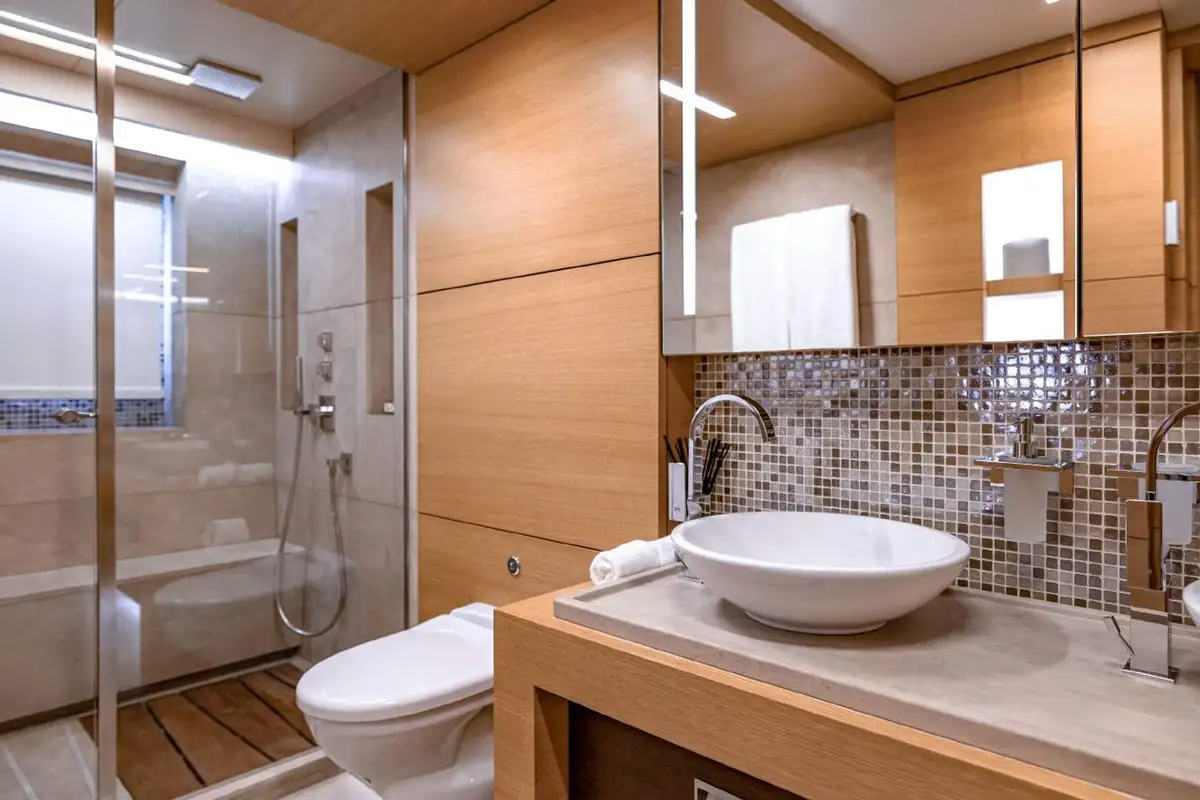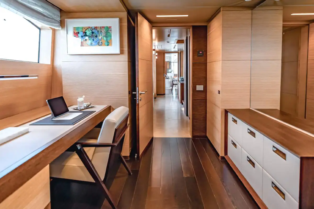 The master is forward and features all the luxuries you could want, including a private office, foldout private balcony, walk-in closet, and a large ensuite with a soaking tub and separate shower. Four guest cabins are below deck and are comprised of two double cabins and two twin cabins, all with their own ensuite.