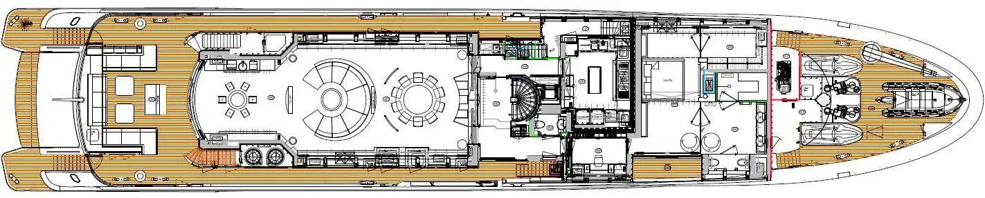 Guests can take the steps aft down to the bridge deck aft for a shaded al fresco lunch or to bask in the sun lounge. At night a large TV flips down from above the table and the sun lounge transforms into an outdoor cinema for movies under the stars. Steps forward lead down to the Portuguese bridge, the perfect place for a sundowner, and there's a foredeck terrace with plenty of space for sun lounging, exercise equipment or entertainment. Guests can enjoy snacks in the main deck aft lounge before heading down to the swim platform to play with all the watertoys.