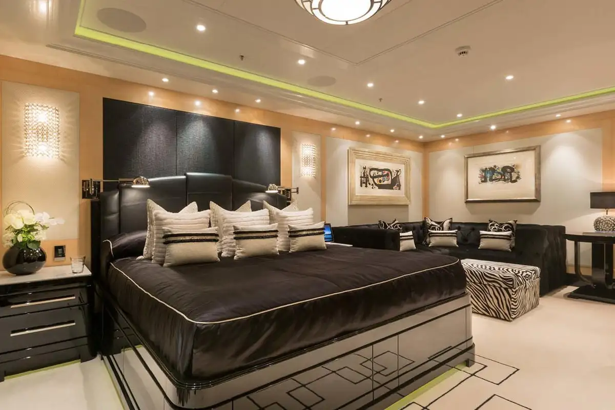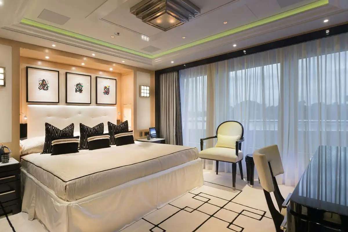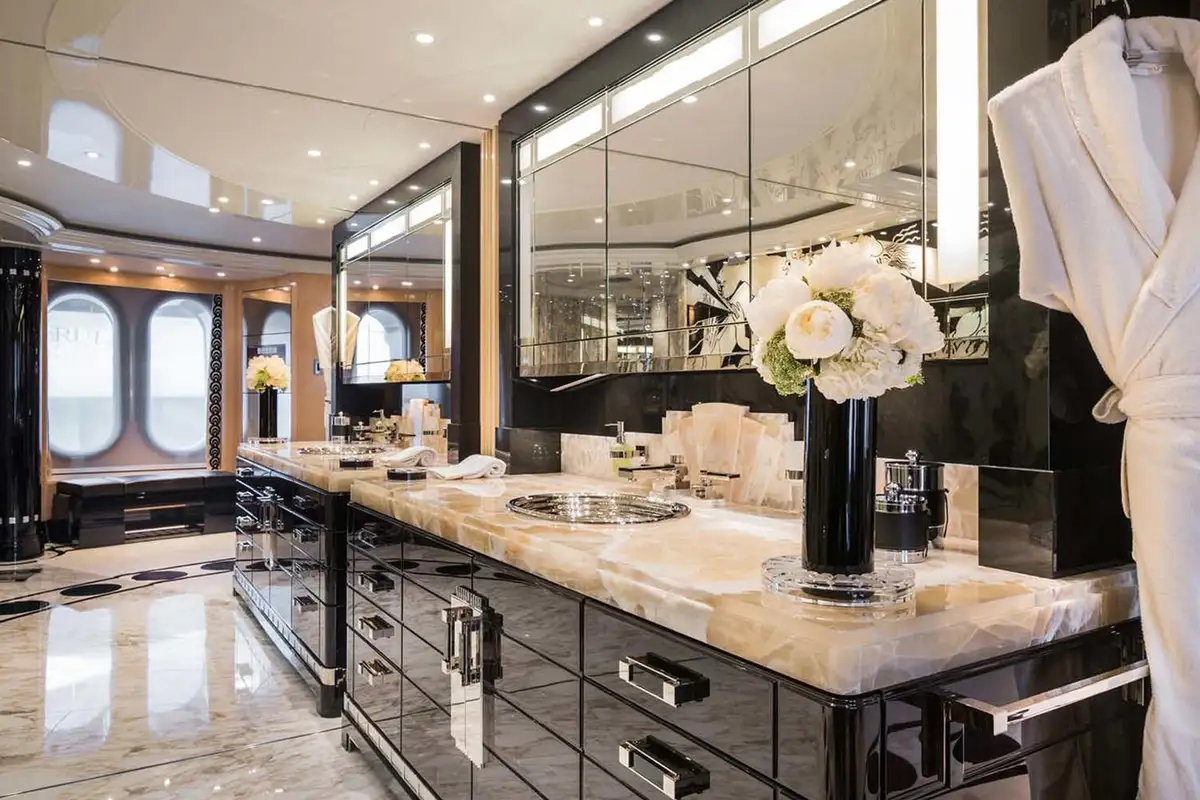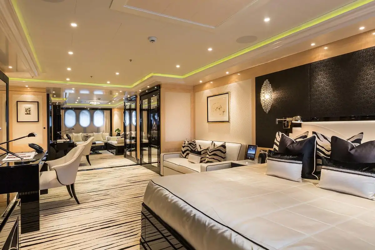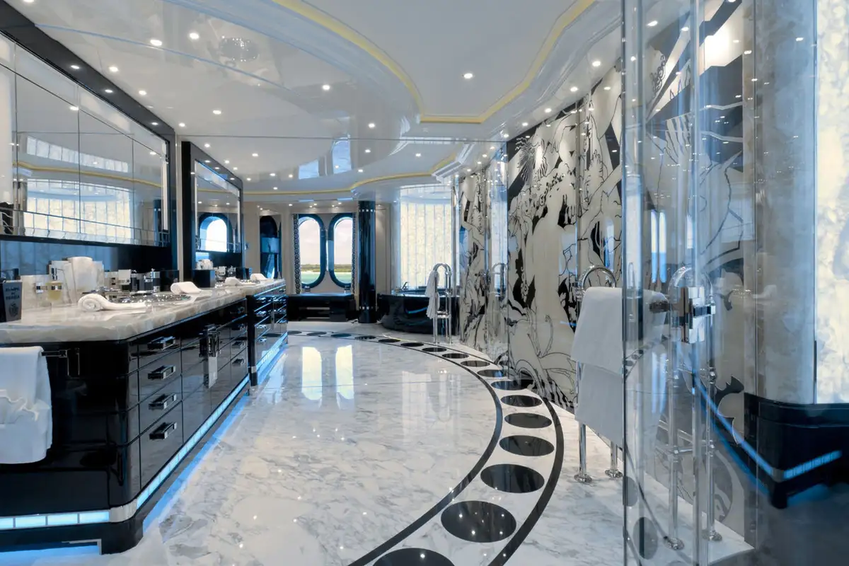 Follow dinner with a movie night in the Radio City Music Hall-style cinema room, with tiered comfortable seating and New York skyscrapers decorating the walls. And when it’s time for bed, the split-level duplex master suite beckons. Located on the main deck, a private glass staircase connects the accommodation to the observation lounge with 180-degree views over the bow and access to a private terrace with spa pool.