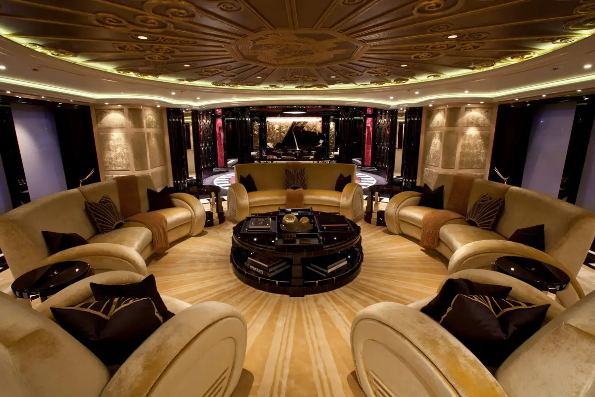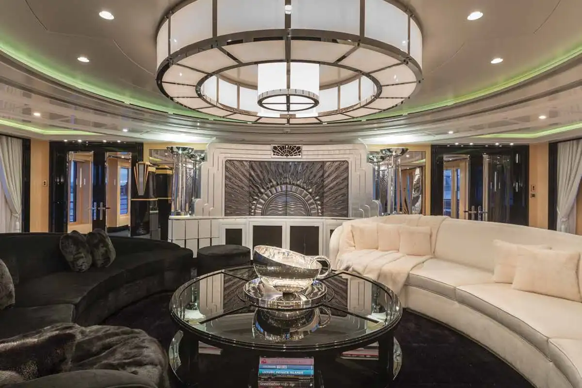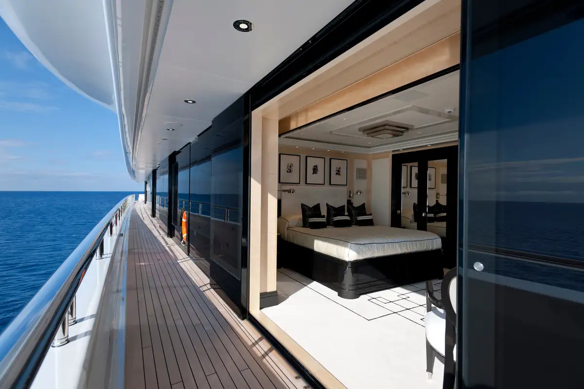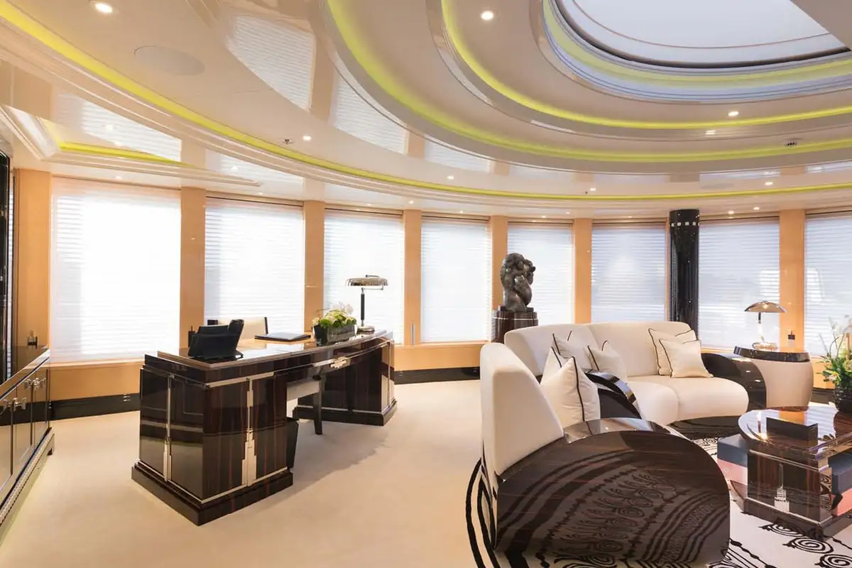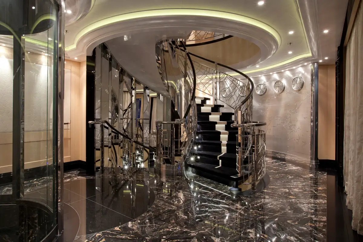 Follow dinner with a movie night in the Radio City Music Hall-style cinema room, with tiered comfortable seating and New York skyscrapers decorating the walls. And when it’s time for bed, the split-level duplex master suite beckons. Located on the main deck, a private glass staircase connects the accommodation to the observation lounge with 180-degree views over the bow and access to a private terrace with spa pool.