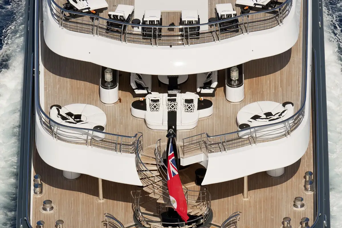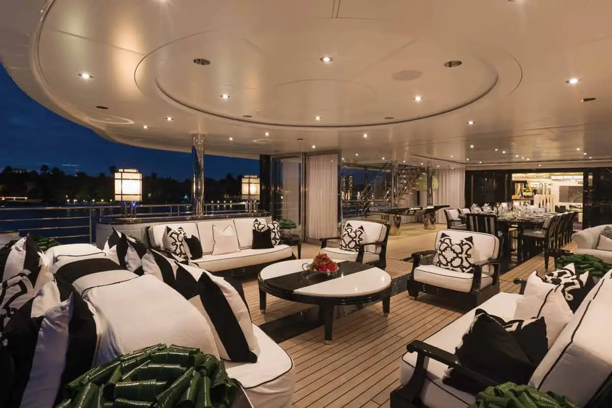 Guests boarding PHOENIX2 from her large beach club will find palatial steps leading up to the main deck, from which further steps spiral up to her upper deck. Here you can enjoy the indoor-outdoor lifestyle in the winter garden: a stunning lounge area and dining room with sliding glass walls so guests can experience dining al fresco or climate controlled comfort should the weather turn.