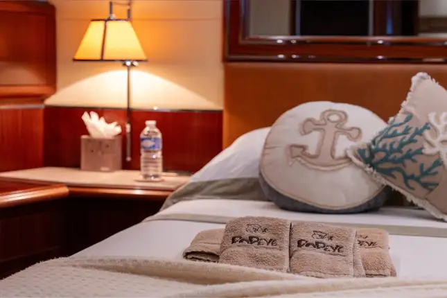 Refitted in 2024, her interiors are bright, contemporary and welcoming, with clean lines and refined finishes throughout. POPEYE accommodates up to 10 guests across four well-appointed en suite cabins, including a full-beam master, a generous VIP, and two twin cabins—each with an additional pullman berth. Air conditioning runs throughout, ensuring comfort at anchor or underway.