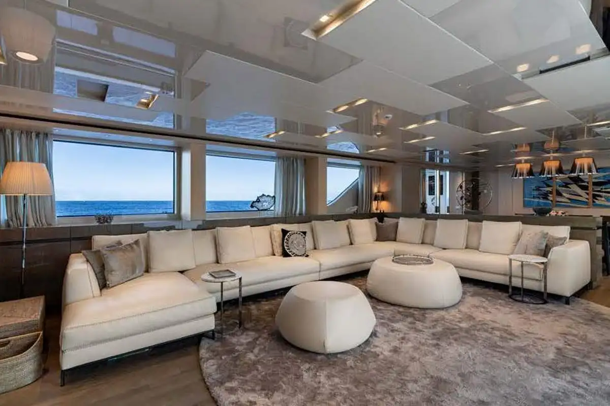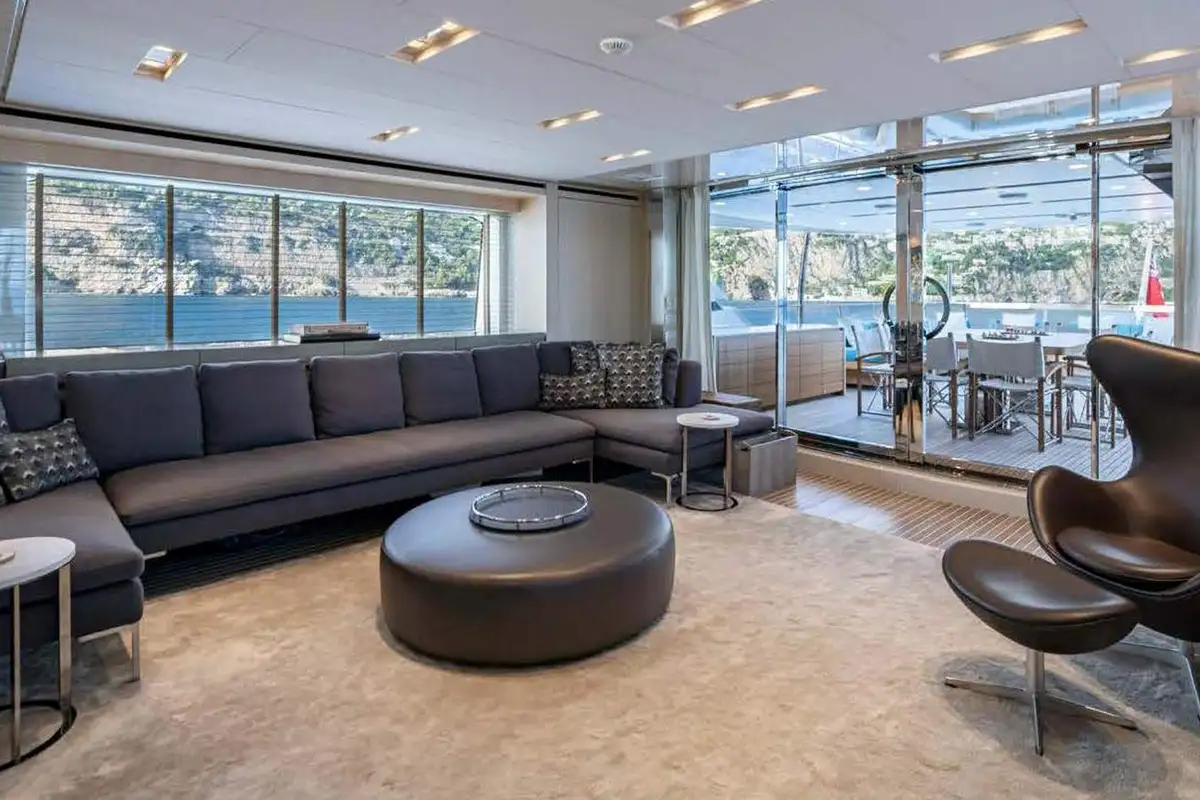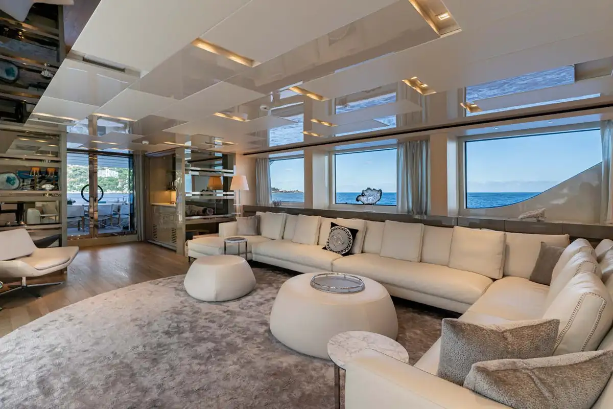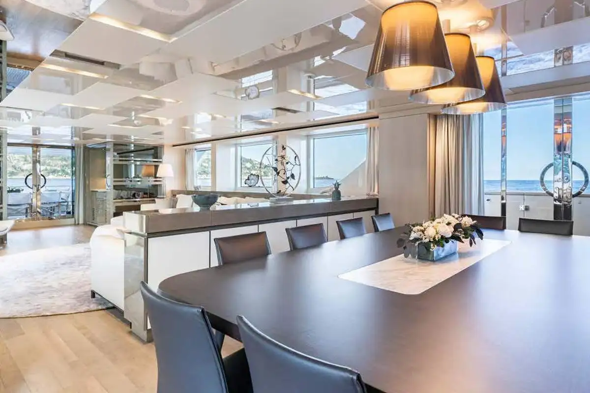 In the lounge, a large L-shaped white leather sofa provides a focal point for relaxed conversation or quiet time, with natural light pouring through expansive windows. The interior is crisp and inviting. White walls, high-gloss finishes and solid wood flooring define the main deck. A few steps forward, the formal dining area awaits – perfectly suited for refined meals and fine dining.