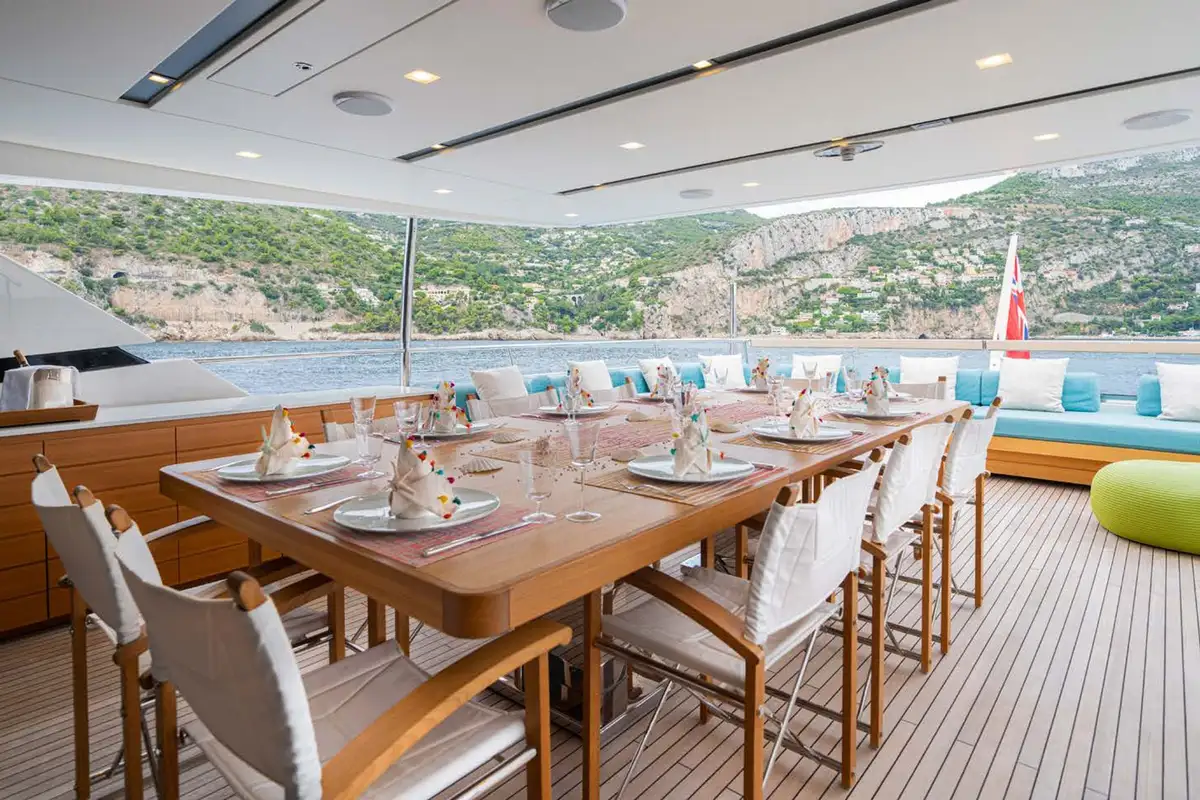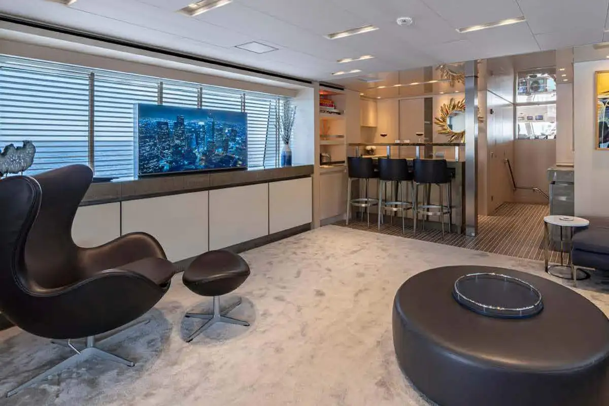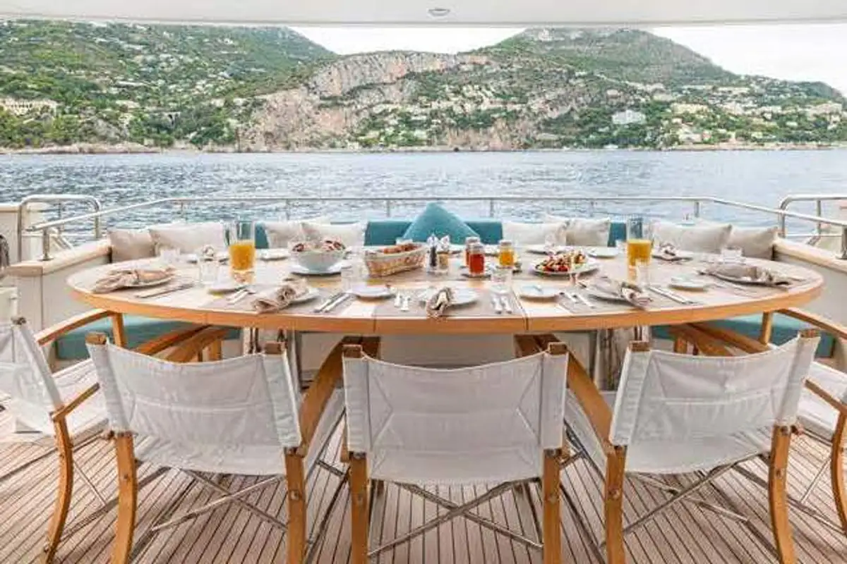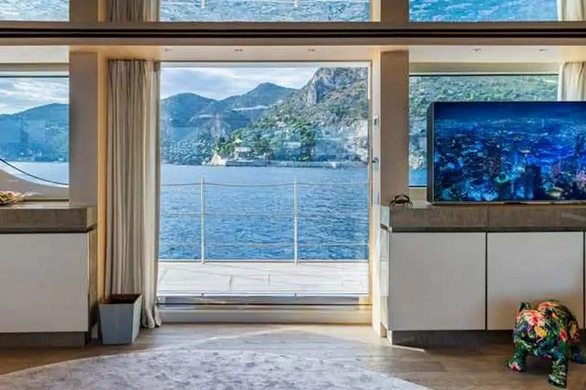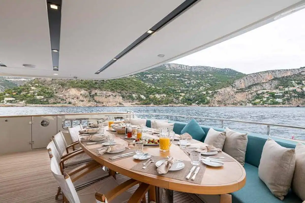 In the lounge, a large L-shaped white leather sofa provides a focal point for relaxed conversation or quiet time, with natural light pouring through expansive windows. The interior is crisp and inviting. White walls, high-gloss finishes and solid wood flooring define the main deck. A few steps forward, the formal dining area awaits – perfectly suited for refined meals and fine dining.