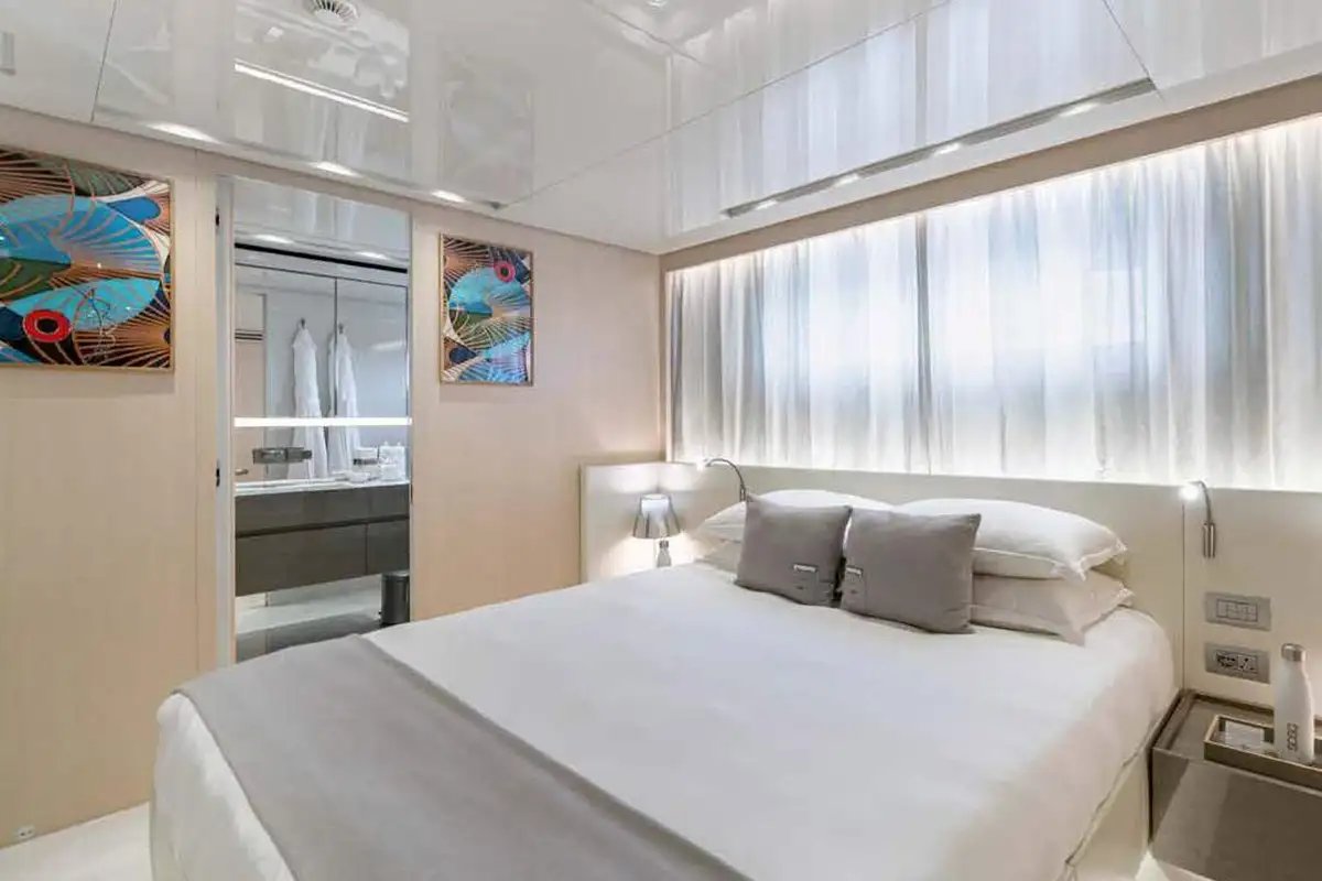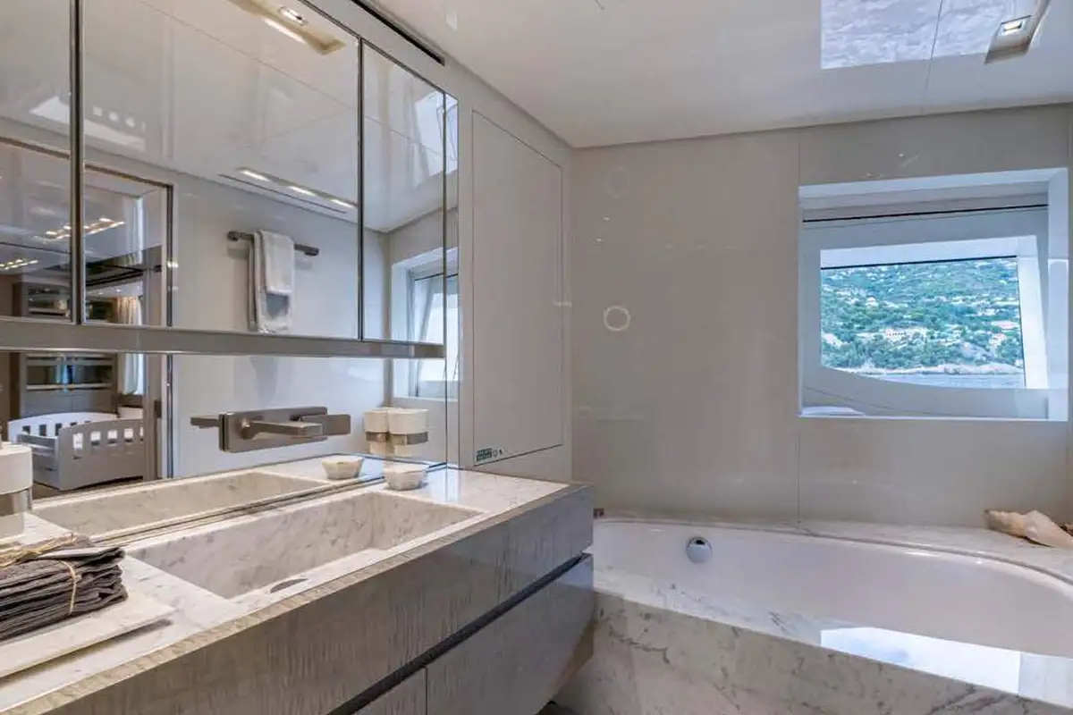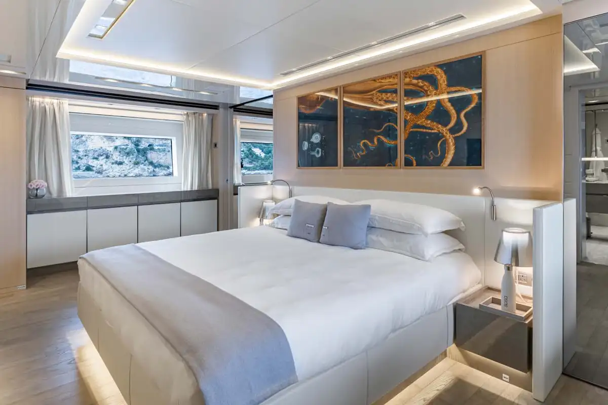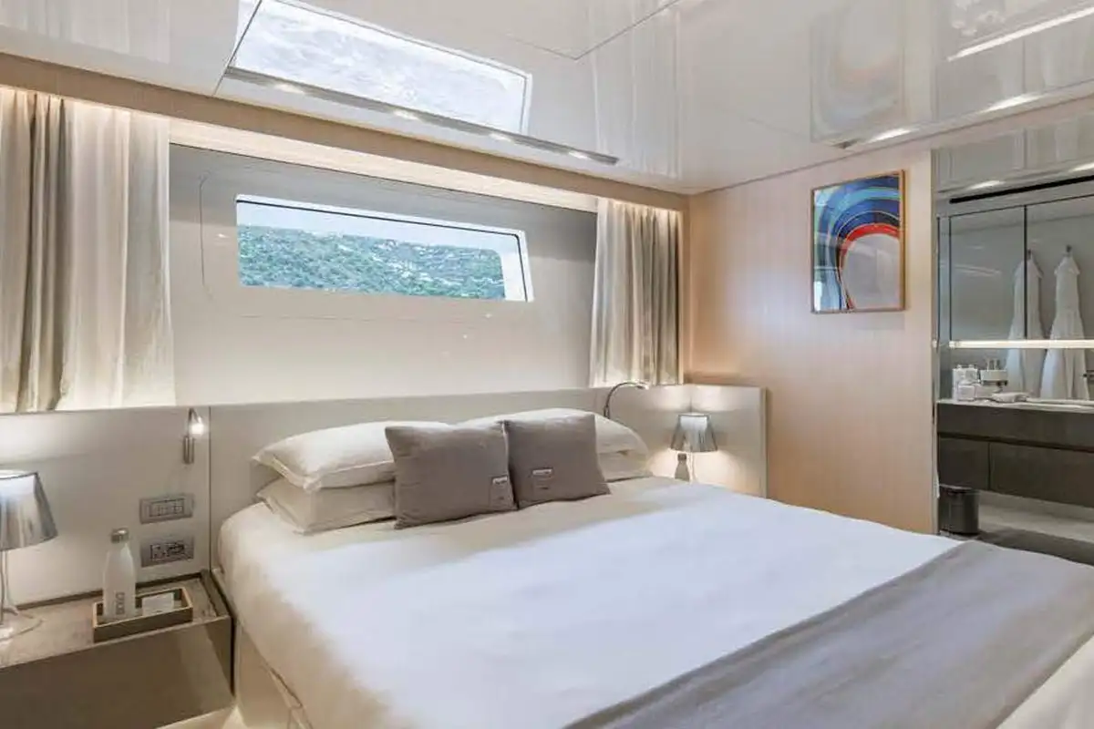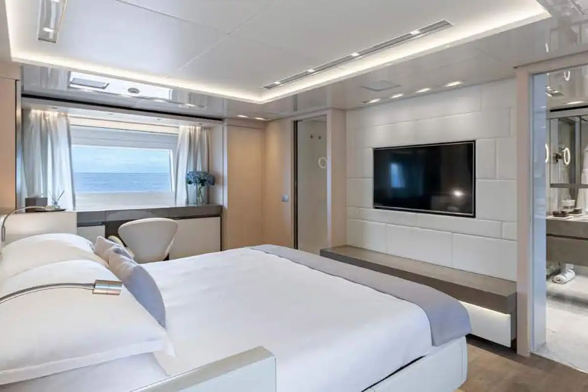 Accommodation aboard PREMURA is designed with comfort and privacy in mind. The main deck master suite is a peaceful retreat filled with light and finished in soft tones. A dressing table, forward-facing bed and generous picture windows make it a space to spend time in, not just sleep. The en suite bathroom features separate his and hers areas connected by a marble-lined shower.