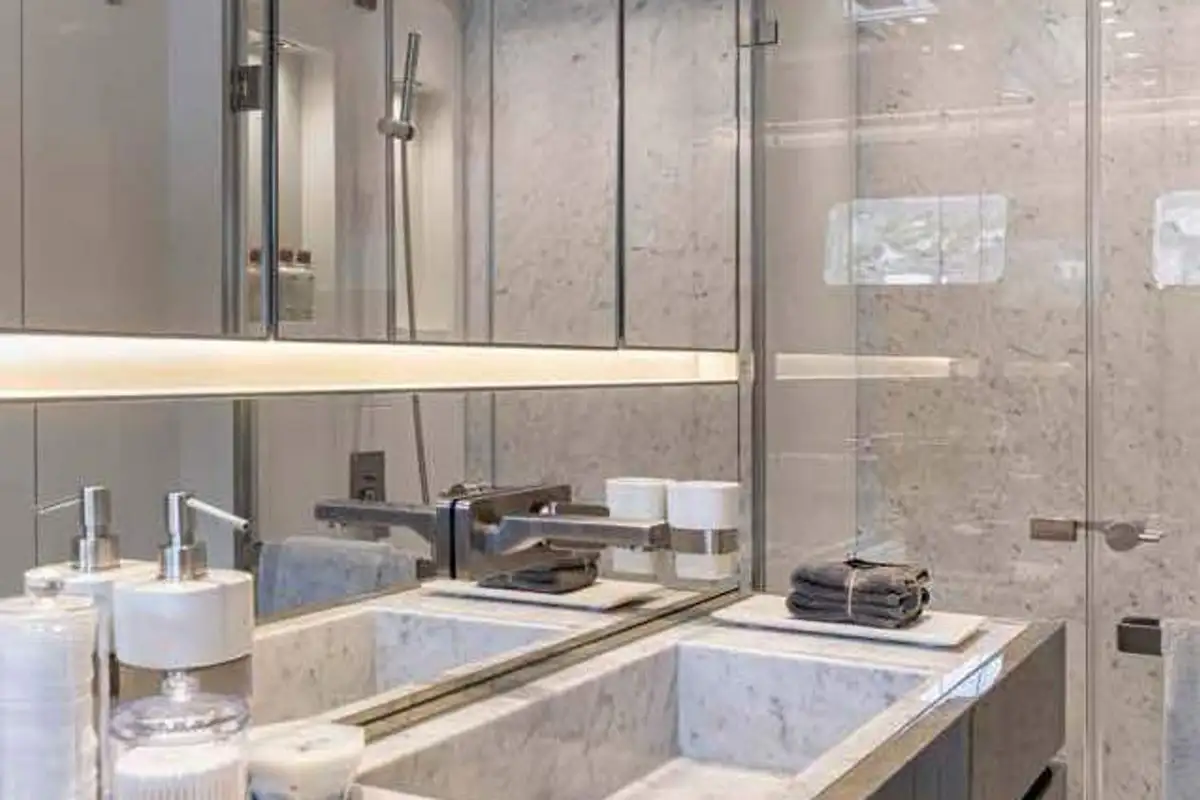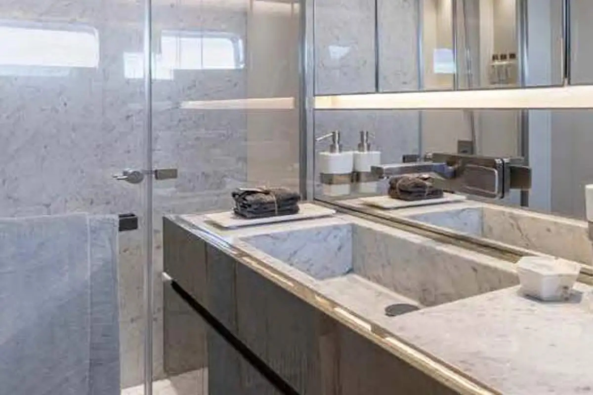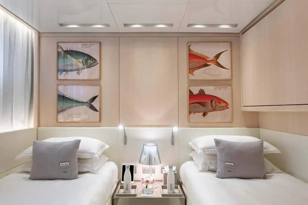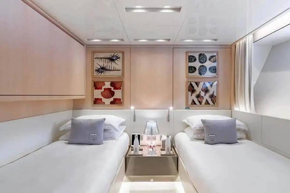 On the lower deck, mirrored double suites with inboard-facing berths and dedicated dressing tables provide elegant guest accommodation, each with its own en suite and walk-in shower. Two twin-berth suites with pullman berths complete the guest suites, which are ideal for children, families, or friends.