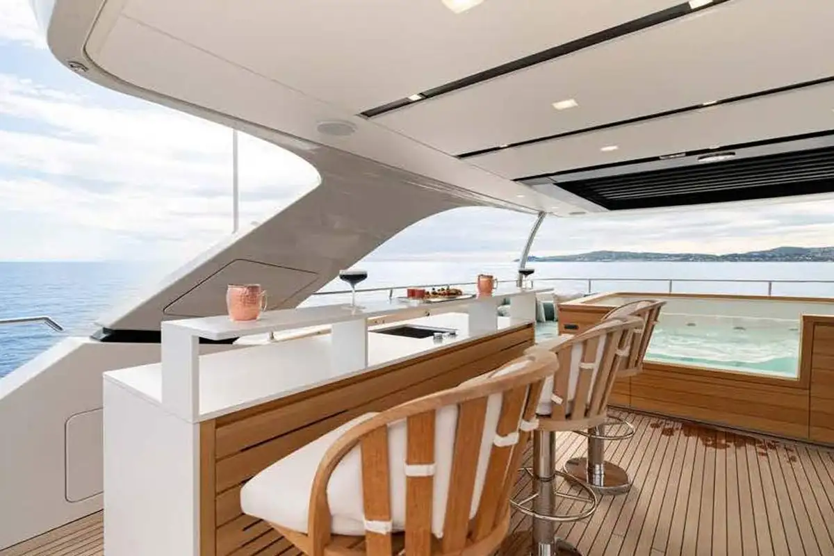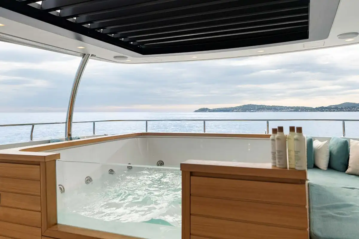 PREMURA’s layout is equally well considered. The upper deck sky lounge offers a chic, relaxed atmosphere with a cocktail bar and a long sofa. It flows seamlessly out to the al fresco dining area with full-beam aft seating to the rear. Above, the sun deck is equipped with sunloungers, a jacuzzi with a retractable hardtop, and an outdoor cinema – the area lends itself to slow afternoons and long evenings under the stars.