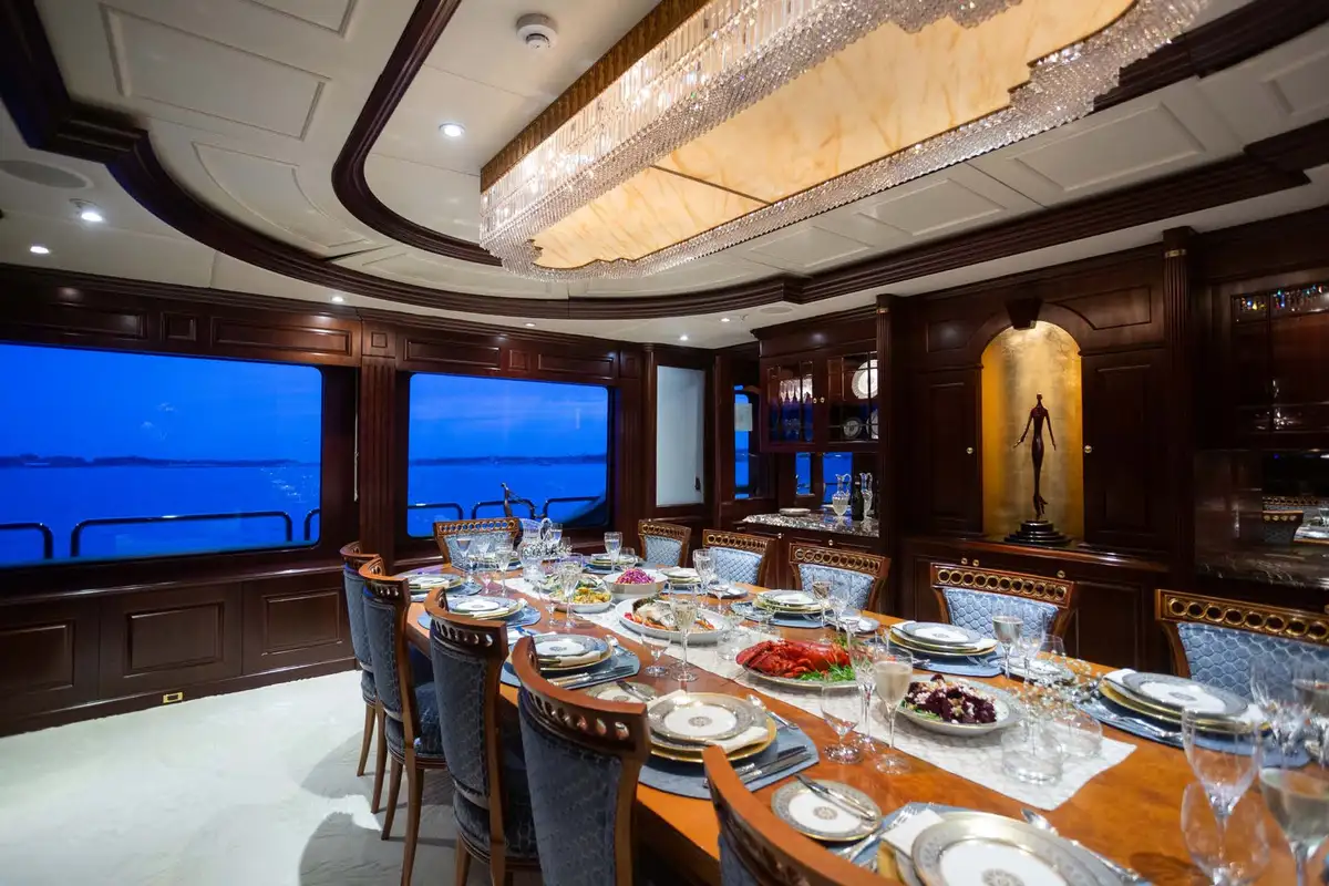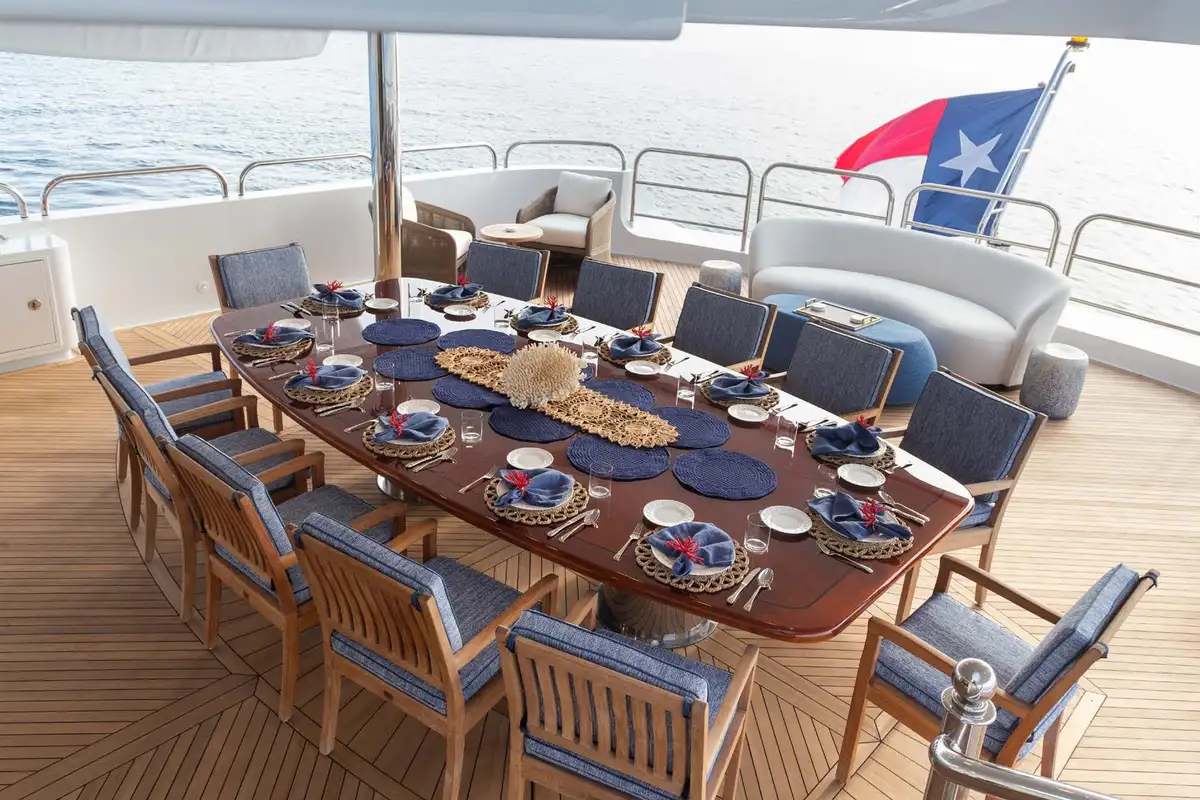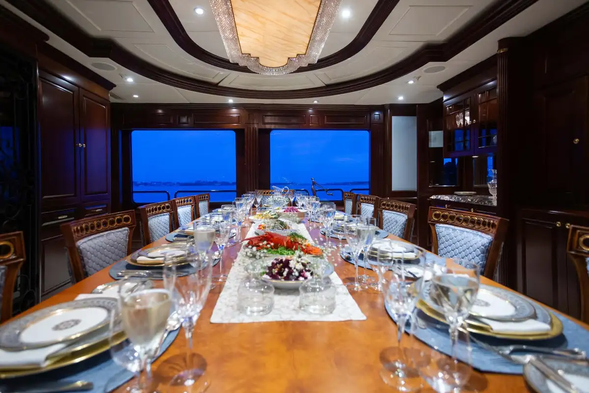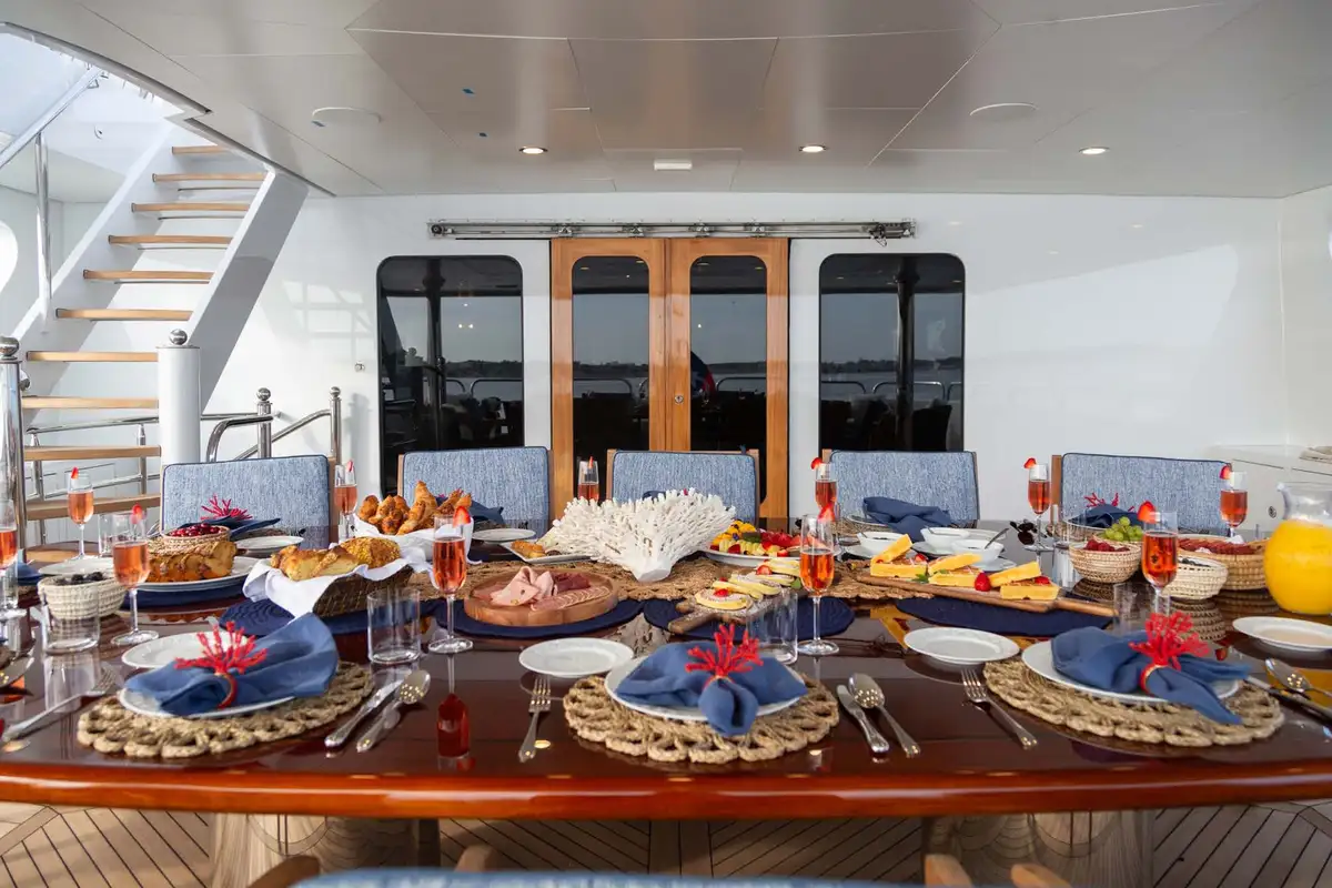 After all that activity, it must be time for some food. Where better to enjoy it than in the al fresco dining area on the upper aft deck? Shaded from the sun, it’s a beautiful area to enjoy brunch, lunch, or an evening banquet. Although the dining room on the main deck may be more appropriate for formal dining, separate from the lounge and other areas, it can be enclosed for greater privacy, making dining as intimate as you’d like it to be.