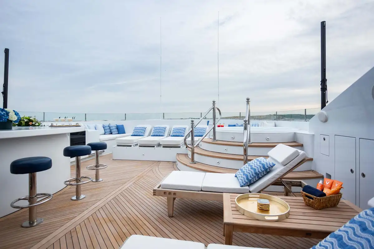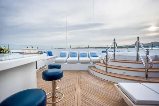 Make time to unwind in the lounges. On the main deck is the al fresco lounge area in the cockpit or the main saloon inside. Whether you want to watch TV, practice the piano or catch up with friends or family in the main saloon, its large windows and light furnishings create a wonderful atmosphere. On the upper deck, the sky lounge has a bar area, games table, sofa, and arm seating facing a hidden TV. Movie lovers will love the outdoor cinema on the sun deck, with a bar close by.