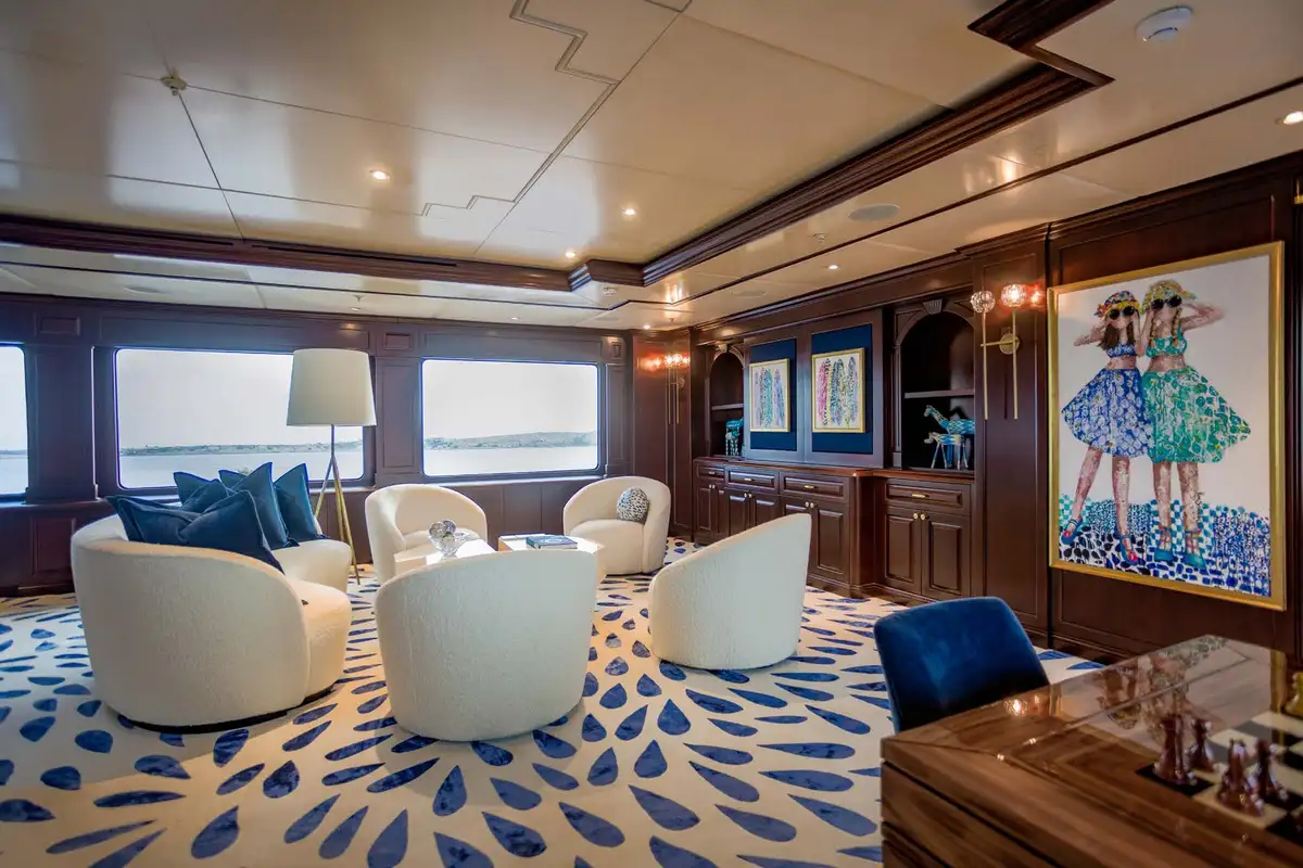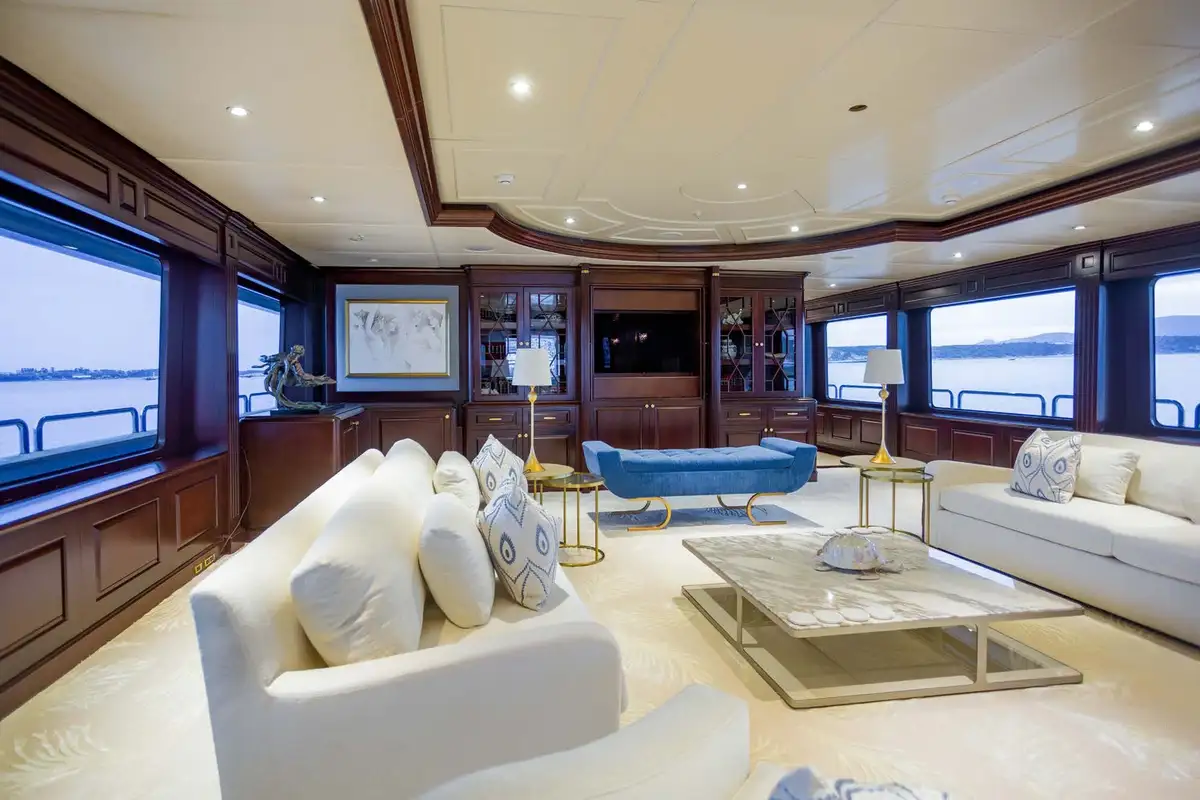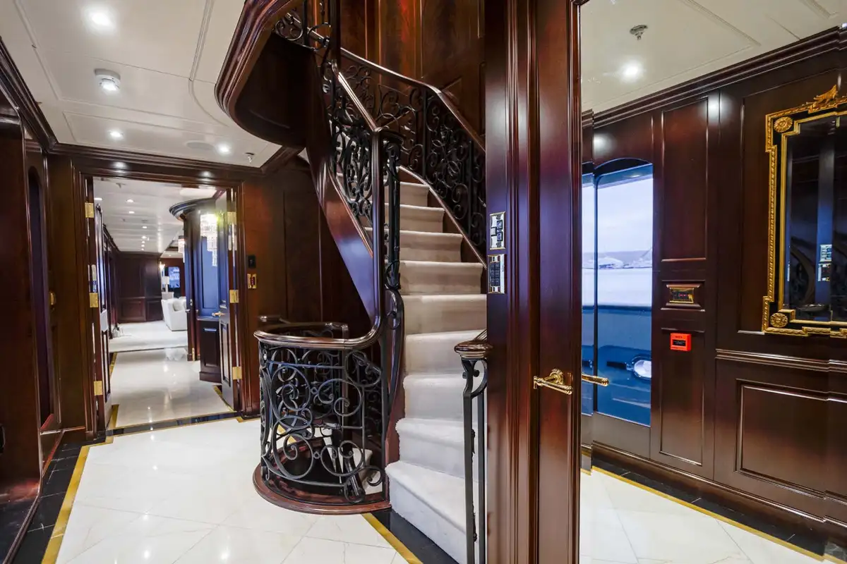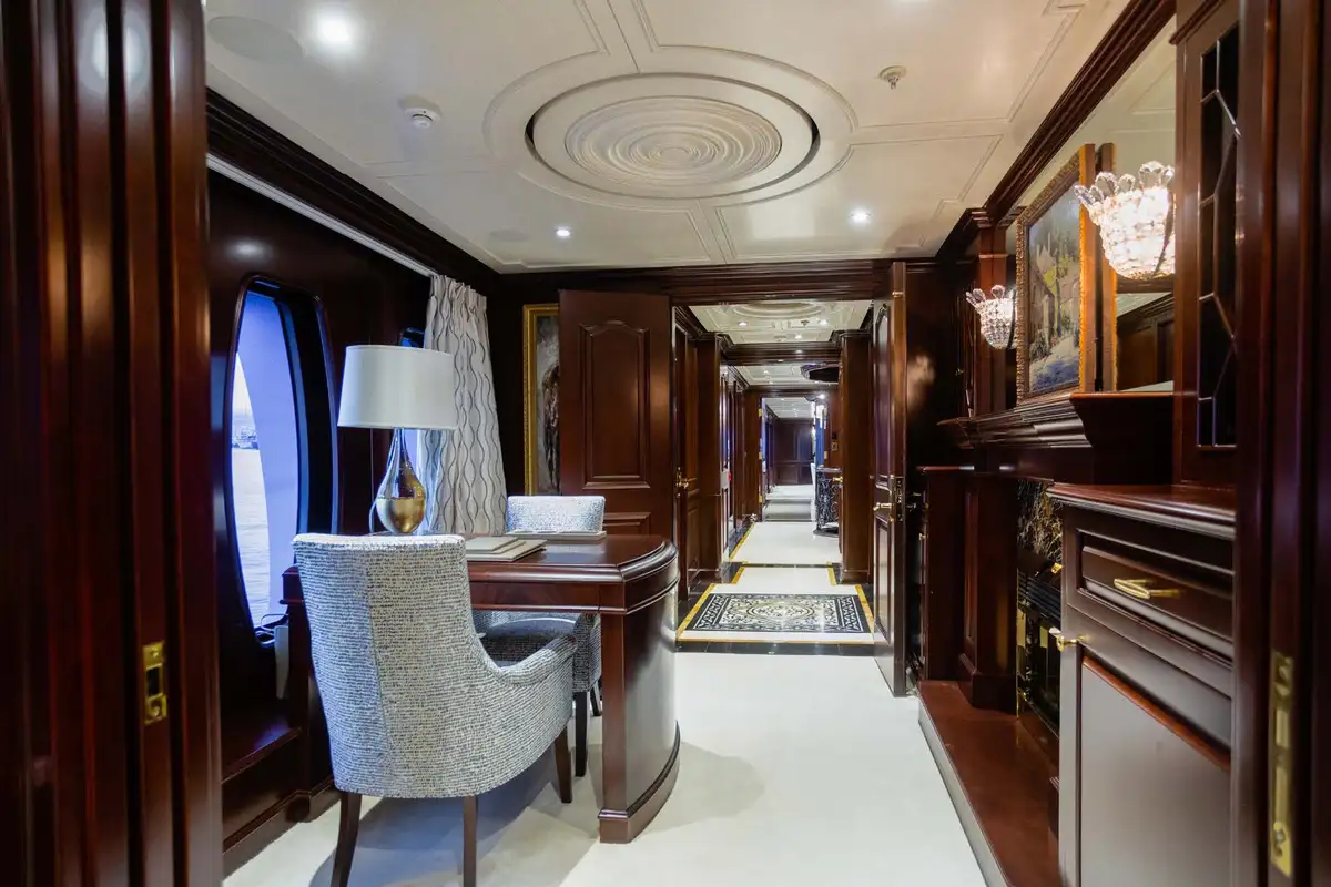 Her interior radiates class: mahogany panelling, fluted pilasters, and signs of quality and workmanship throughout. She is simply stunning with her new carpets, furnishings, and furniture.