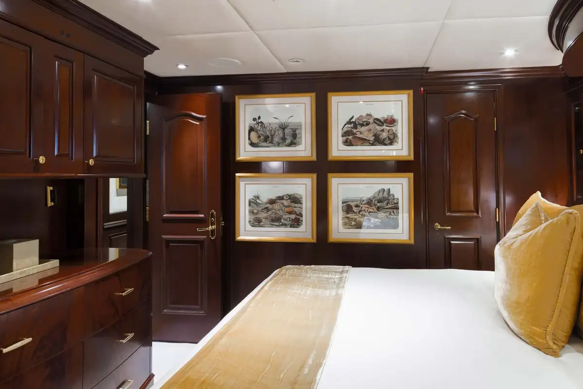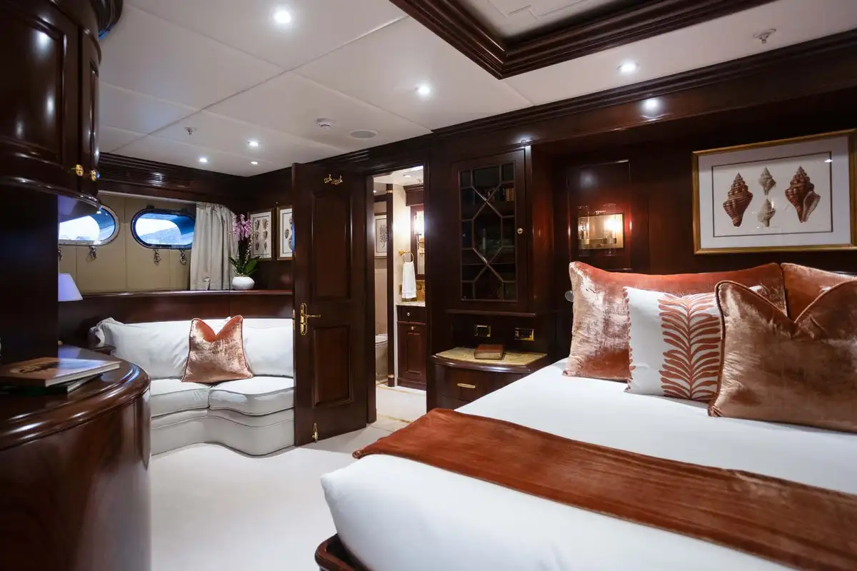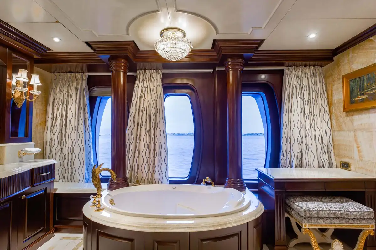 The delightful full-beam main master suite is on the main deck. It features a private office, lounge area and spacious en suite bathroom with a large bath. There’s a second full beam master on the lower deck, a double VIP suite, a twin-berth suite and three double suites.