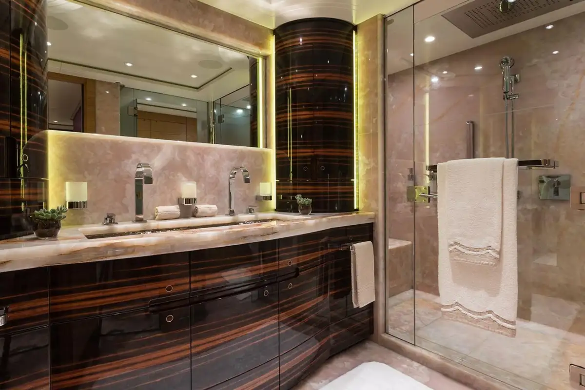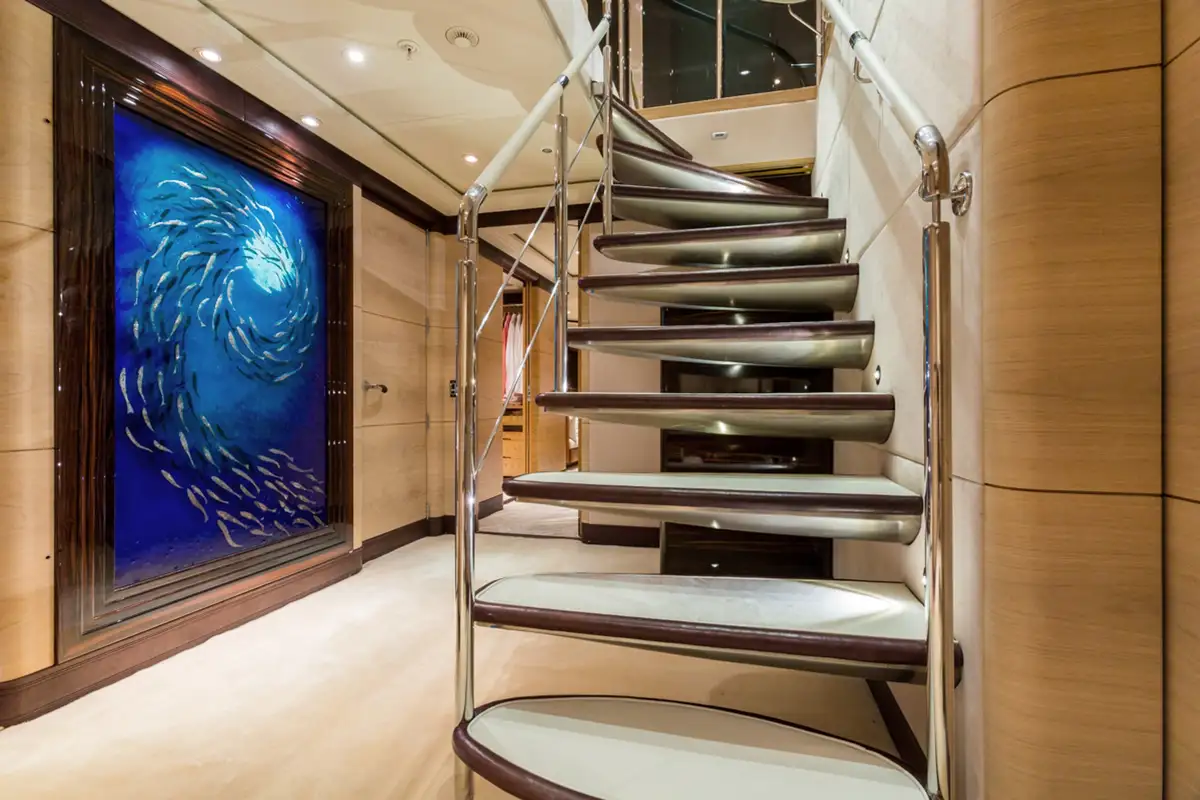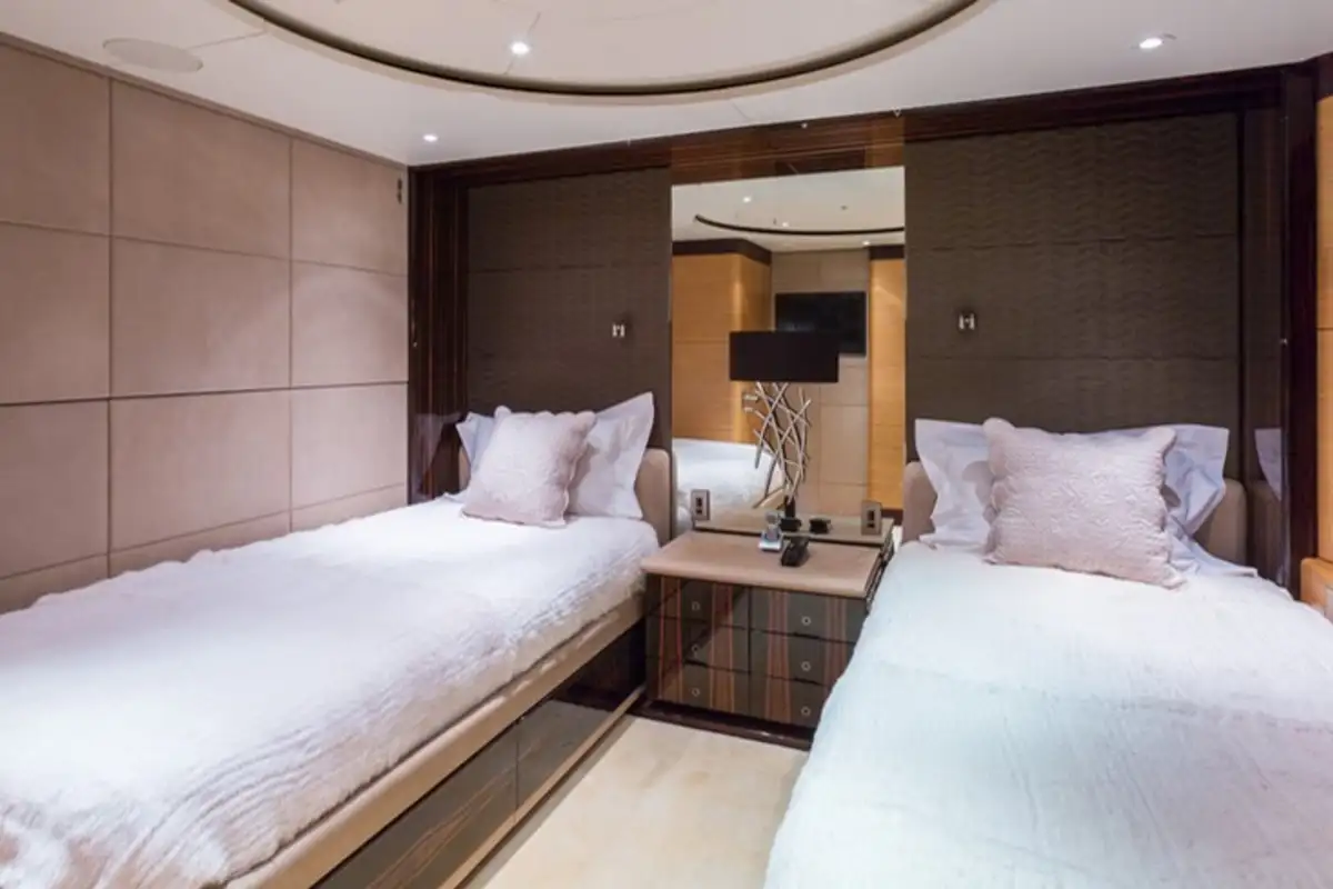 Below on the lower deck is accommodation for 10/12 guests across five luxurious staterooms consisting of a full beam master suite, two doubles, and two twins each with a Pullman berth.