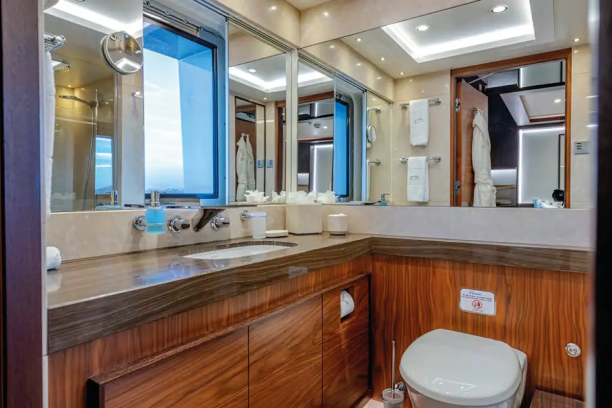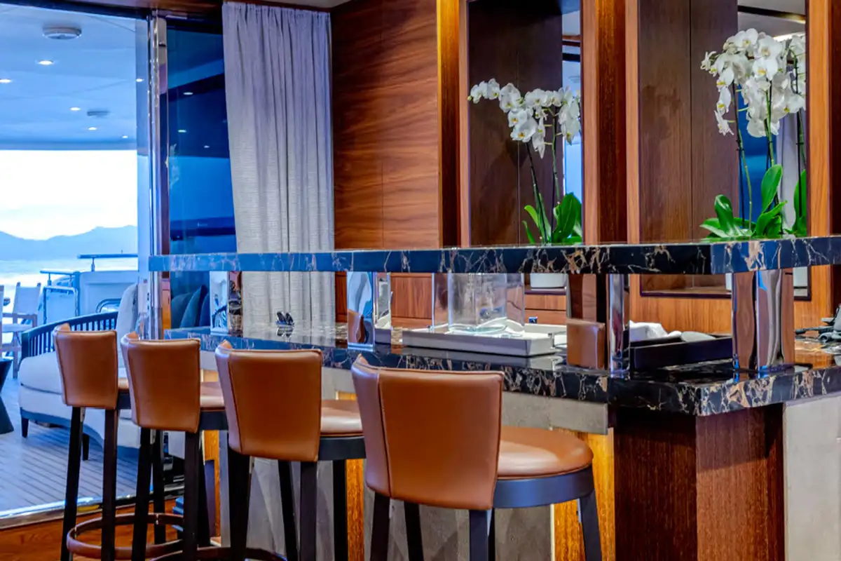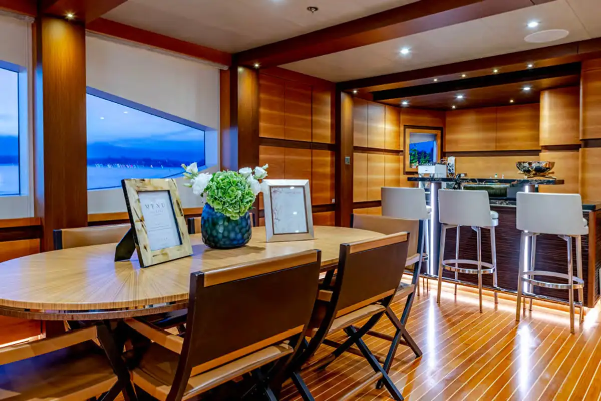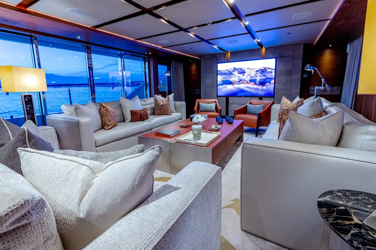 The sun deck is the ultimate place for socialising. Unwind in the glass-fronted jacuzzi or on the loungers, or sip cocktails in the lounge area serviced by a bar. In the evenings, retire to the main deck lounge which comes complete with a cinema screen for catching up on the latest Hollywood movies, or spend time in the upper saloon which is seamlessly connected to the outdoor decks.