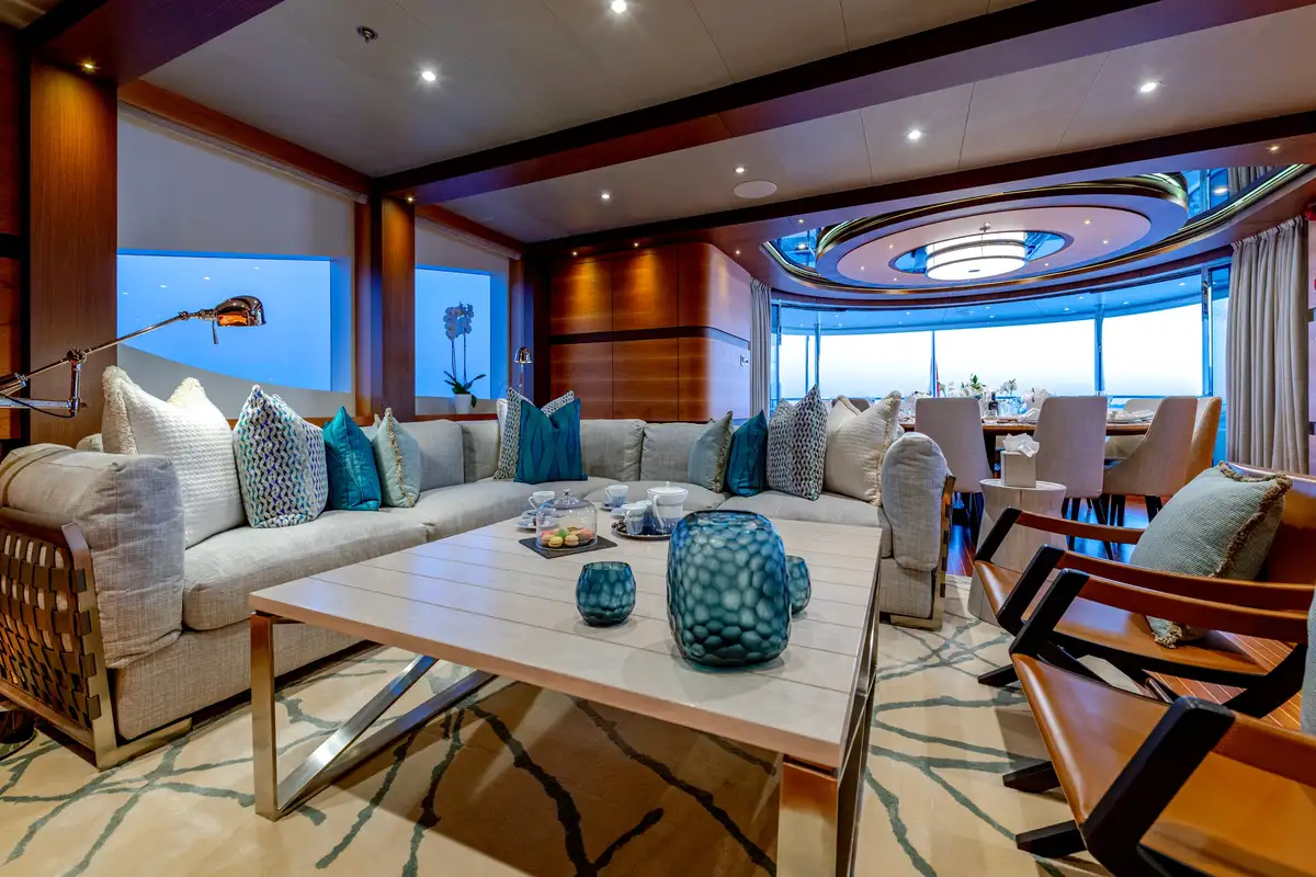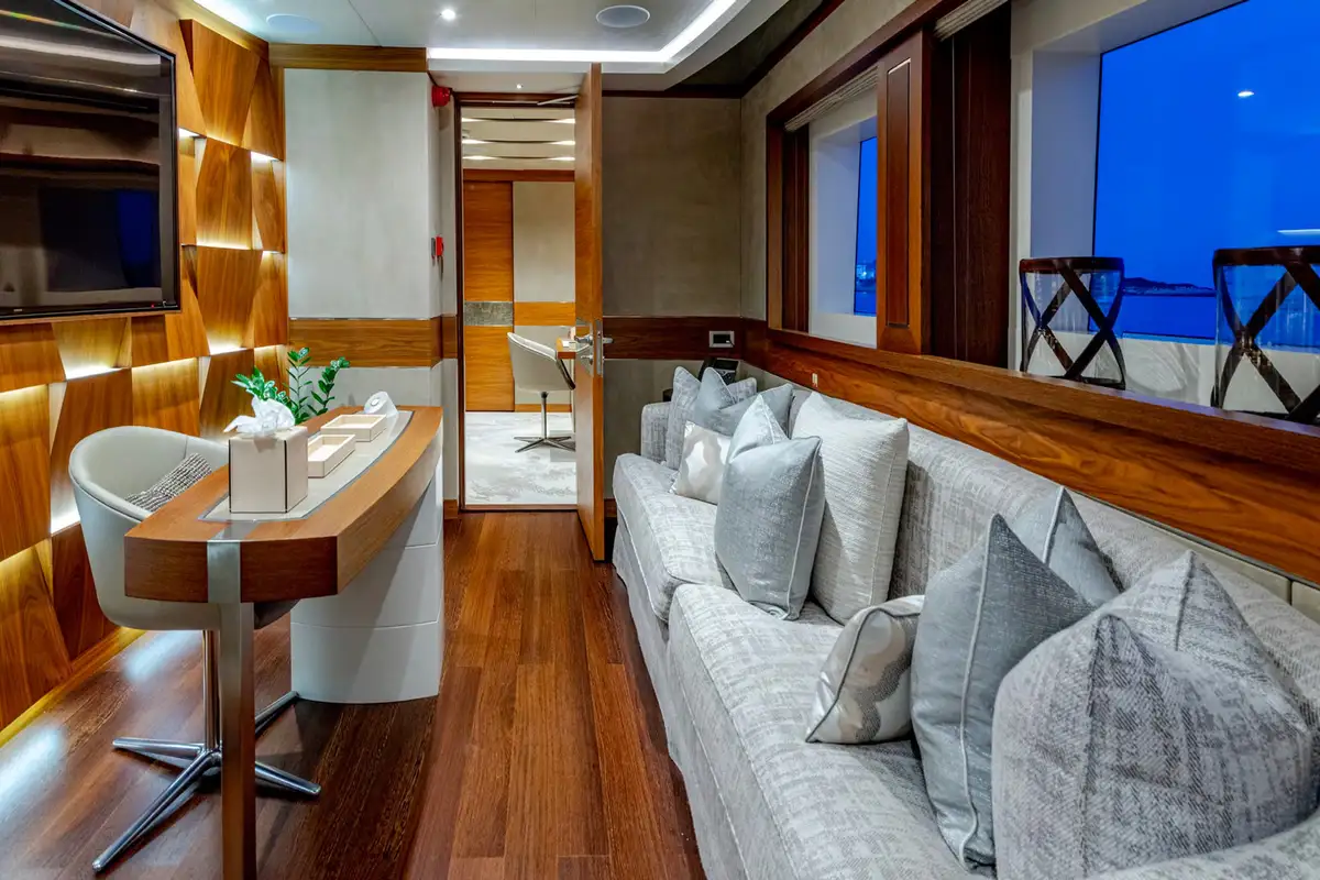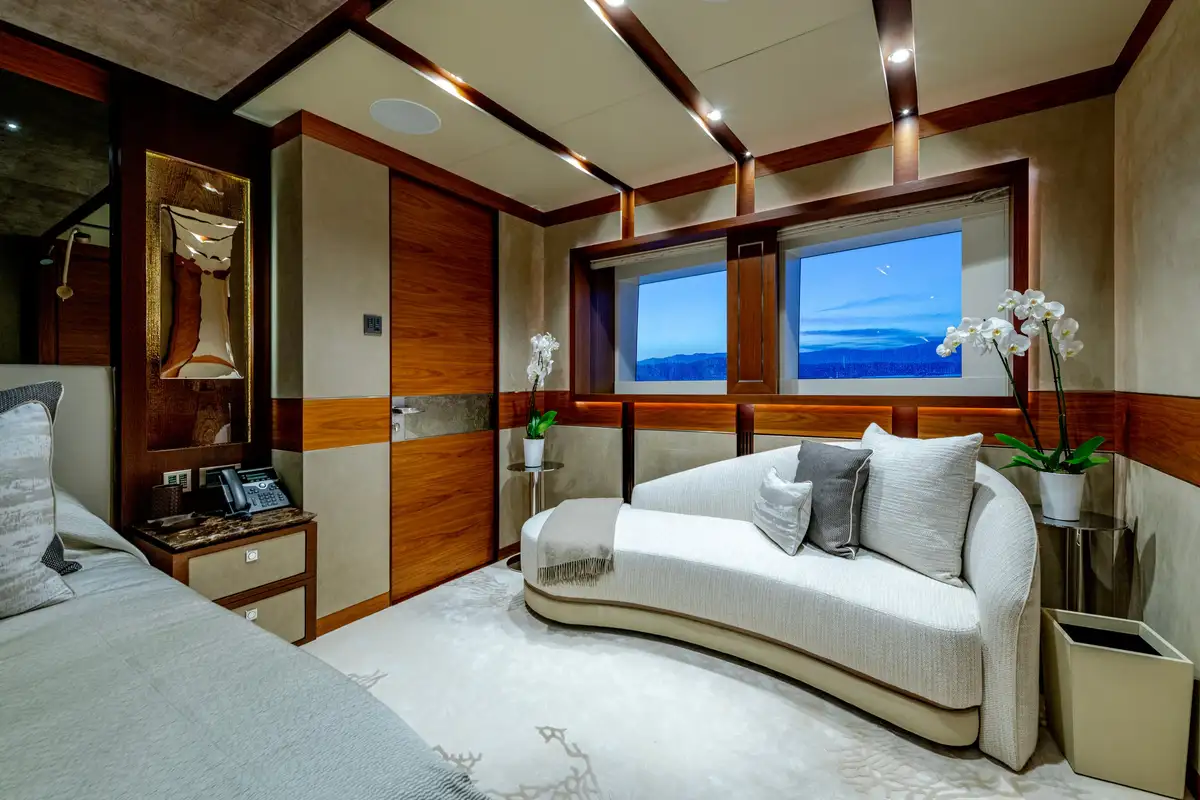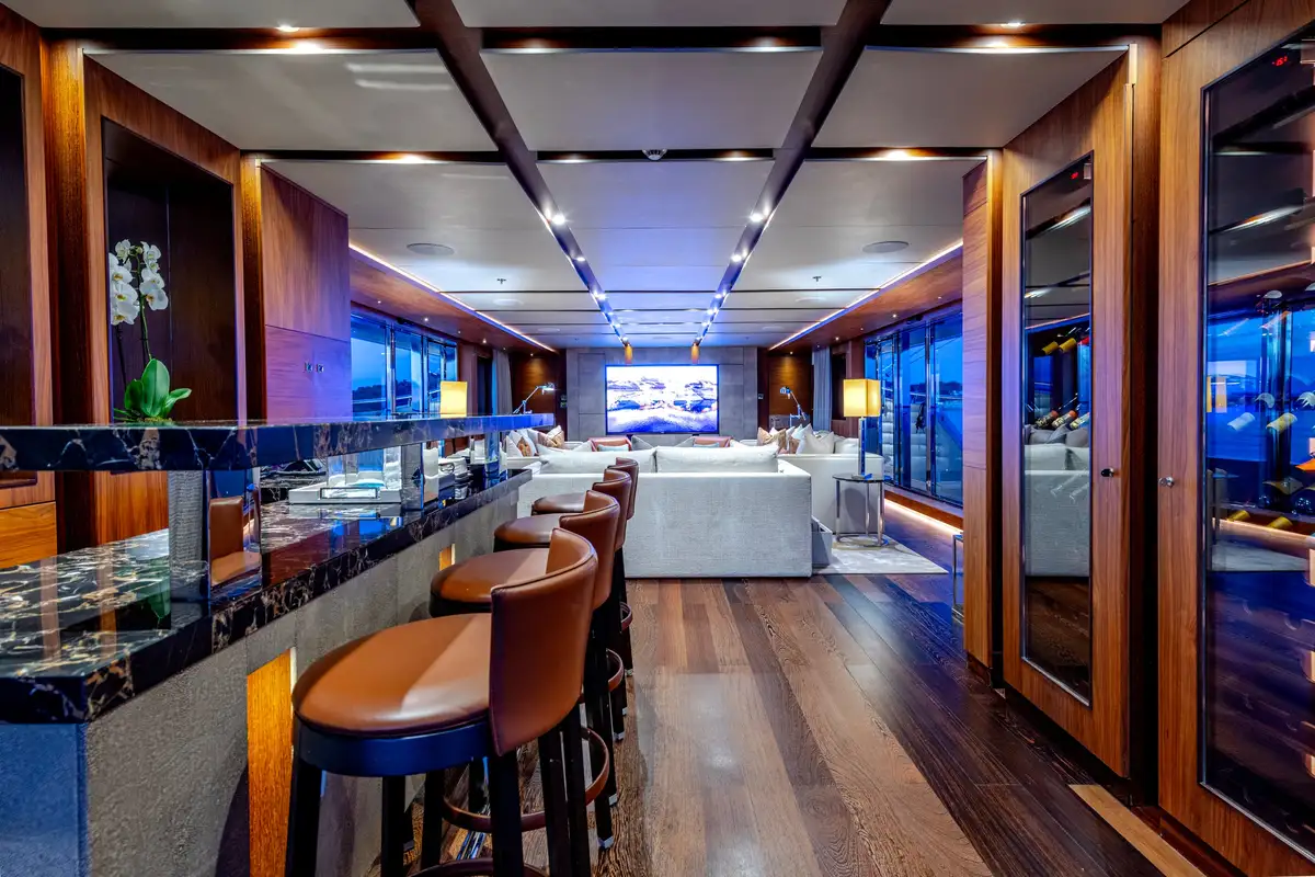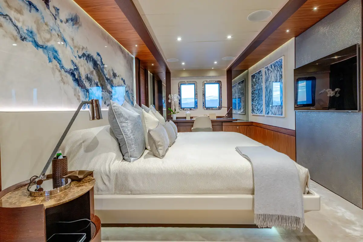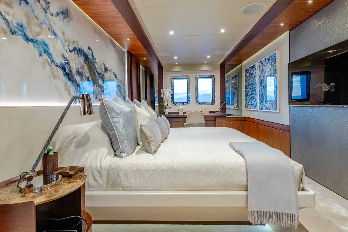 Designed for multiple family use, QUASAR offers flexible accommodation for up to 12 guests across six comfortable cabins. An innovative layout features two master cabins, the first of which can be found on the main deck and boasts a private office, while the second is on the lower deck and enjoys a private lounge.
