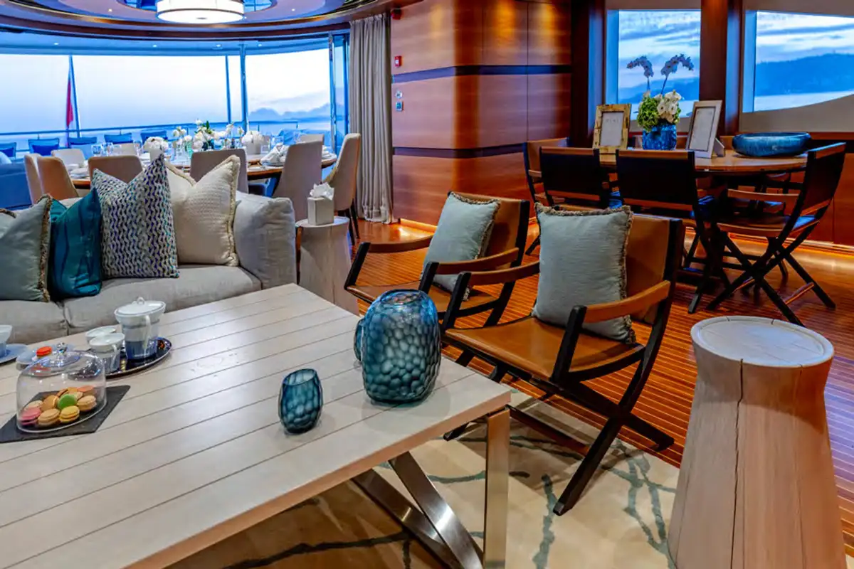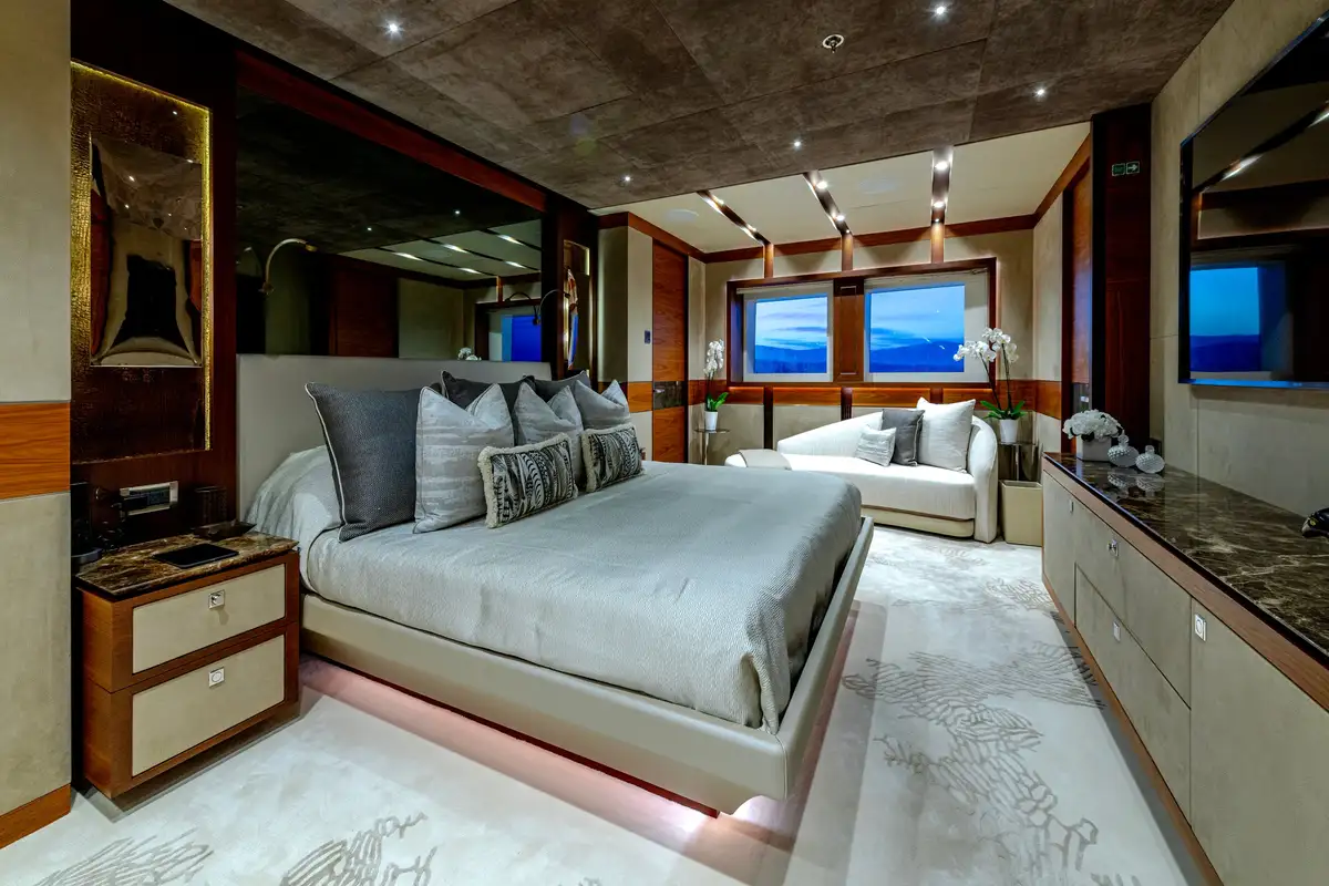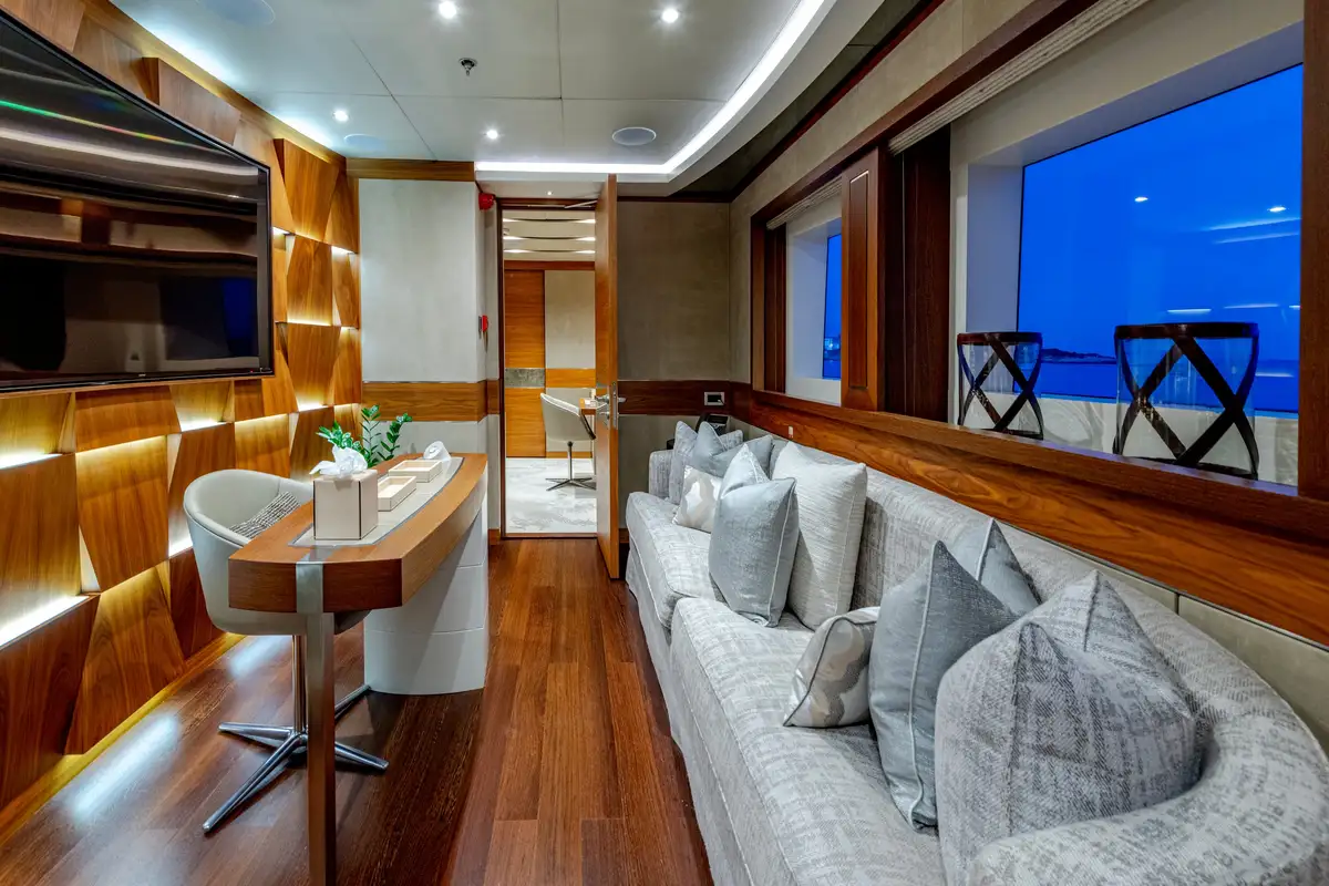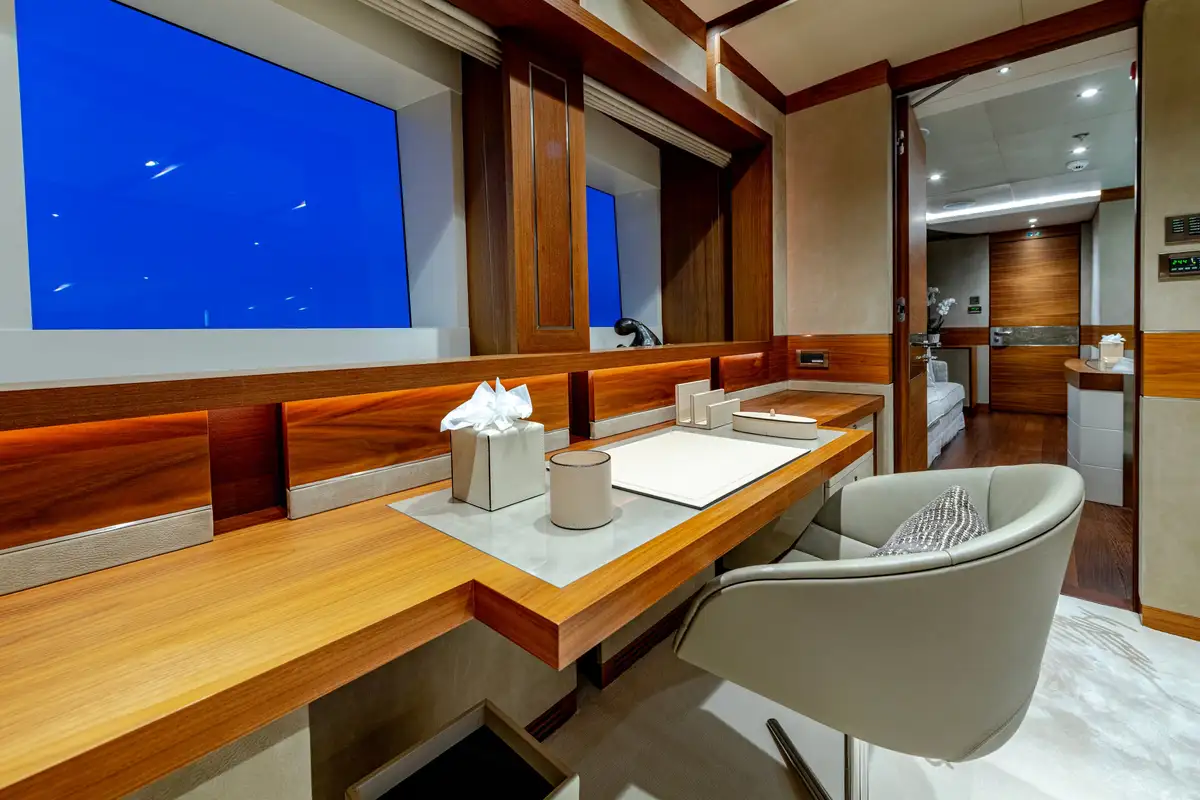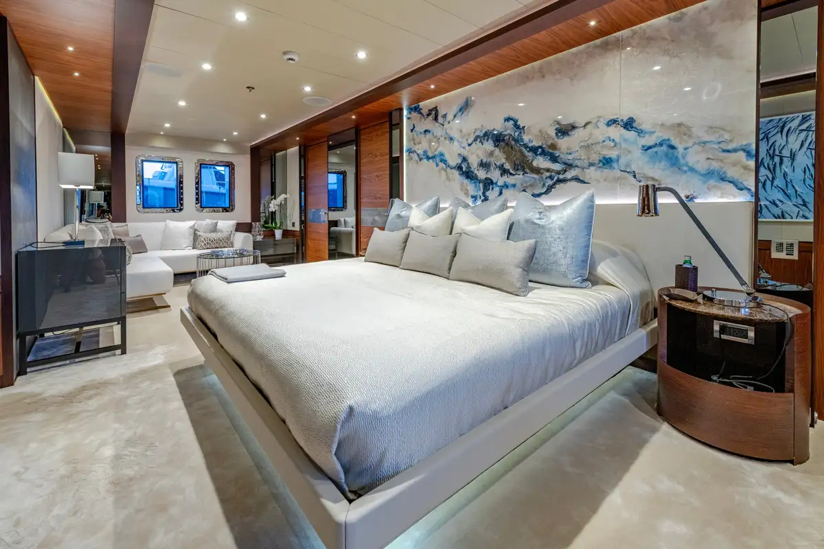 Designed for multiple family use, QUASAR offers flexible accommodation for up to 12 guests across six comfortable cabins. An innovative layout features two master cabins, the first of which can be found on the main deck and boasts a private office, while the second is on the lower deck and enjoys a private lounge.