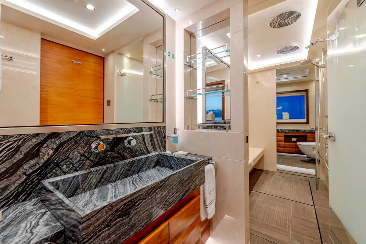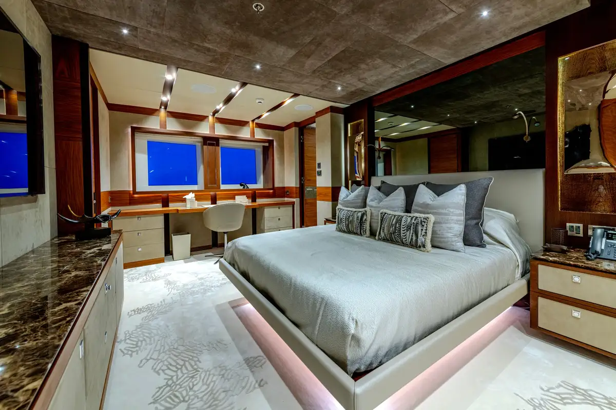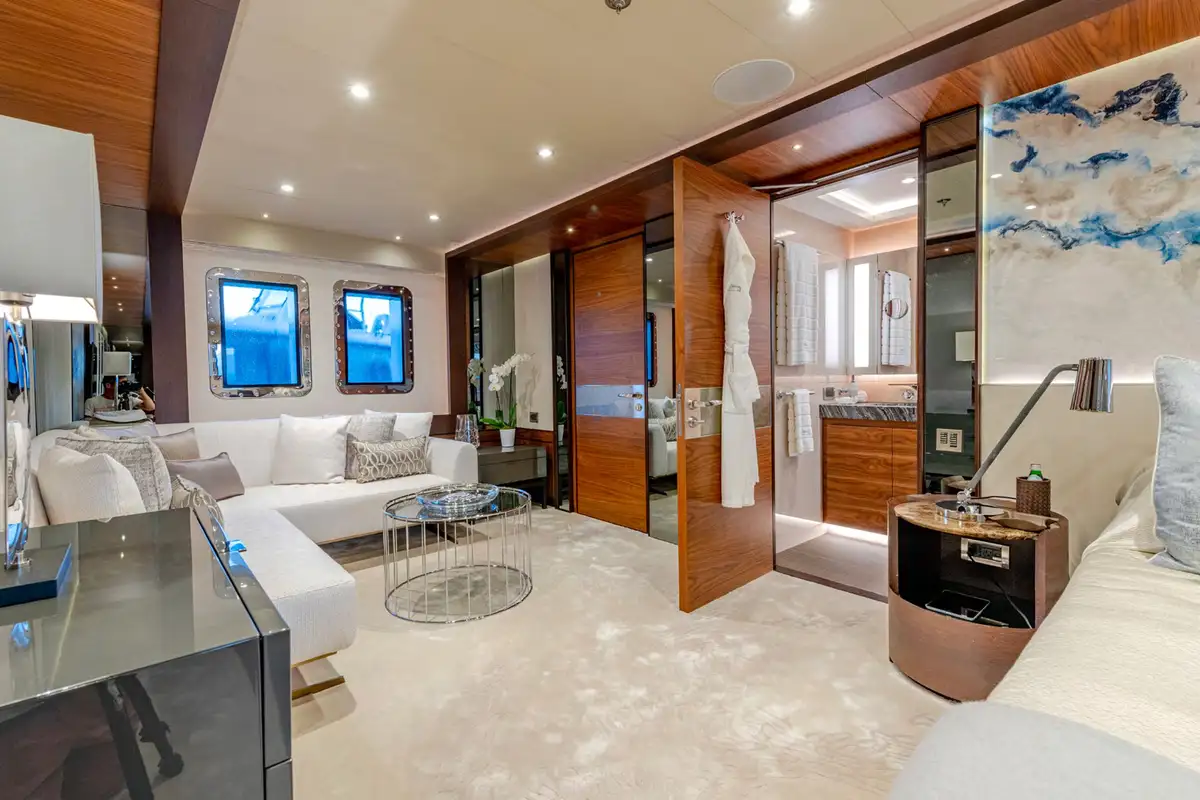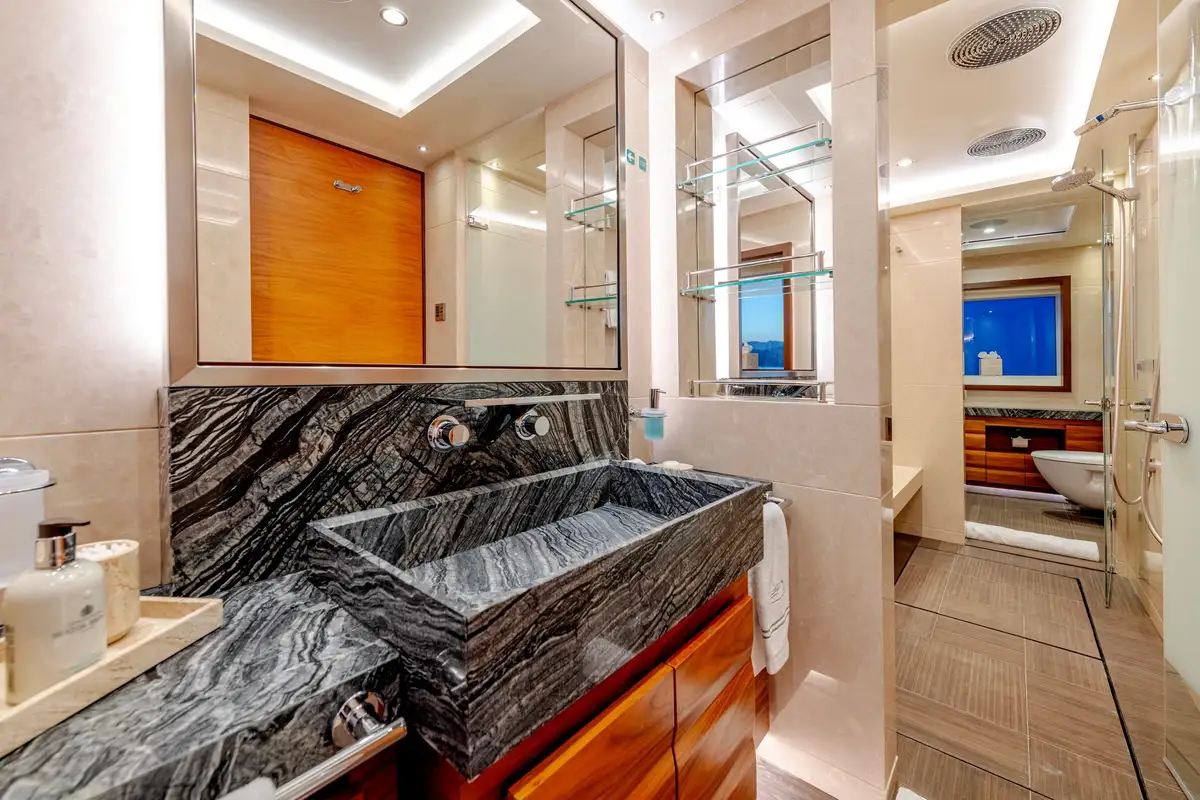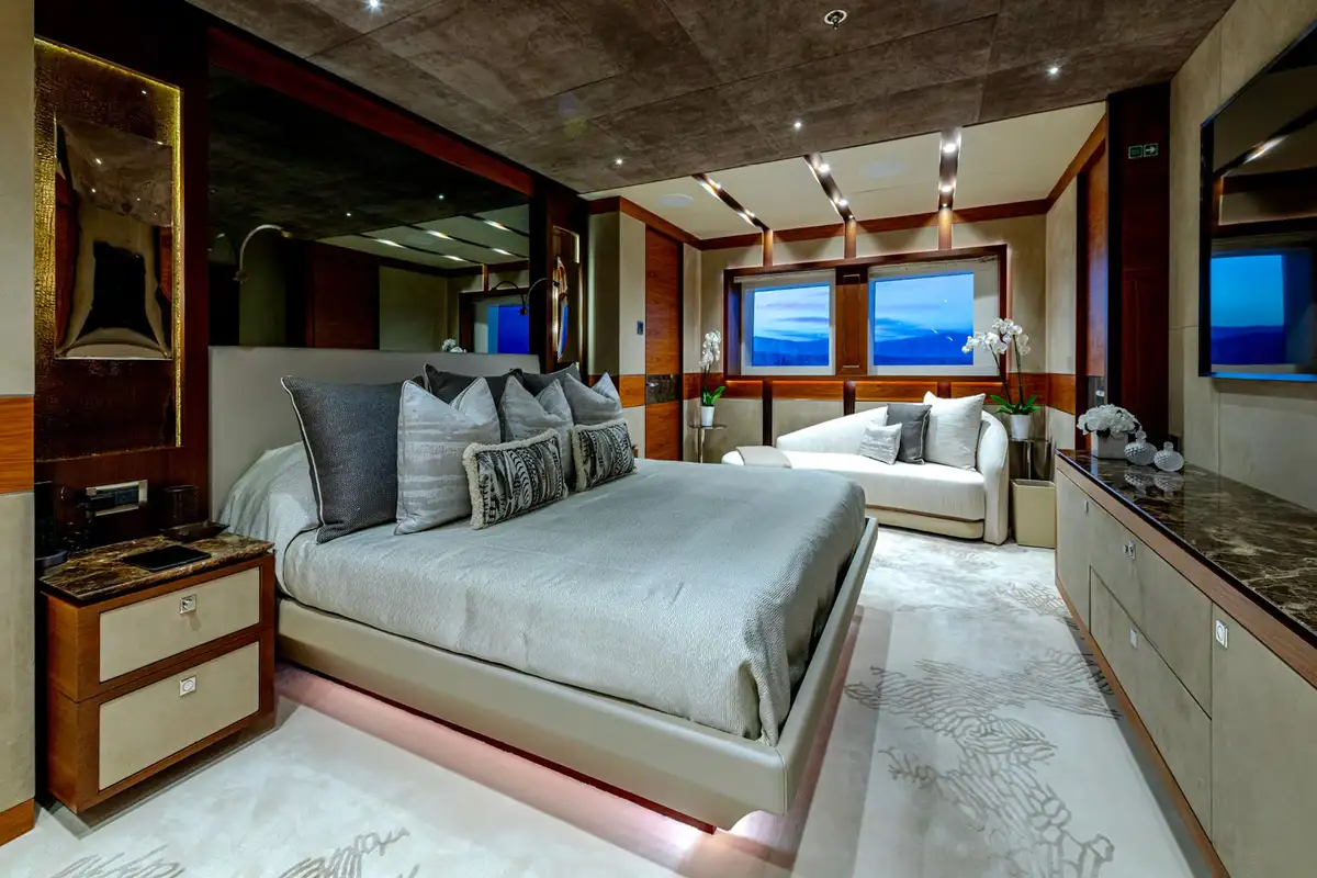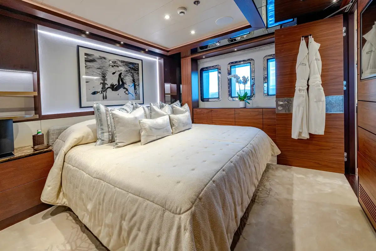 Designed for multiple family use, QUASAR offers flexible accommodation for up to 12 guests across six comfortable cabins. An innovative layout features two master cabins, the first of which can be found on the main deck and boasts a private office, while the second is on the lower deck and enjoys a private lounge.