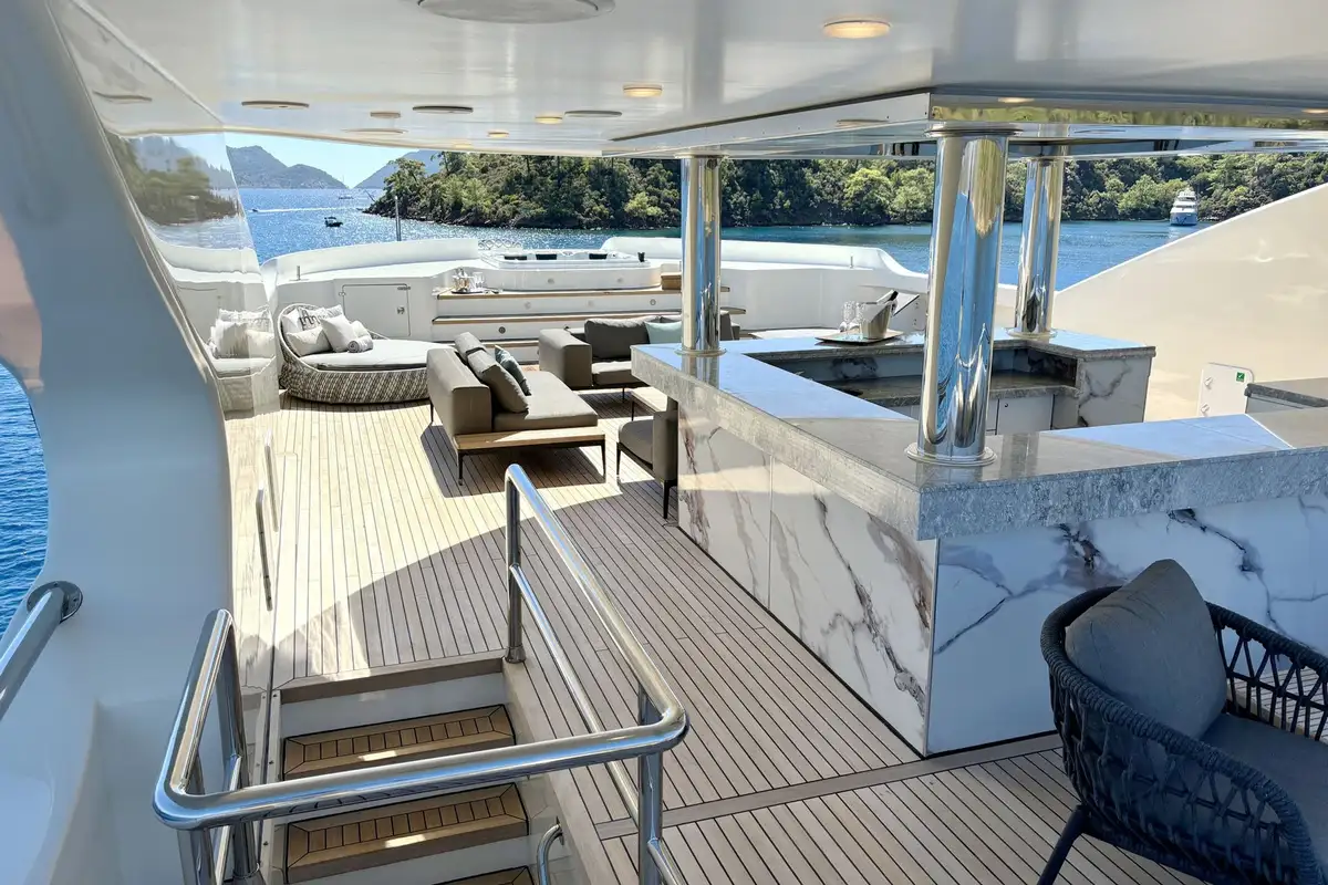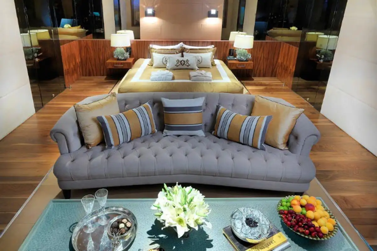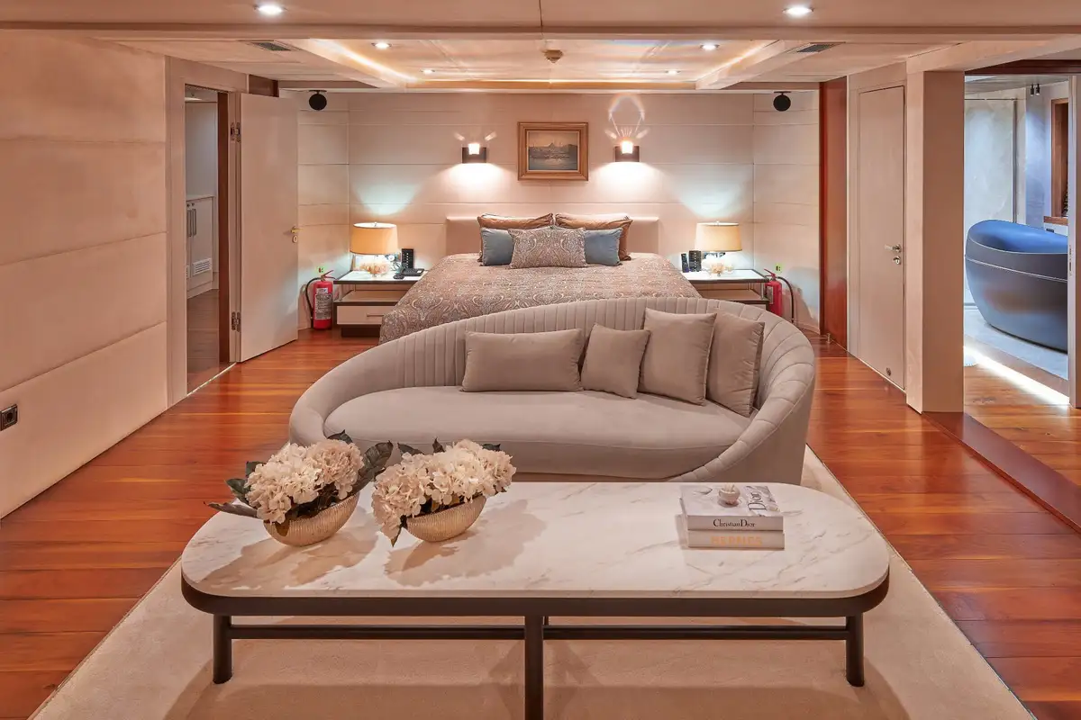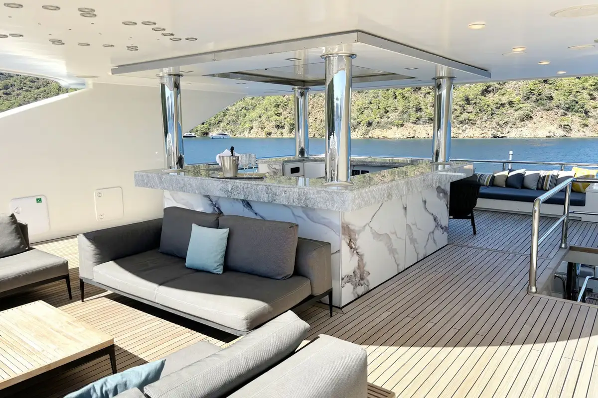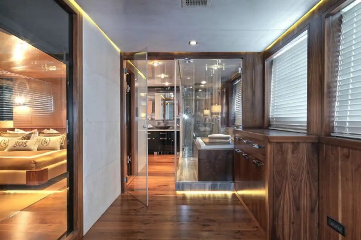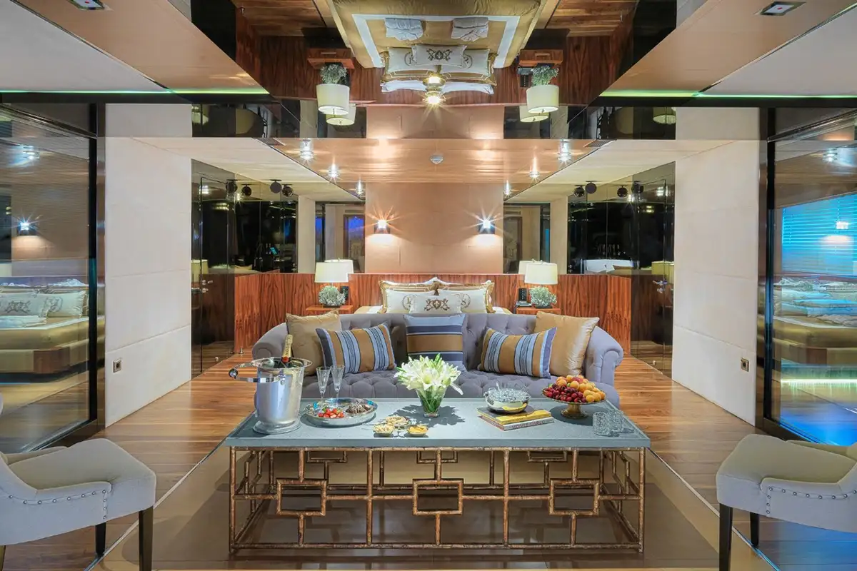 Her interior, designed by Alpha Ltd., is a showcase of sophisticated materials and luxurious touches. Featuring American walnut, leather tiles, Fendi tables, Ralph Lauren chairs, Swarovski lighting and natural stone, the atmosphere is both refined and welcoming. The main deck lounge and sky lounge provide ample space for entertaining, relaxing, or hosting guests in elegant comfort, complemented by a sense of volume only achievable on a yacht of this calibre.