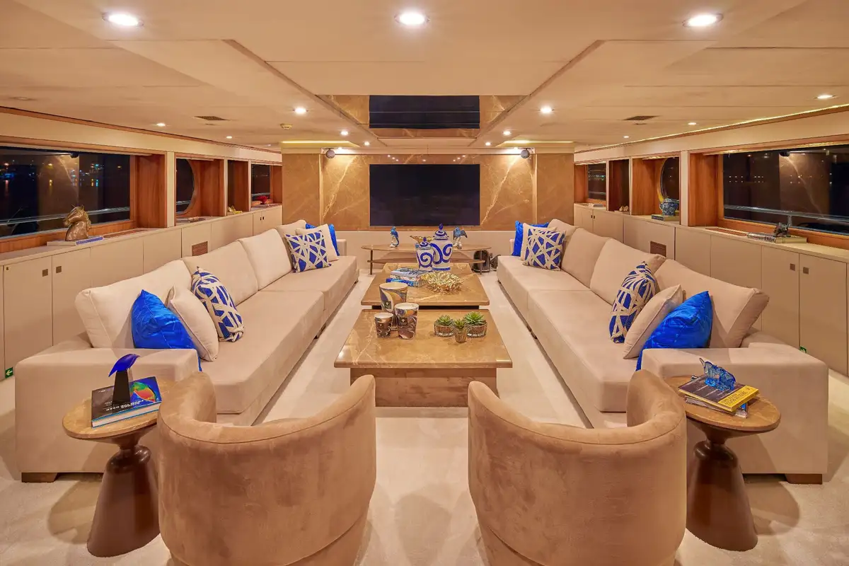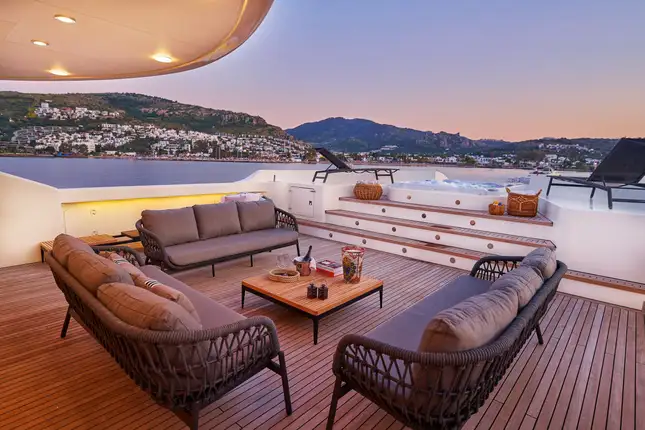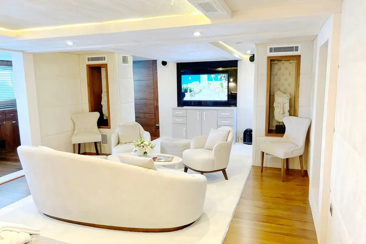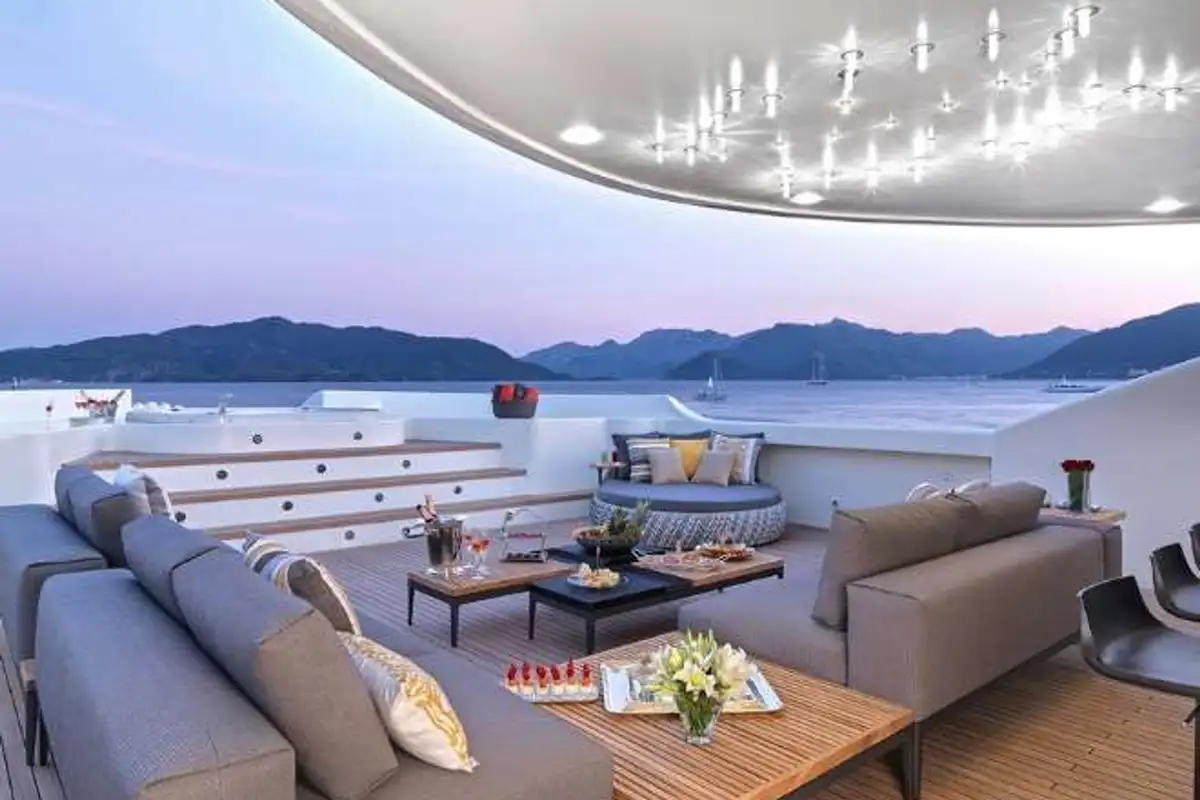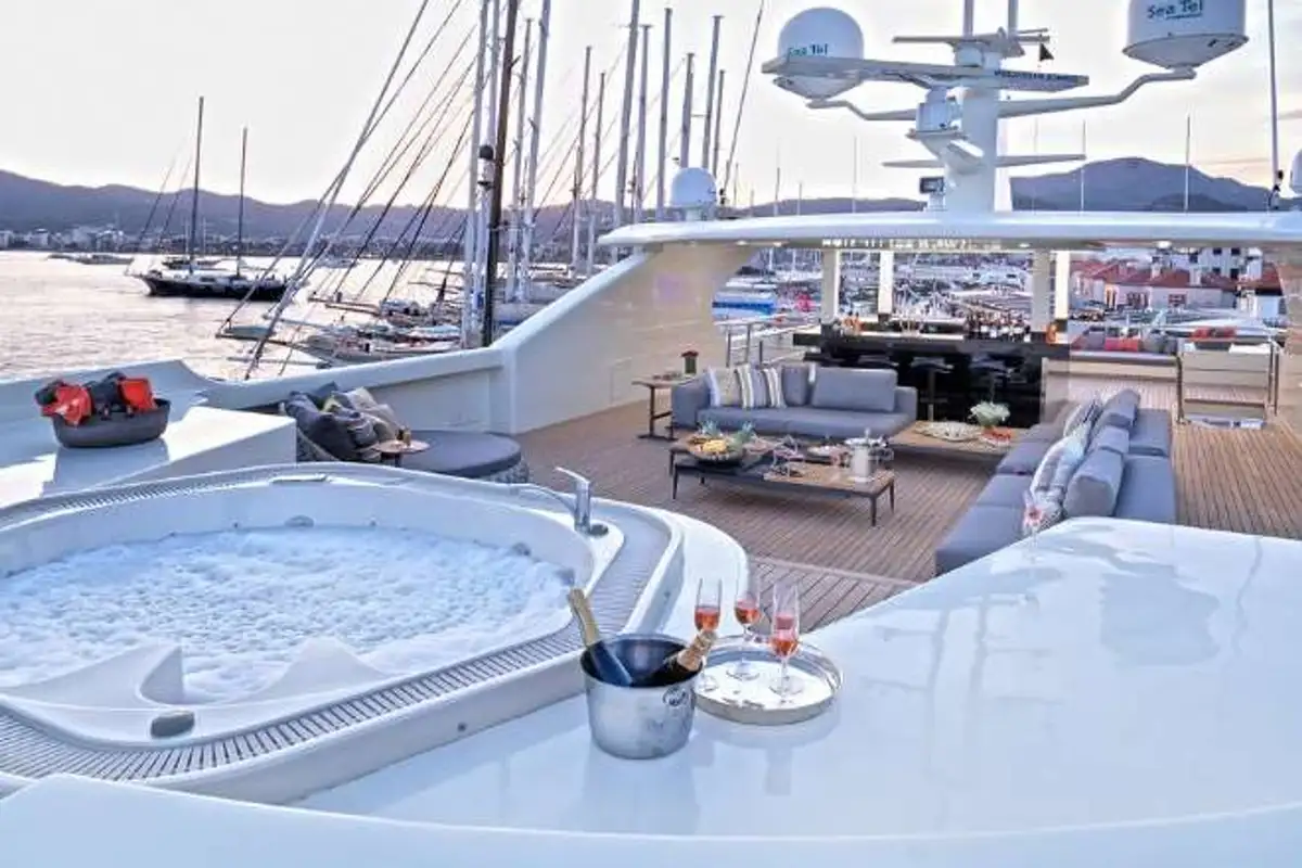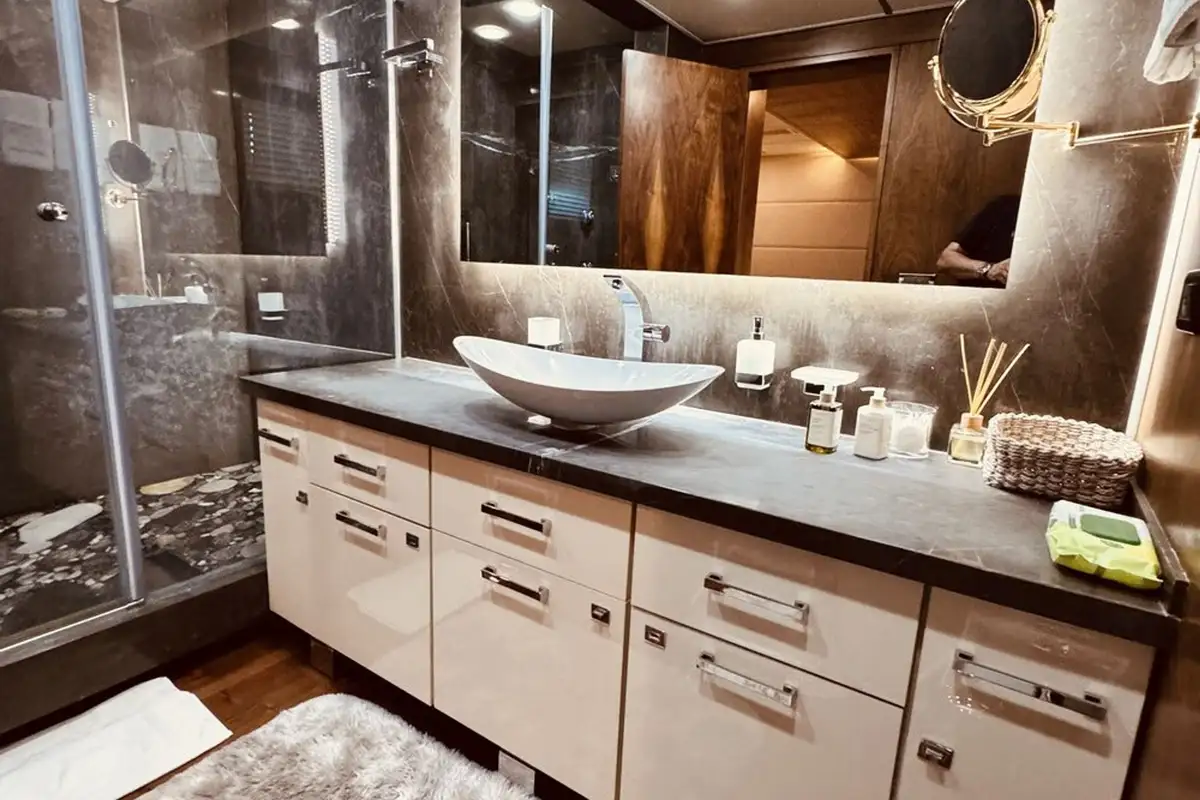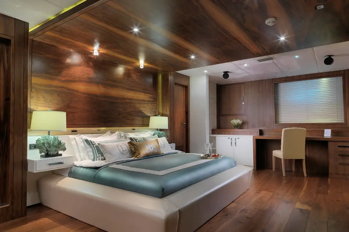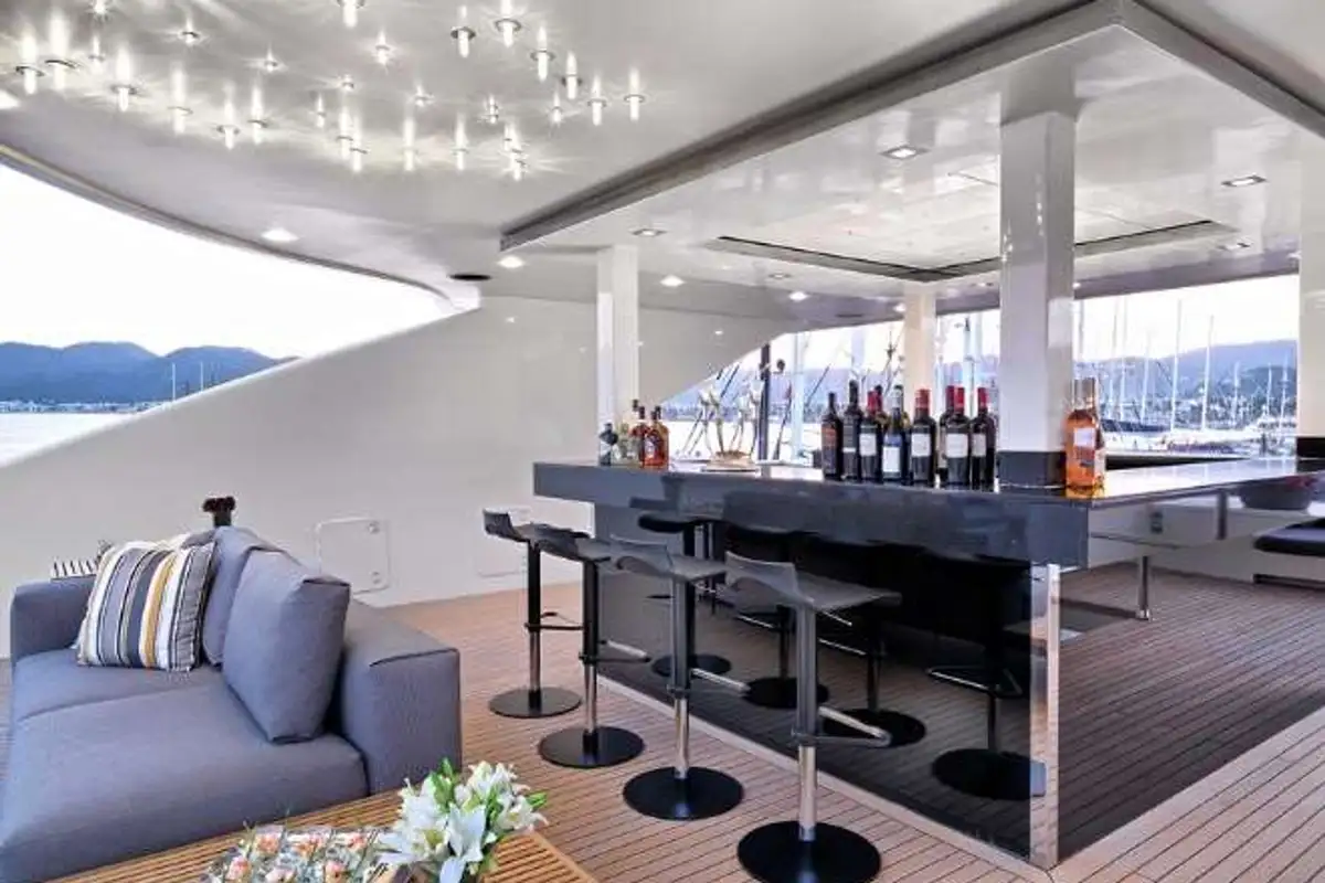Her interior, designed by Alpha Ltd., is a showcase of sophisticated materials and luxurious touches. Featuring American walnut, leather tiles, Fendi tables, Ralph Lauren chairs, Swarovski lighting and natural stone, the atmosphere is both refined and welcoming. The main deck lounge and sky lounge provide ample space for entertaining, relaxing, or hosting guests in elegant comfort, complemented by a sense of volume only achievable on a yacht of this calibre.