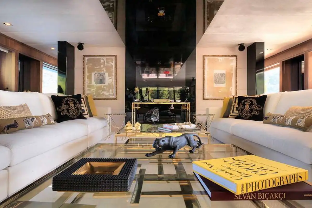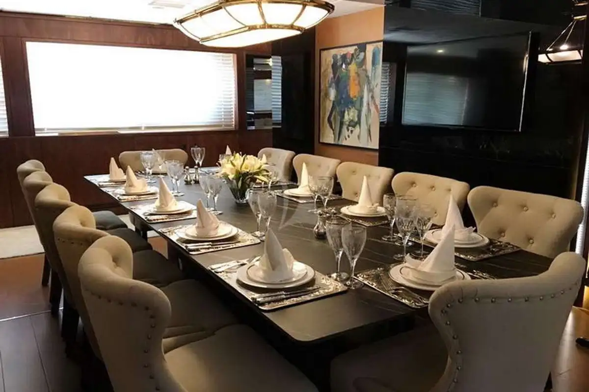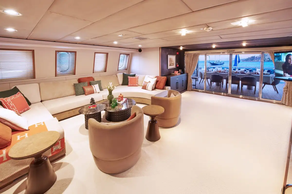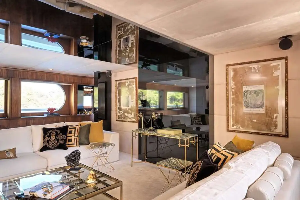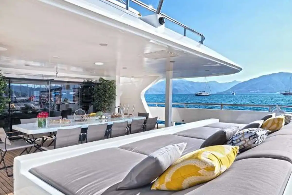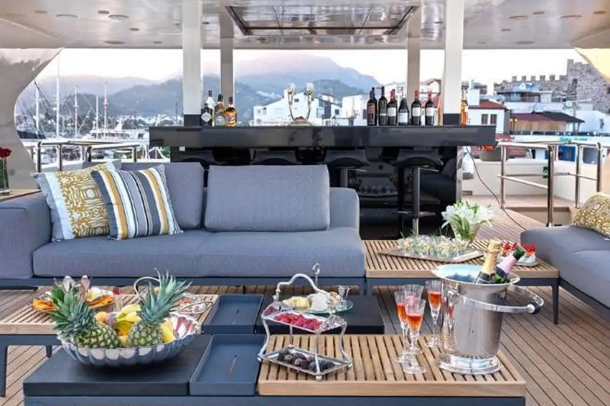 Her interior, designed by Alpha Ltd., is a showcase of sophisticated materials and luxurious touches. Featuring American walnut, leather tiles, Fendi tables, Ralph Lauren chairs, Swarovski lighting and natural stone, the atmosphere is both refined and welcoming. The main deck lounge and sky lounge provide ample space for entertaining, relaxing, or hosting guests in elegant comfort, complemented by a sense of volume only achievable on a yacht of this calibre.