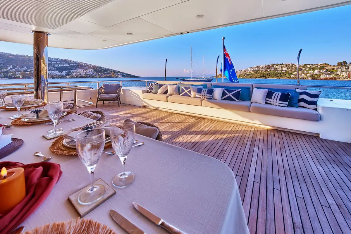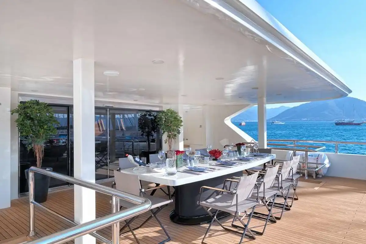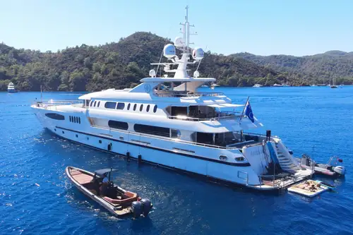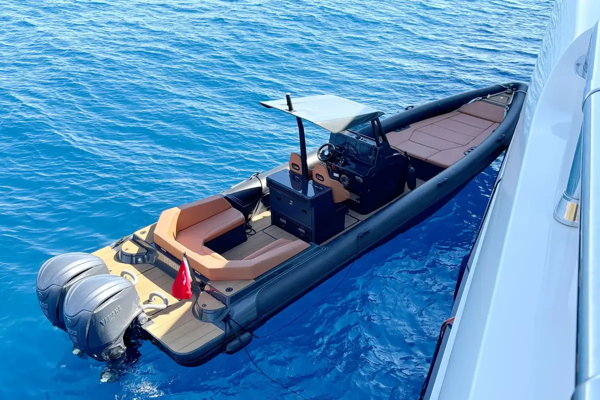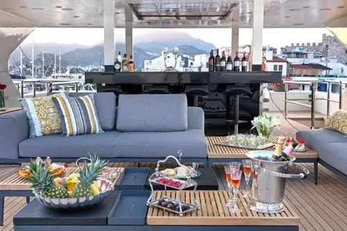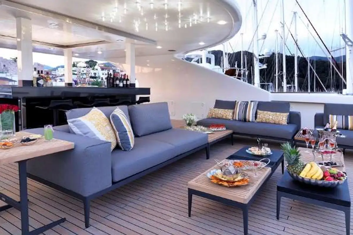 QUEEN MARE boasts a stern garage that opens port and starboard, storing her full complement of water toys and a 12m Rock Marine chase tender. The large swim platform aft allows for easy access to the sea, making her a perfect base for water sports and leisure activities.