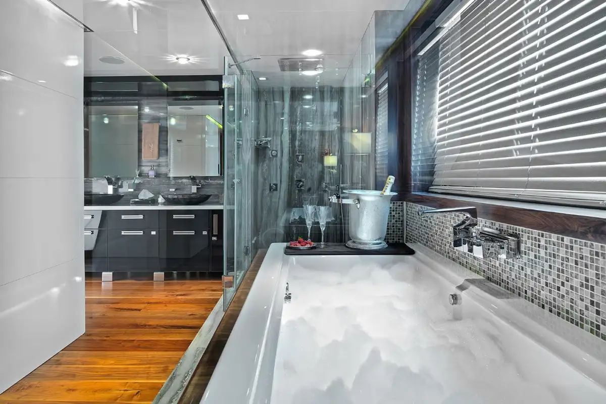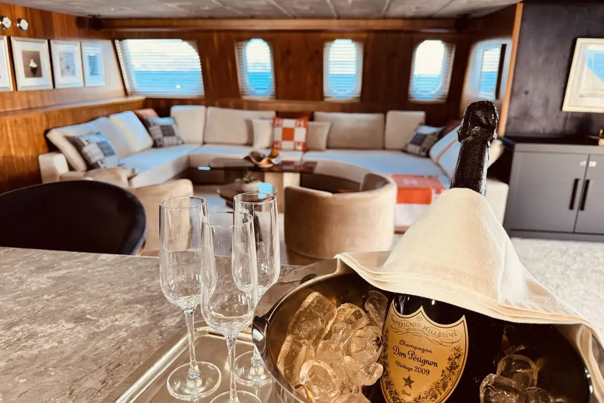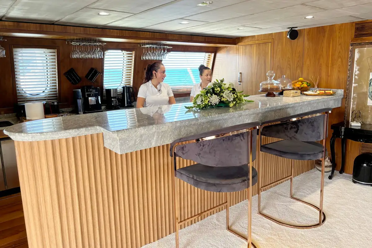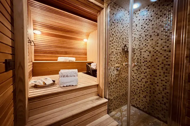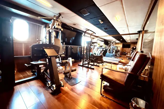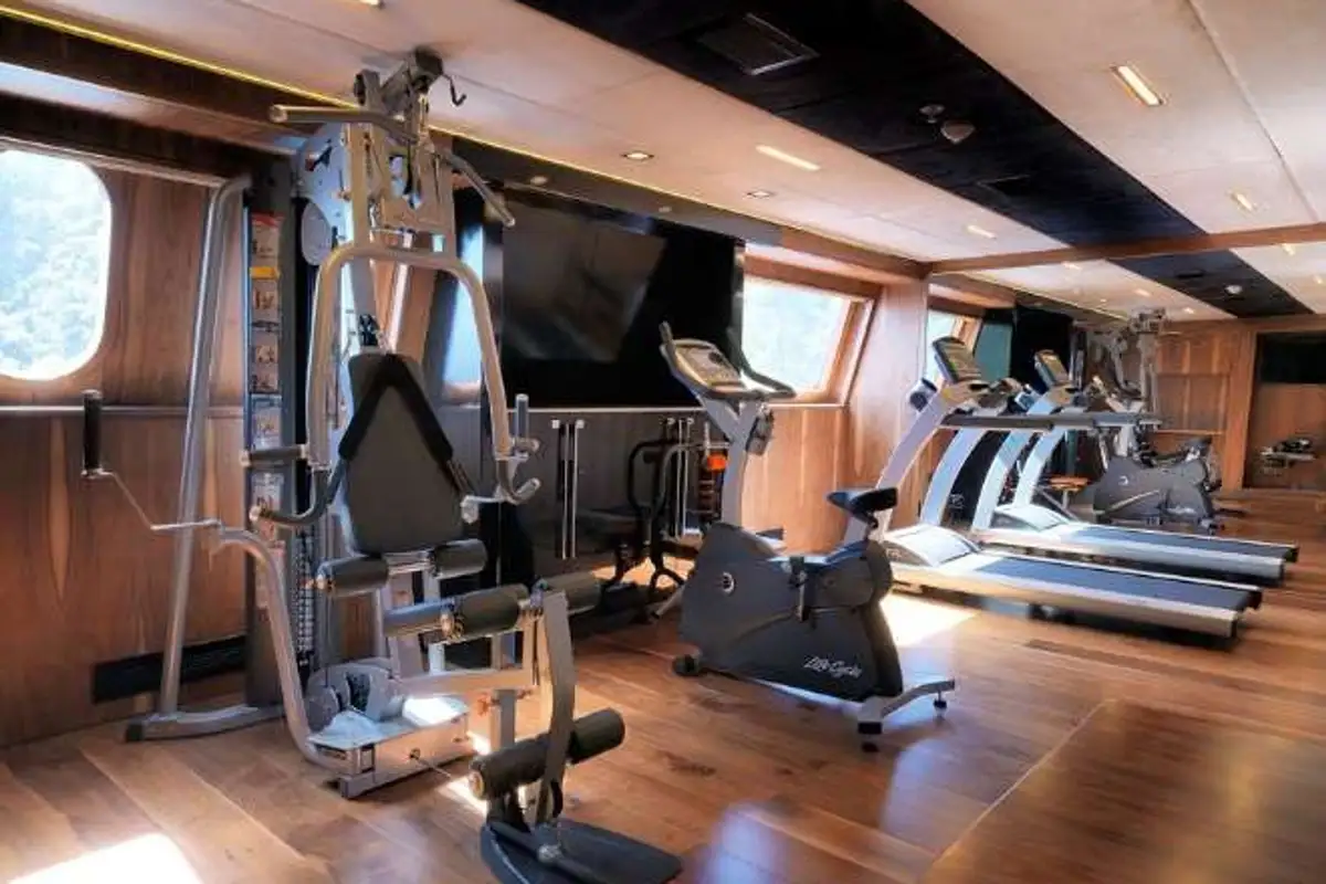 Guest wellbeing is further enhanced with a fully equipped gym located on the bridge deck, and a traditional Swedish sauna with shower on the accommodation level—offering a wellness retreat at sea. The vessel also features high-speed Wi-Fi, zero-speed stabilisers for comfort at anchor, and full air conditioning throughout.