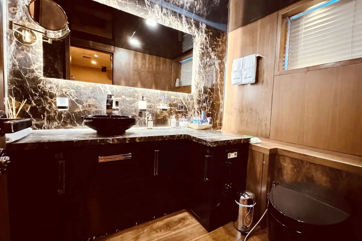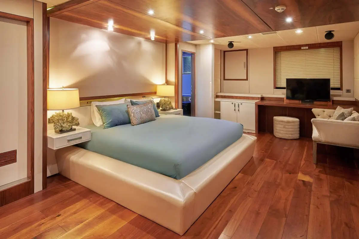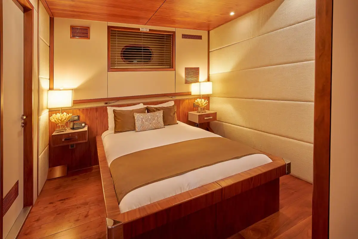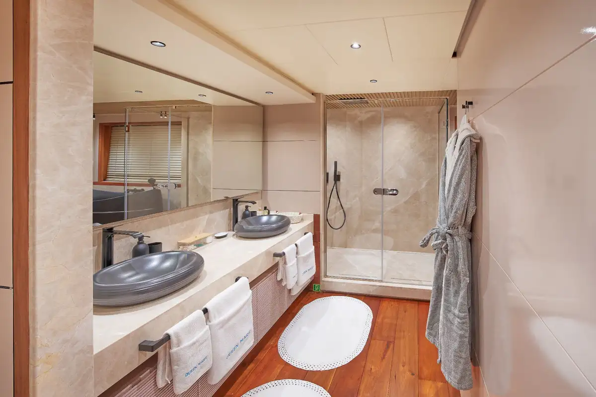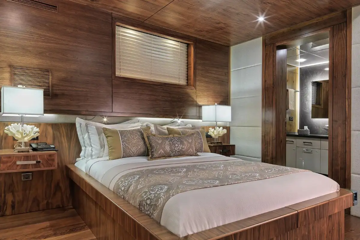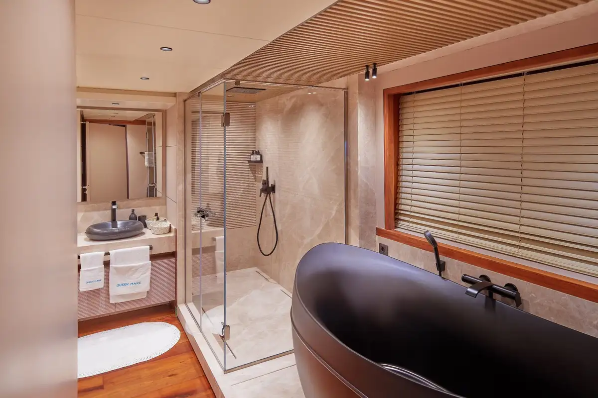 QUEEN MARE accommodates 12 guests in six spacious cabins. The full-beam master suite is located forward on the main deck, complete with its own private reception area, office, and unobstructed views. On the lower deck, a VIP suite mirrors this grandeur, also benefitting from full beam proportions. Four additional guest cabins, all with double beds, ensure a flexible and luxurious layout for family or friends. Each stateroom is finished to an exceptionally high standard, with en suite facilities throughout.
