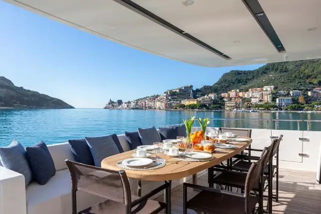 Sleek and inviting exterior spaces align QUEEN MARTINA and make her a perfect example of the expert planning and craftmanship that Sanlorenzo is famed for. The wide, expansive sun deck, with sun loungers, couches, and a dedicated dining area, is the perfect place to spend the afternoon either in the shade or under the sun. A dedicated bar runs parallel to the dining table, where the crew will happily hand you a fresh beverage. Descending the sun deck, you'll be greeted by the main deck. Providing excellent shelter from the elements and the harsh midday sun, it's a perfect rendezvous point for al fresco dining, cocktails, or somewhere to cool off after taking a dip in the sea.