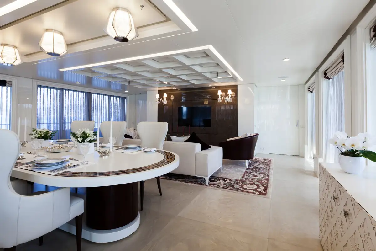 The interior layout has been optimised to offer spacious and chic guest areas. From the custom-made staircase to the hand-detailed finishes, luxurious materials and bespoke features have been used throughout the yacht to match a stunning design with unparalleled quality.