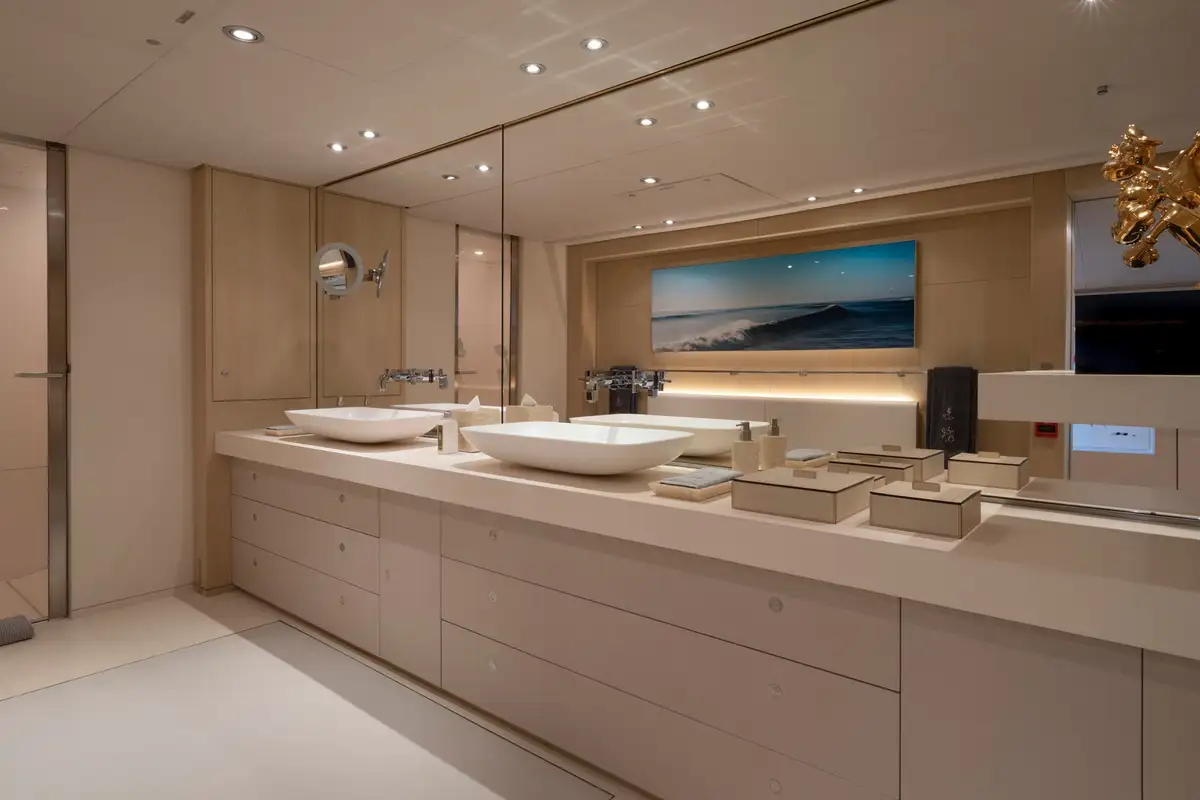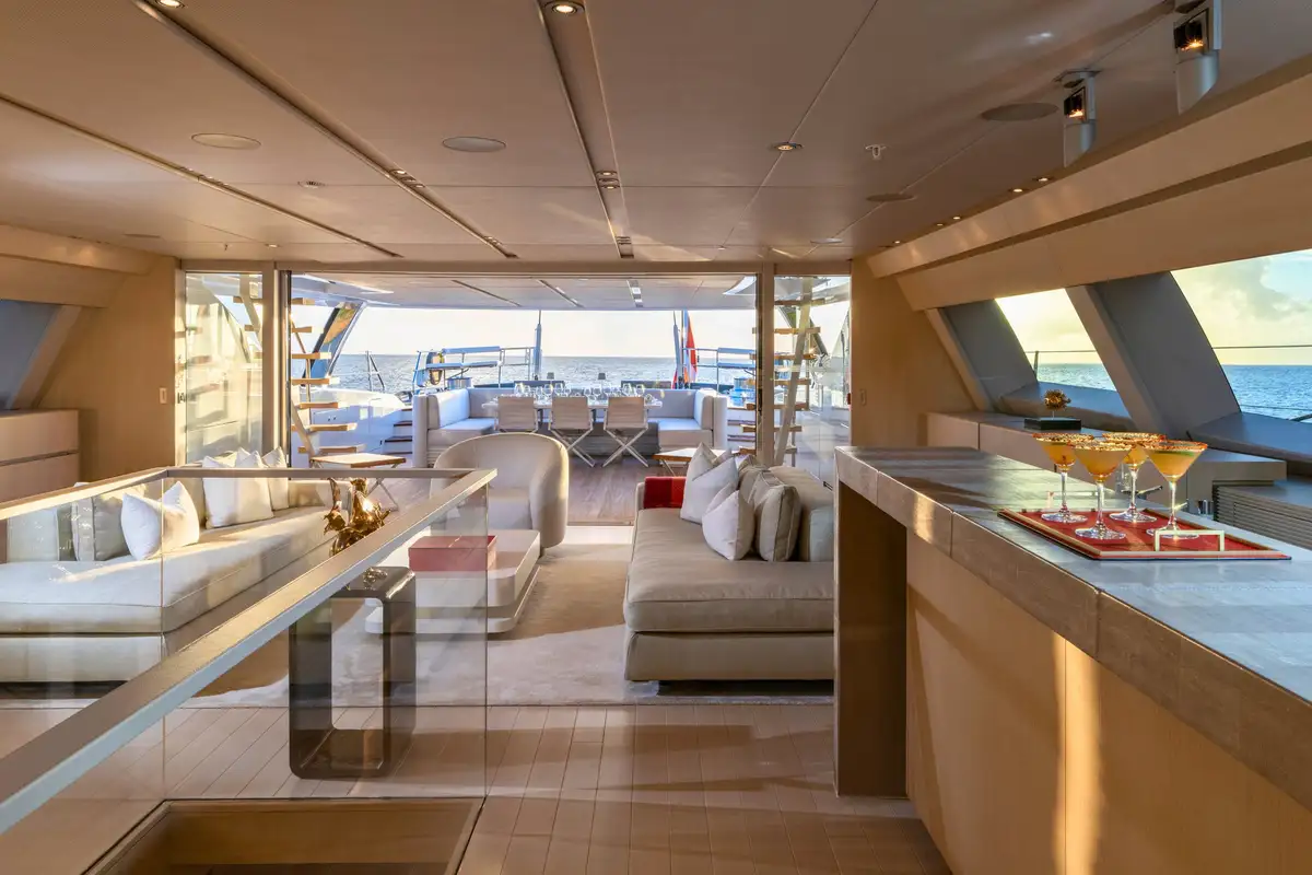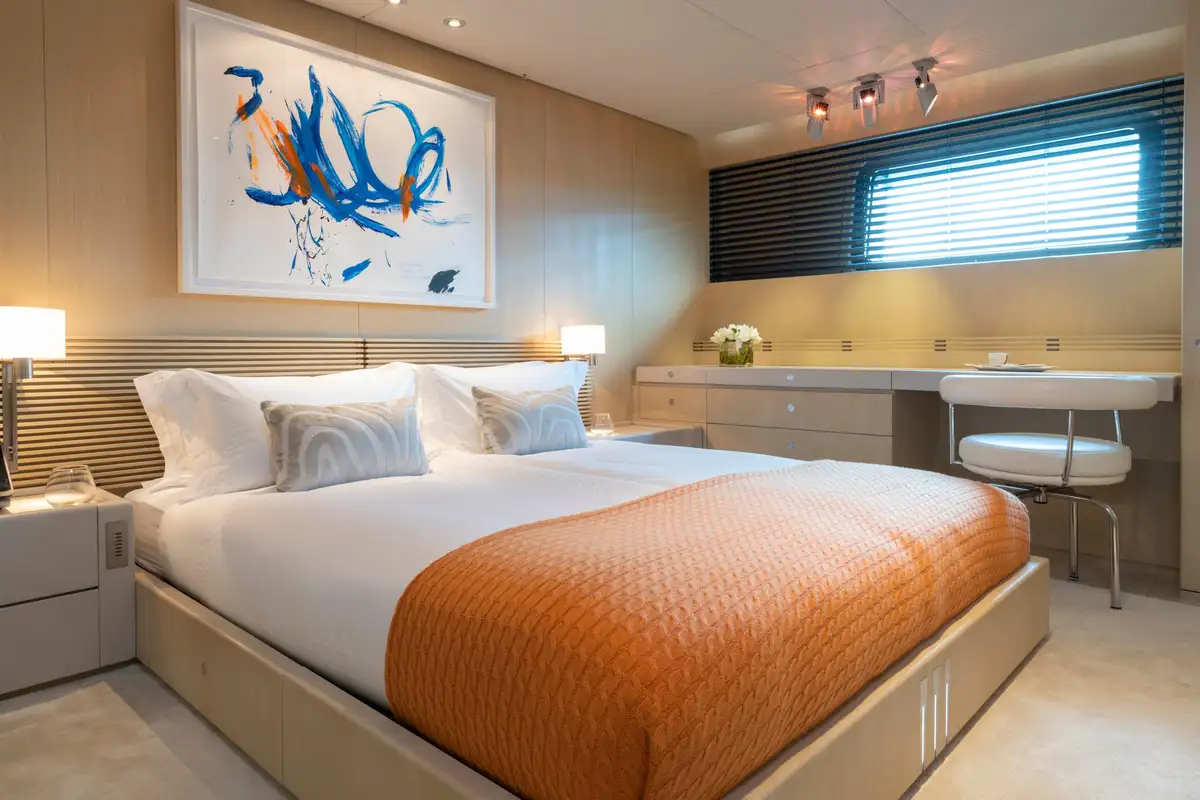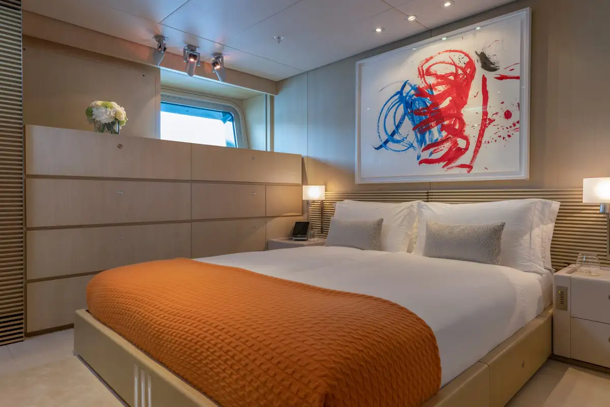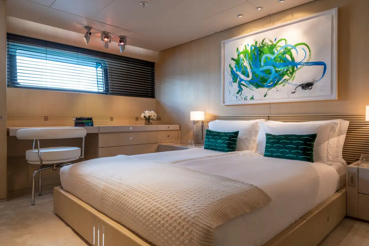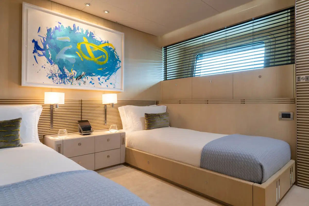 As the sun sets, experience magical evenings on the flybridge with fine dining and cocktails under the stars. Inside, the main deck lounge awaits if you choose to get settled for a movie night or lively game session with friends and family. When it’s time to head to bed, the elegantly designed guest cabins ensure a peaceful and indulgent night’s sleep.