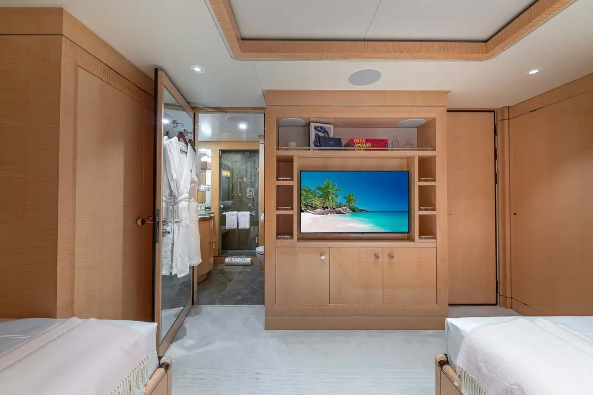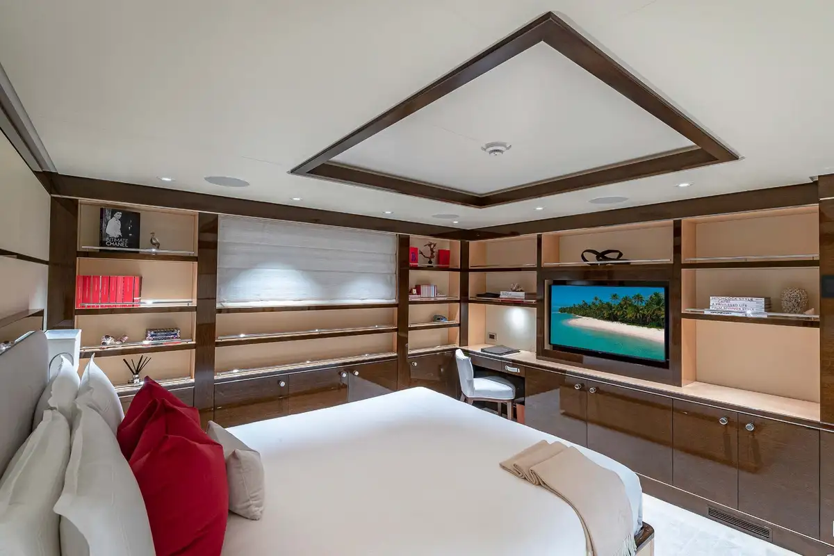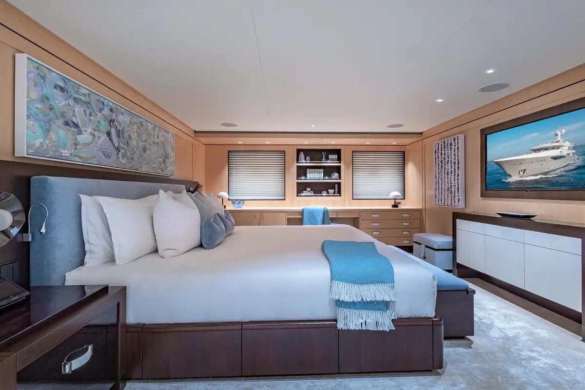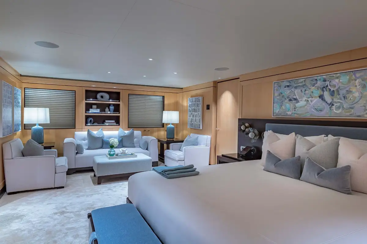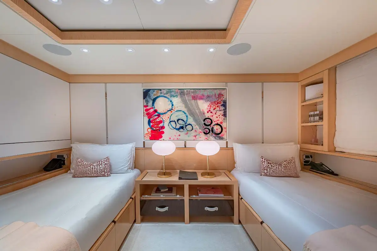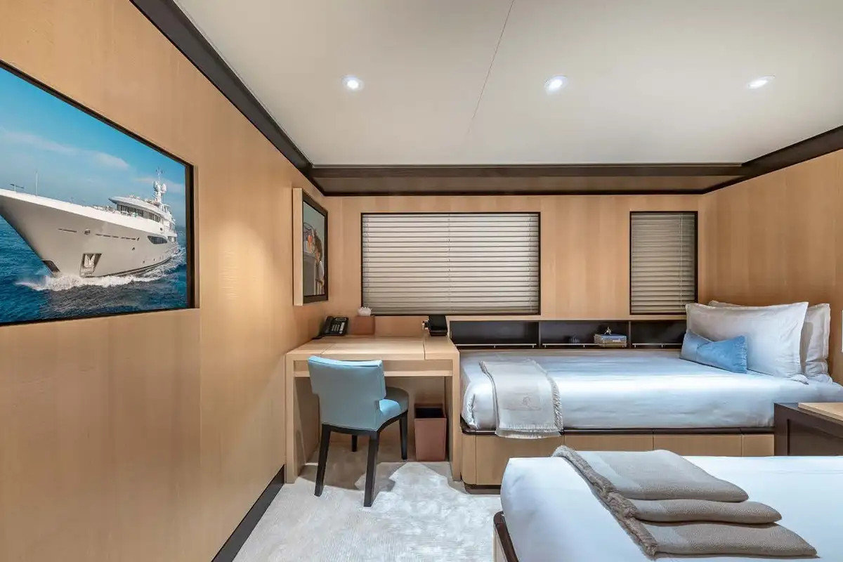 Her beautifully appointed interior layout offers six cabins that sleep up to 12 guests, including a full-beam master suite with private lounge/study, en suite and walk-in wardrobe. A further twin cabin located aft of the master suite provides an ideal sleeping arrangement for charters with children or staff. A further four cabins are situated on the lower deck, comprising a VIP stateroom, double cabin and two convertible cabins with pullmans. She is also capable of carrying up to 14 crew onboard to ensure a relaxed luxury yacht charter experience whatever your destination.