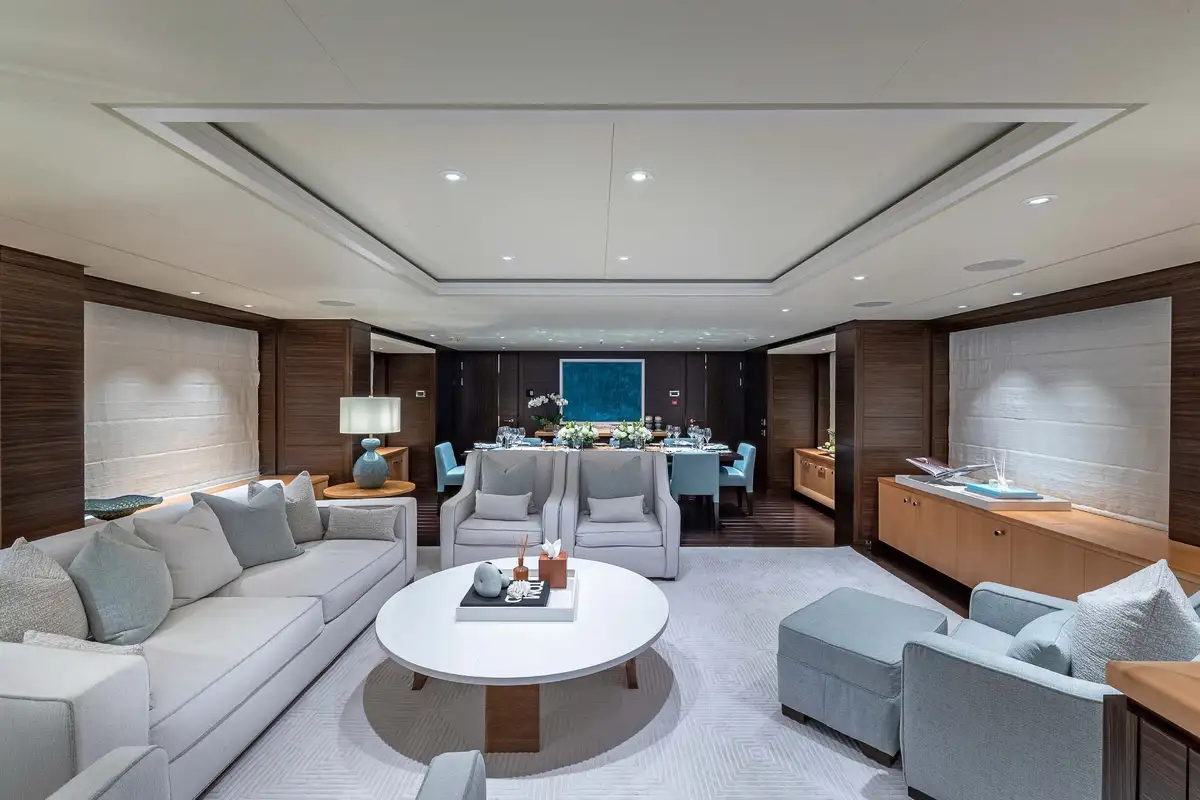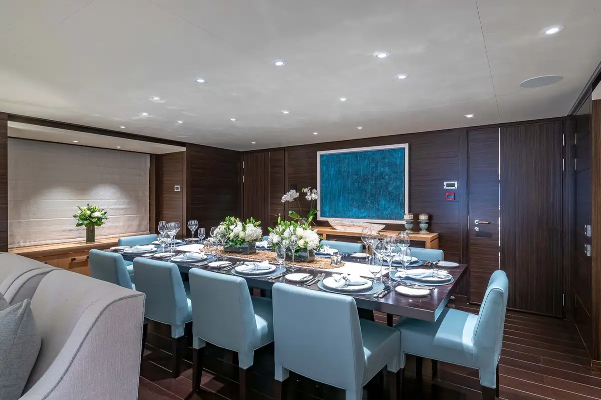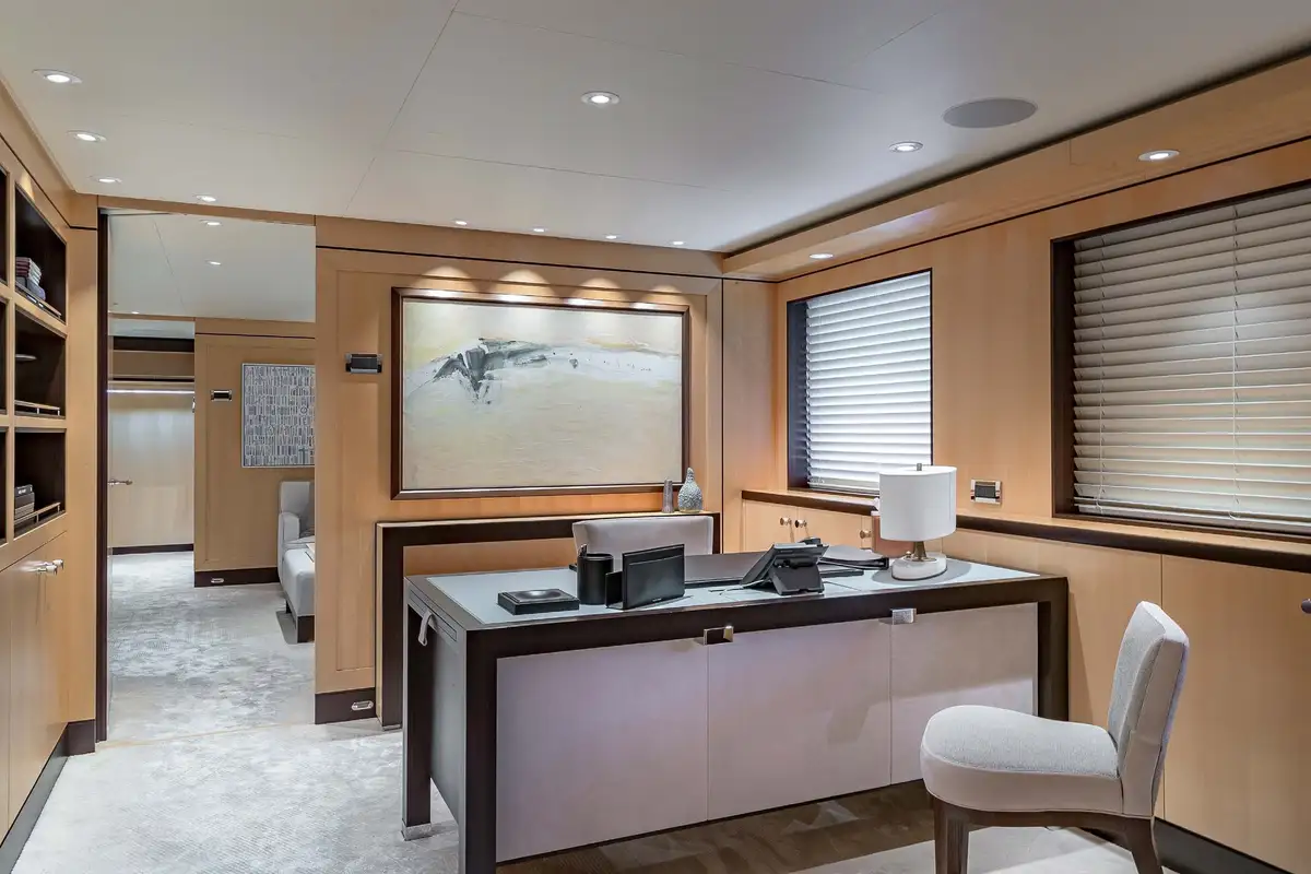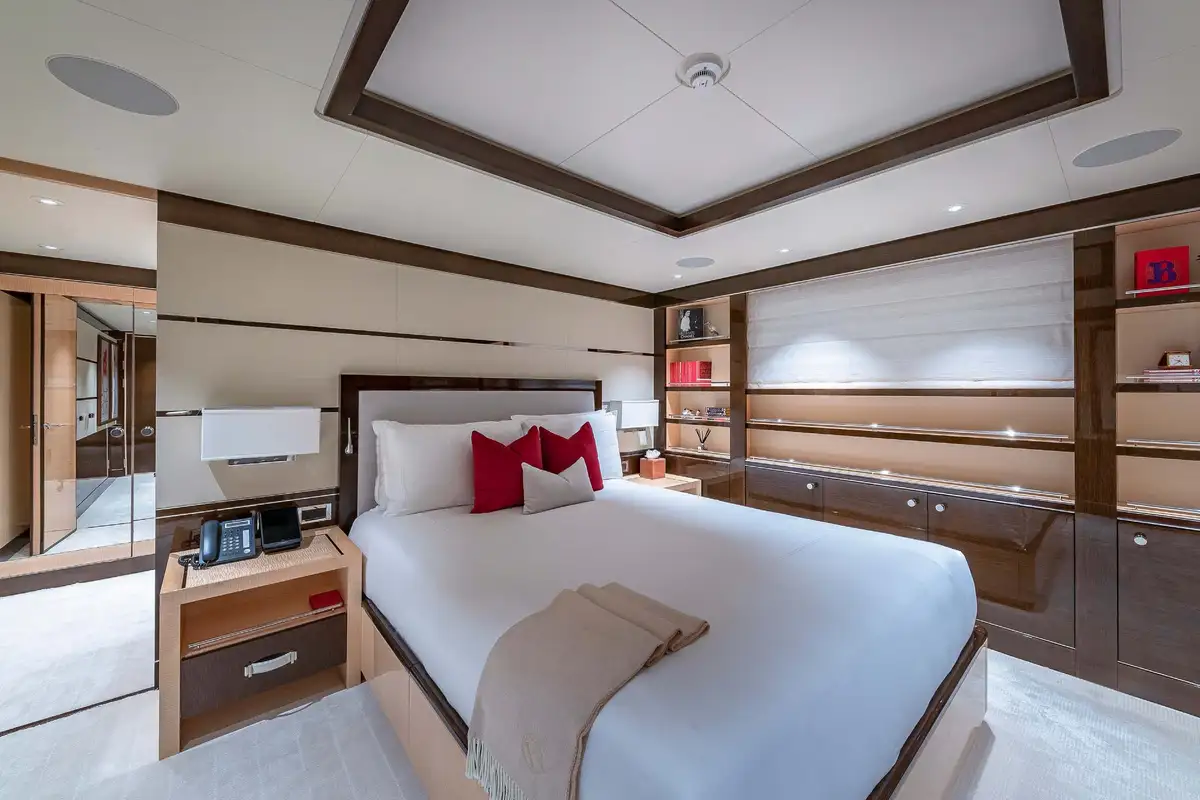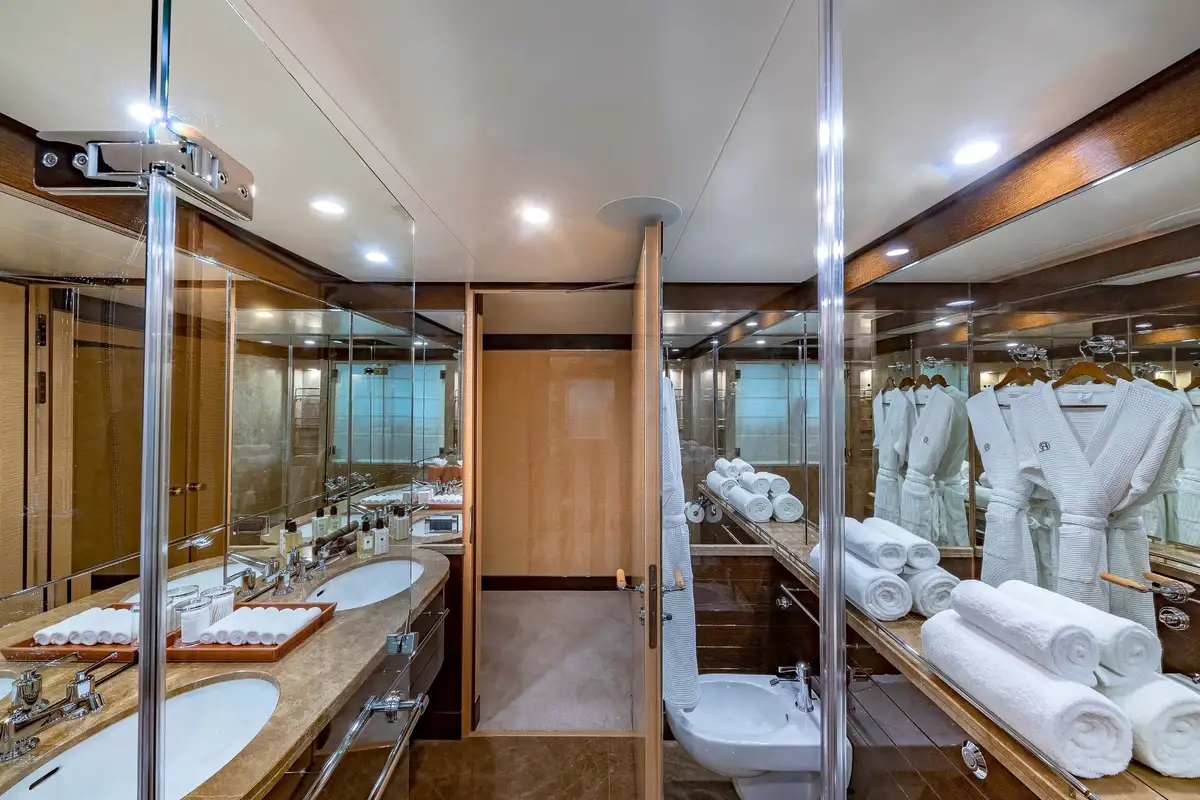 Her beautifully appointed interior layout offers six cabins that sleep up to 12 guests, including a full-beam master suite with private lounge/study, en suite and walk-in wardrobe. A further twin cabin located aft of the master suite provides an ideal sleeping arrangement for charters with children or staff. A further four cabins are situated on the lower deck, comprising a VIP stateroom, double cabin and two convertible cabins with pullmans. She is also capable of carrying up to 14 crew onboard to ensure a relaxed luxury yacht charter experience whatever your destination.