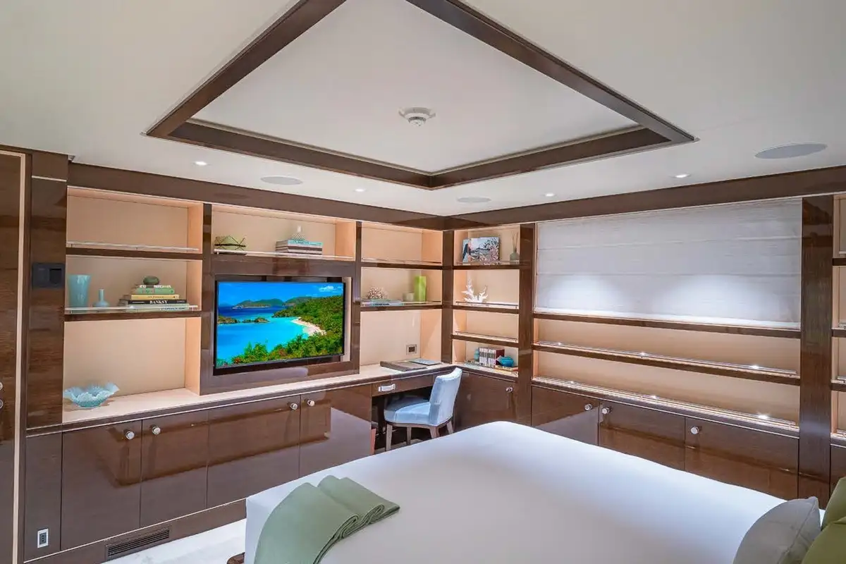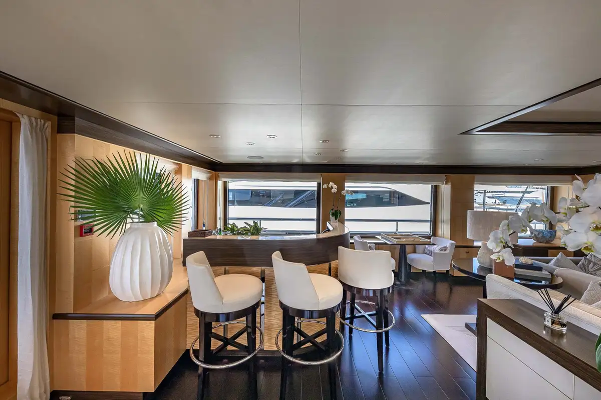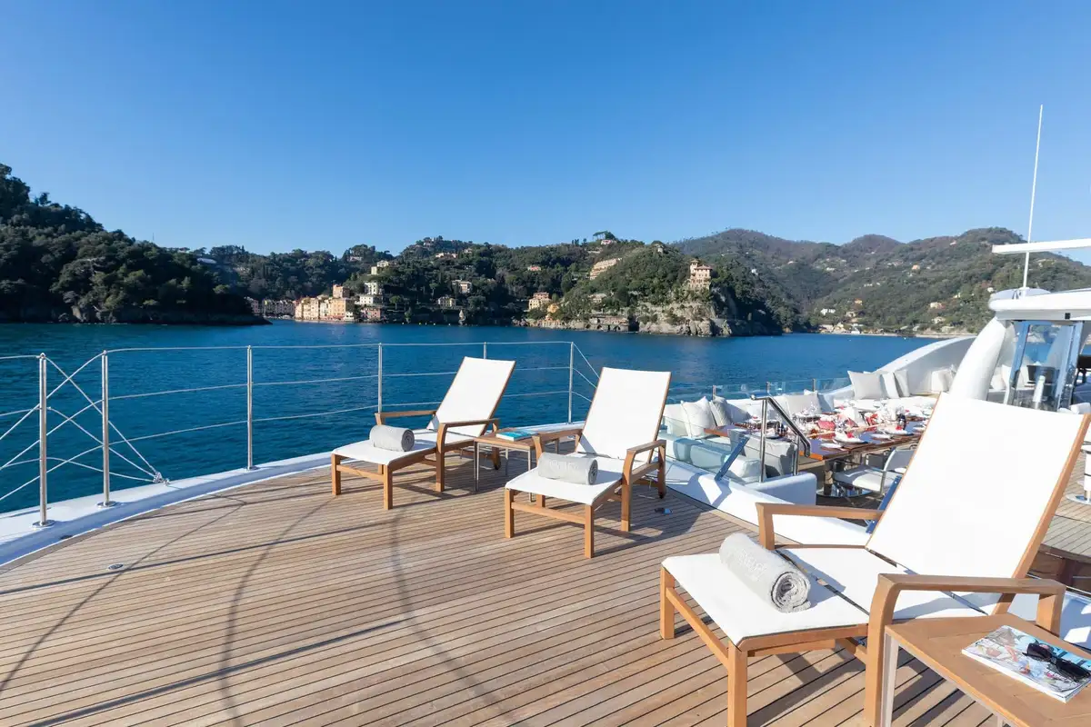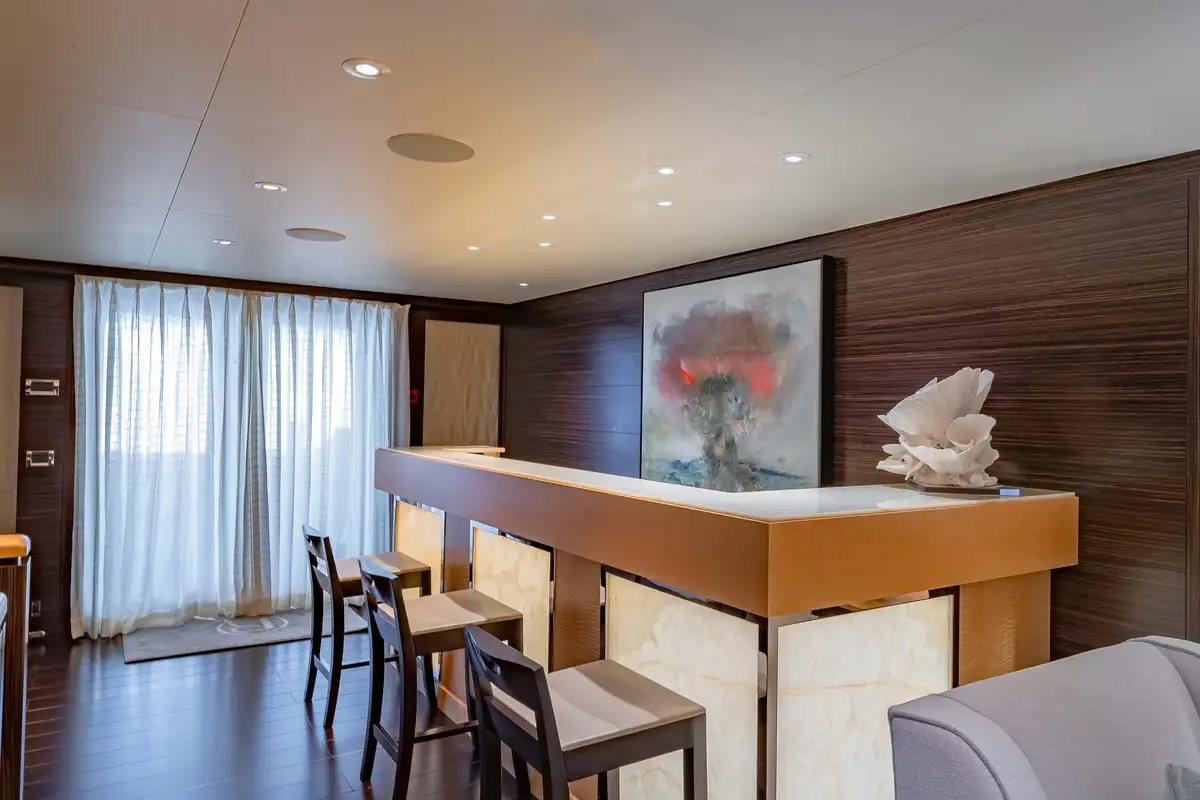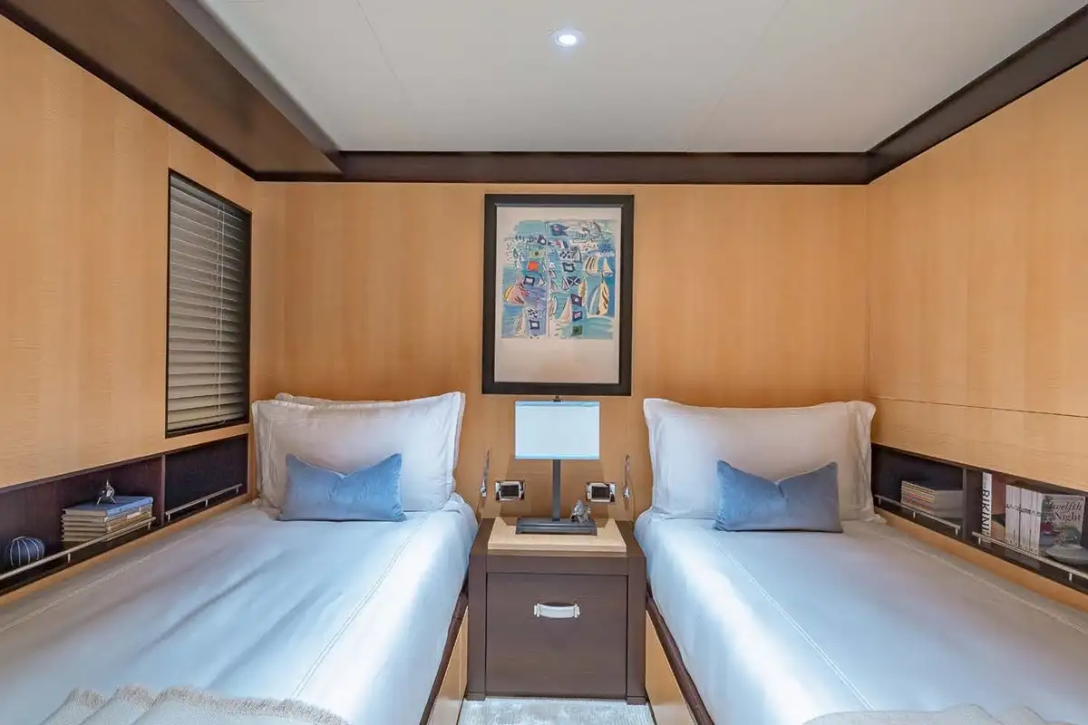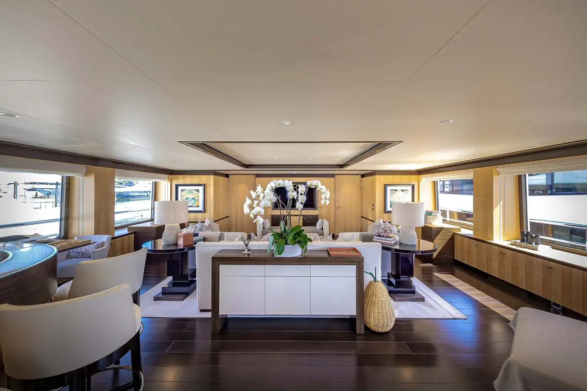 Her beautifully appointed interior layout offers six cabins that sleep up to 12 guests, including a full-beam master suite with private lounge/study, en suite and walk-in wardrobe. A further twin cabin located aft of the master suite provides an ideal sleeping arrangement for charters with children or staff. A further four cabins are situated on the lower deck, comprising a VIP stateroom, double cabin and two convertible cabins with pullmans. She is also capable of carrying up to 14 crew onboard to ensure a relaxed luxury yacht charter experience whatever your destination.