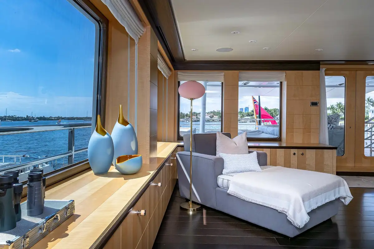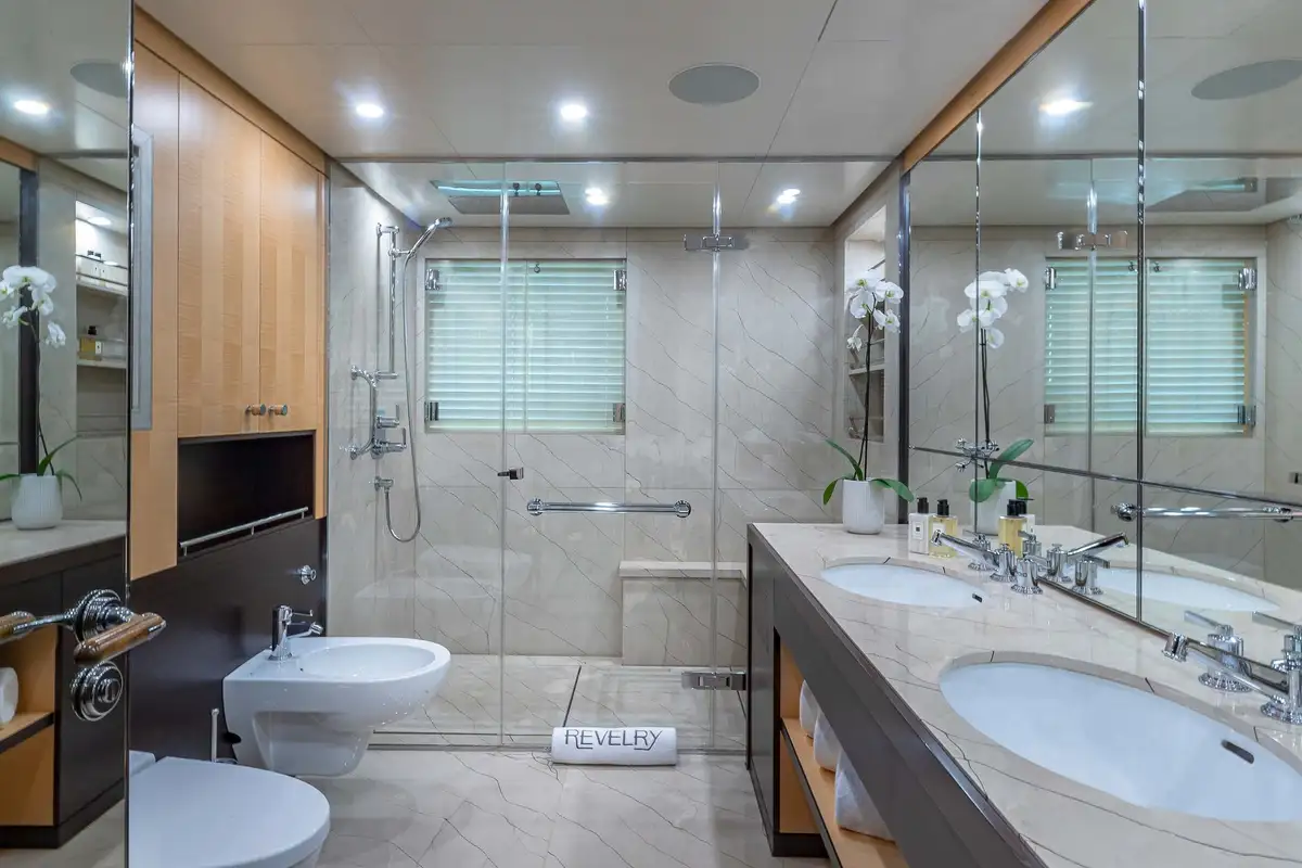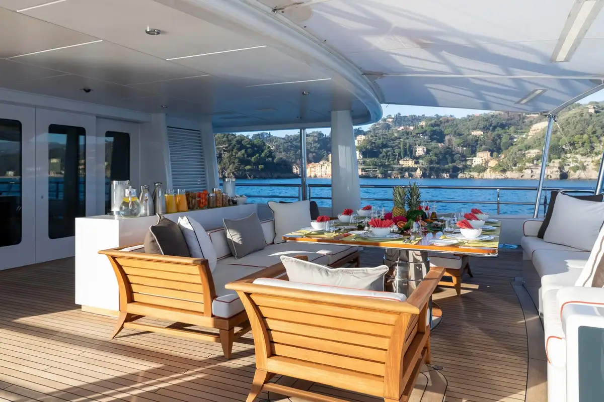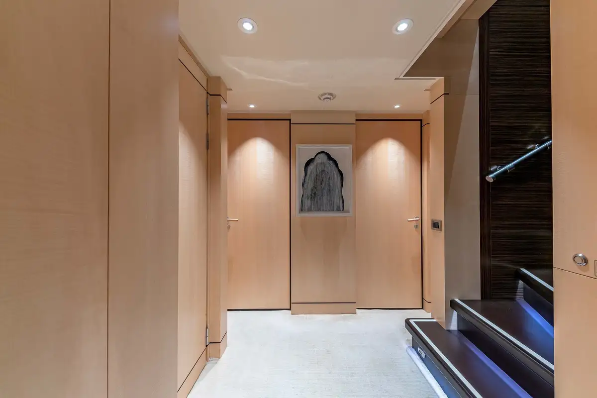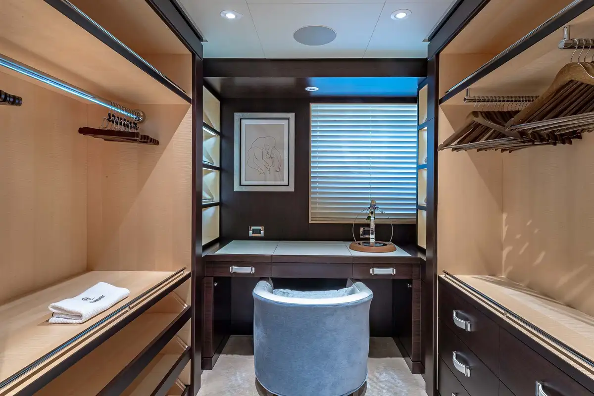 Her beautifully appointed interior layout offers six cabins that sleep up to 12 guests, including a full-beam master suite with private lounge/study, en suite and walk-in wardrobe. A further twin cabin located aft of the master suite provides an ideal sleeping arrangement for charters with children or staff. A further four cabins are situated on the lower deck, comprising a VIP stateroom, double cabin and two convertible cabins with pullmans. She is also capable of carrying up to 14 crew onboard to ensure a relaxed luxury yacht charter experience whatever your destination.