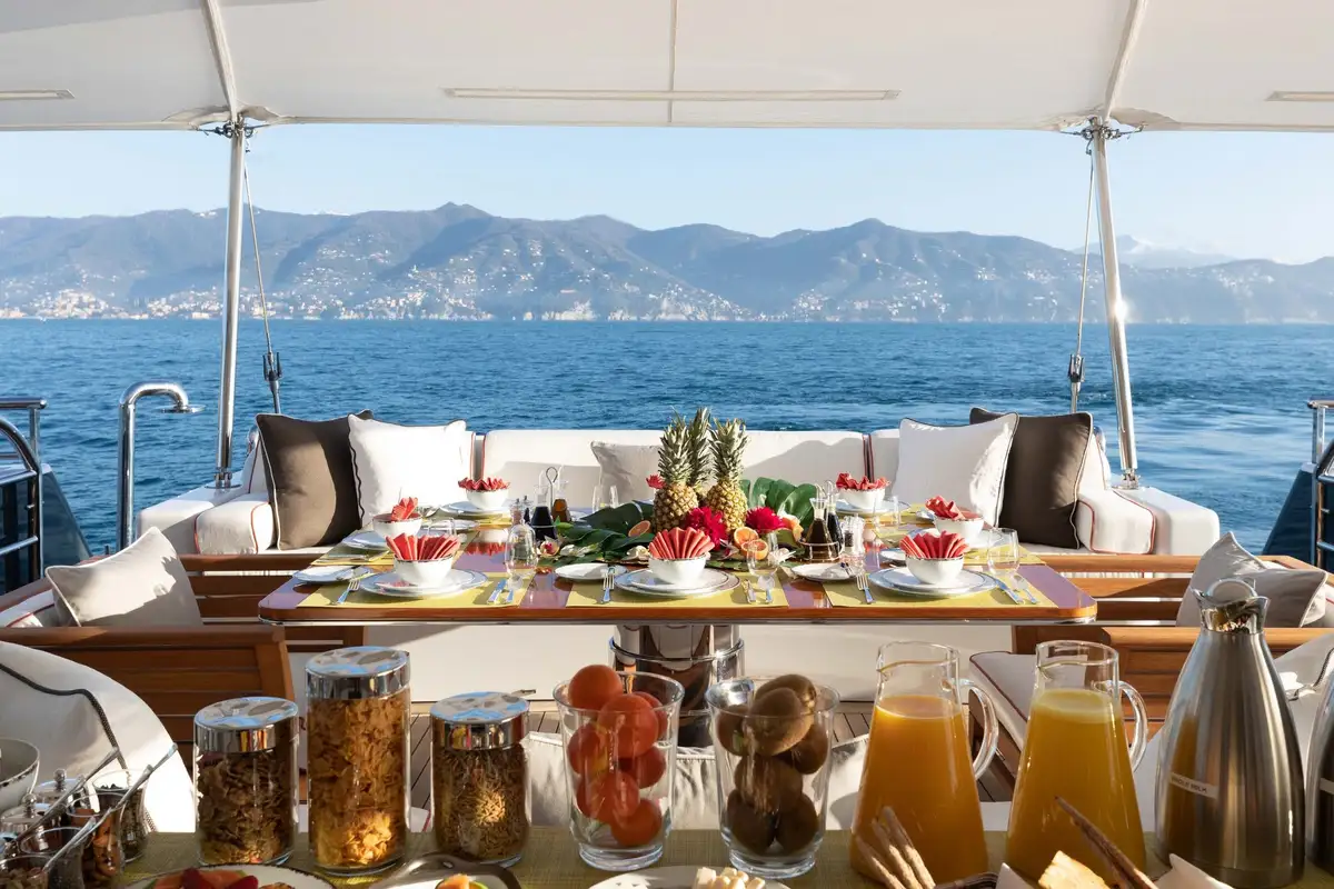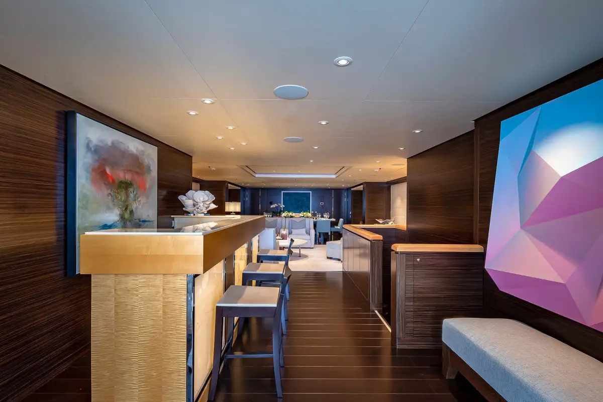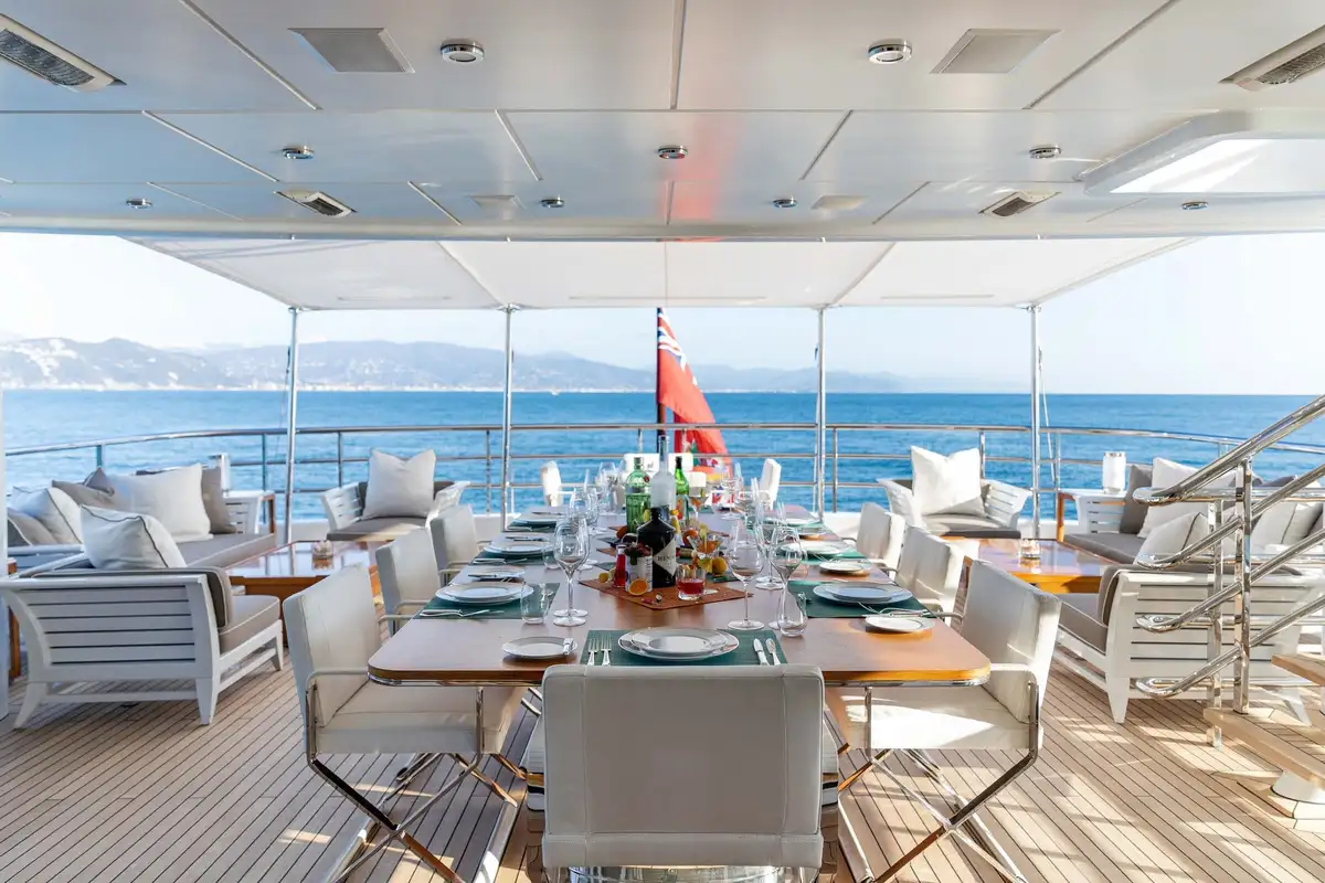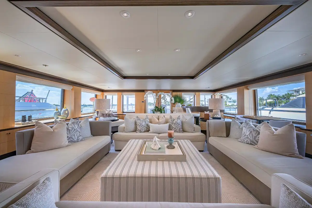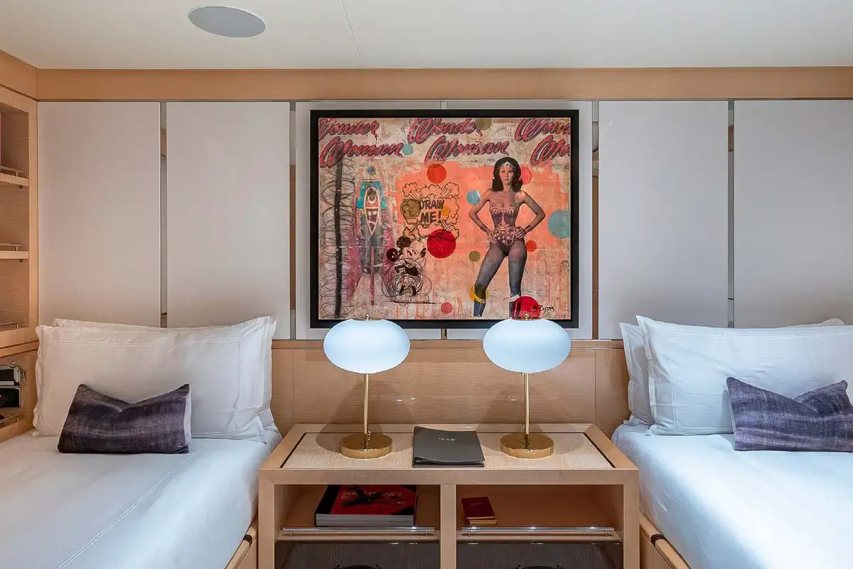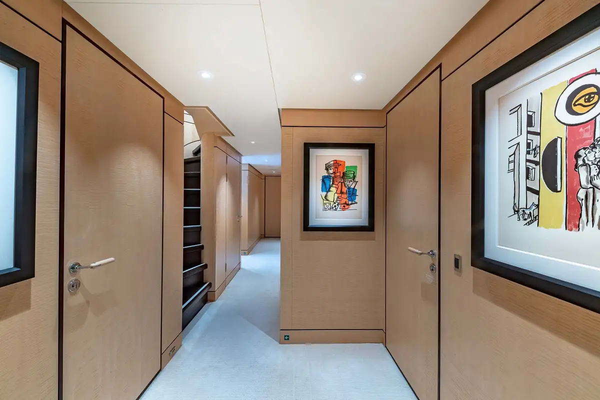 Her beautifully appointed interior layout offers six cabins that sleep up to 12 guests, including a full-beam master suite with private lounge/study, en suite and walk-in wardrobe. A further twin cabin located aft of the master suite provides an ideal sleeping arrangement for charters with children or staff. A further four cabins are situated on the lower deck, comprising a VIP stateroom, double cabin and two convertible cabins with pullmans. She is also capable of carrying up to 14 crew onboard to ensure a relaxed luxury yacht charter experience whatever your destination.