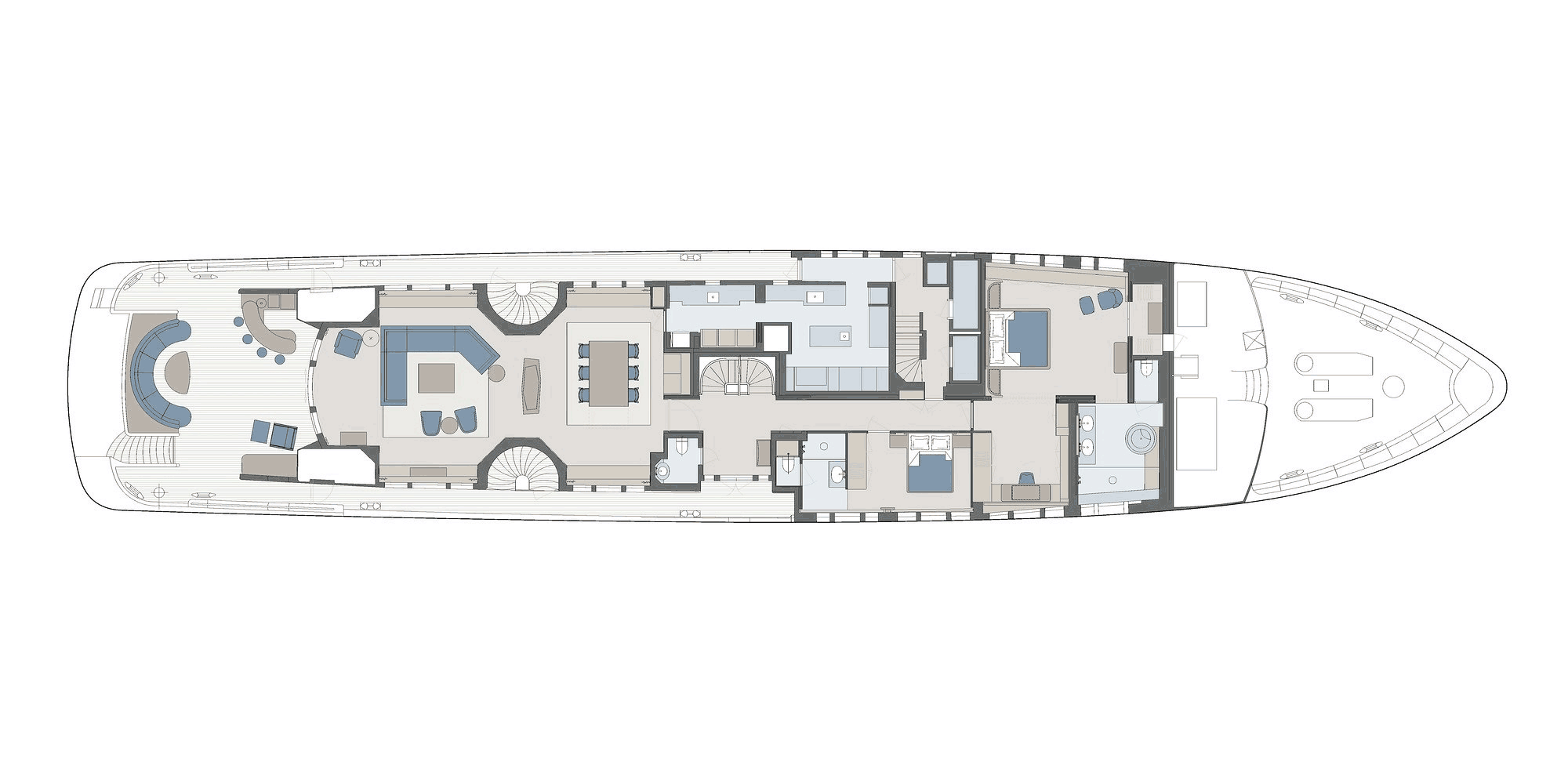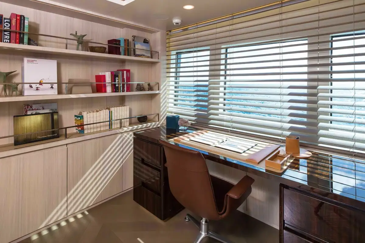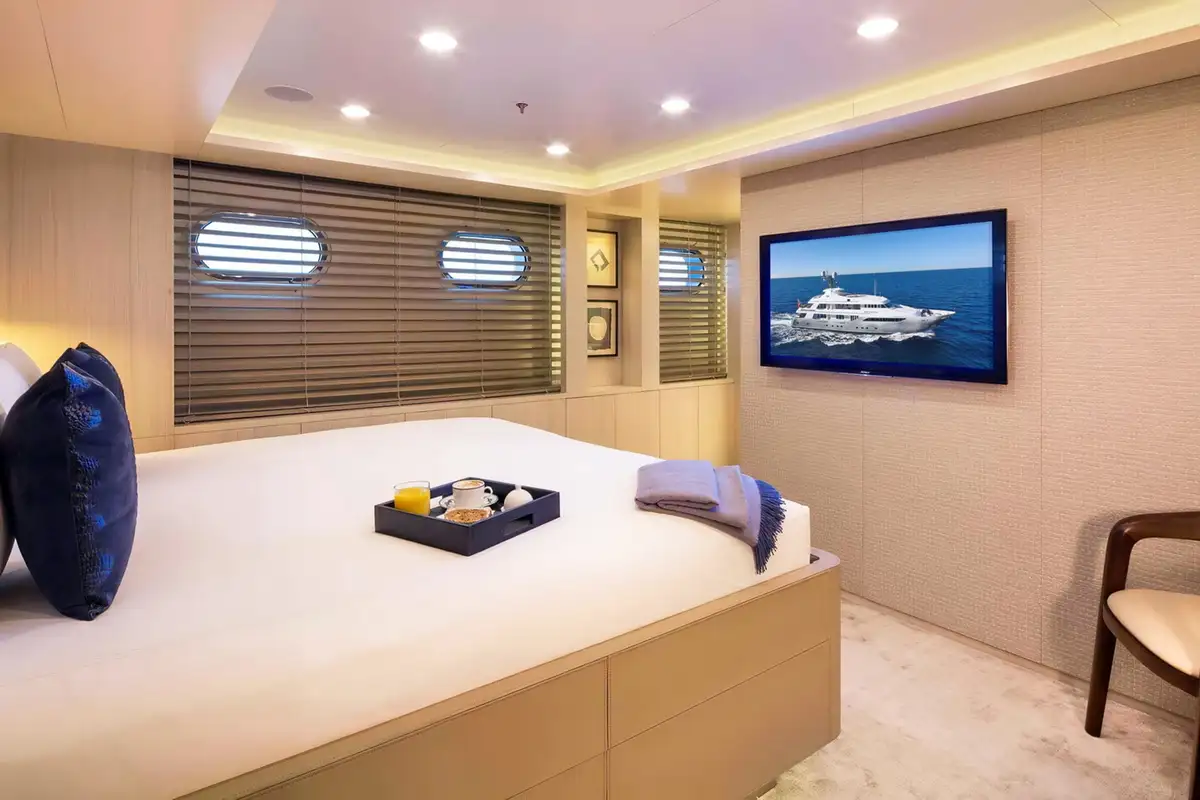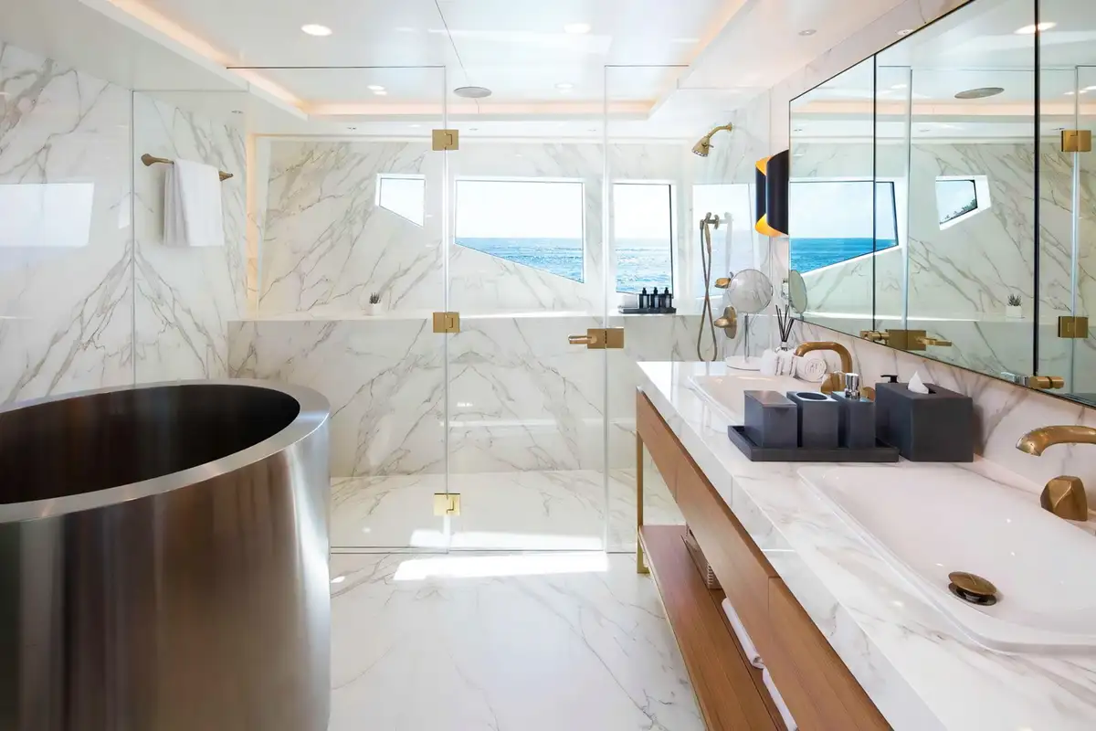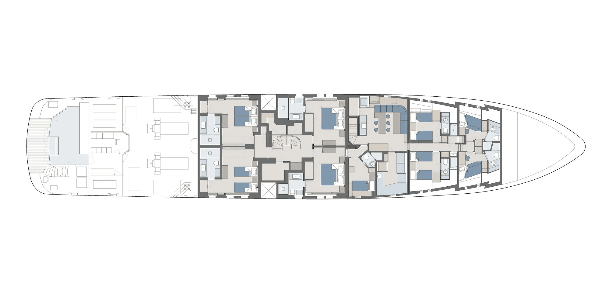 Yours is the exquisitely restful full beam master suite on the main deck with private office and marble en suite and there is a VIP suite next door for your nearest and dearest. Four en suite cabins on the lower deck, two double cabins and two convertible cabins, complete her sumptuous family friendly accommodation.