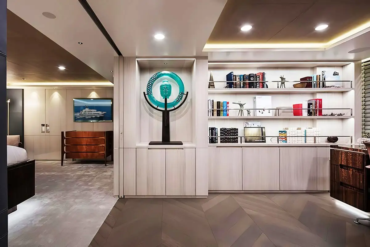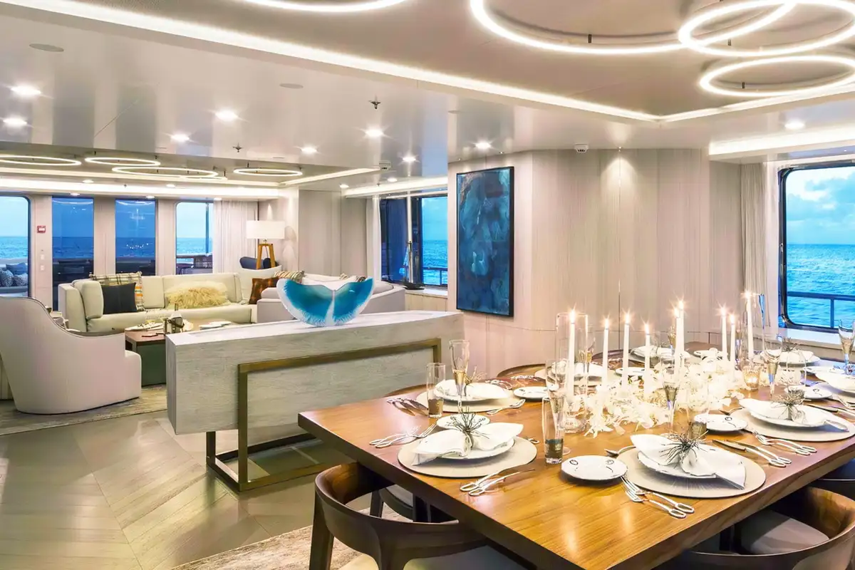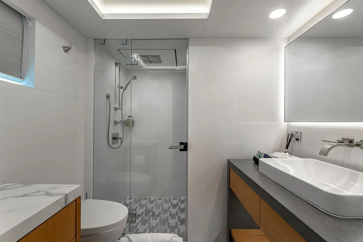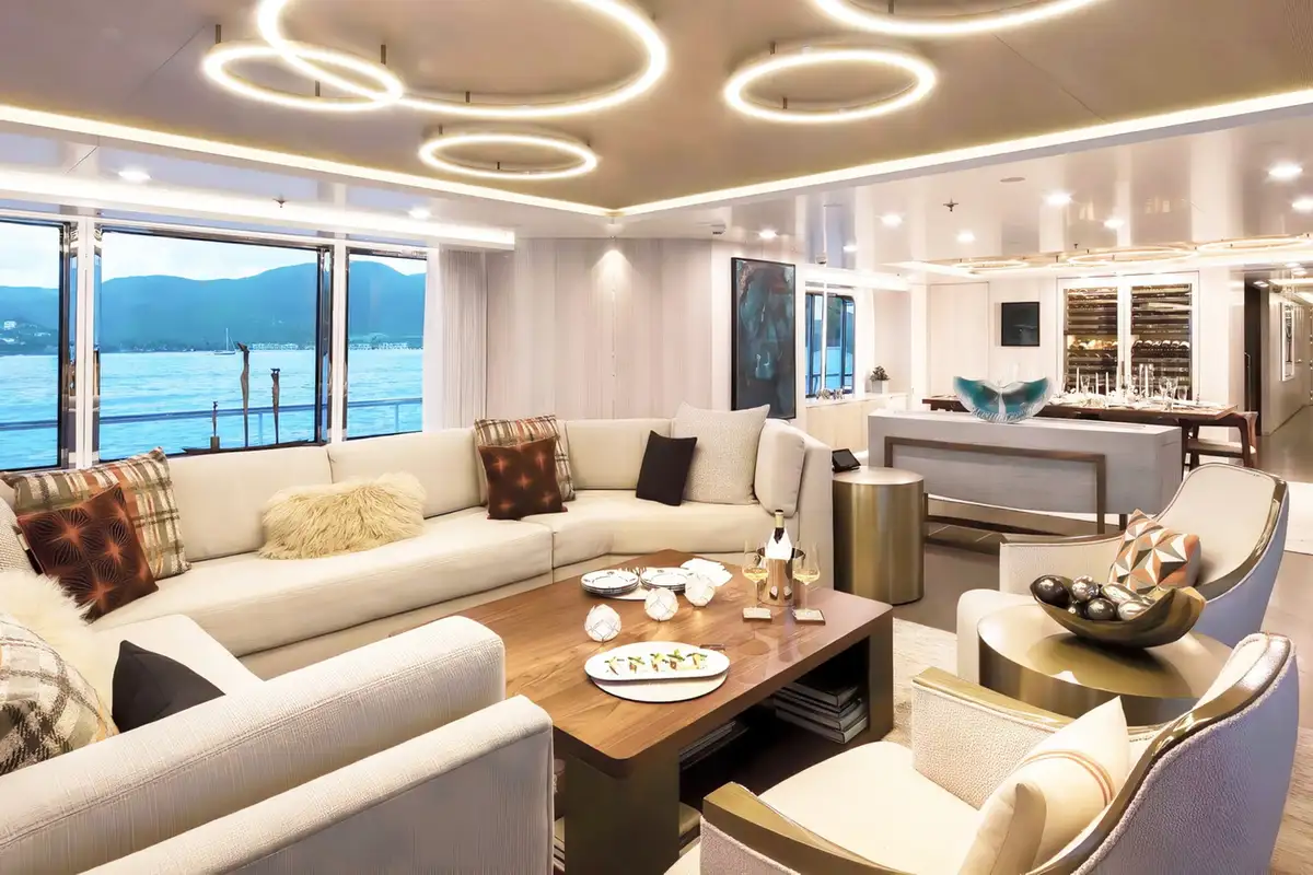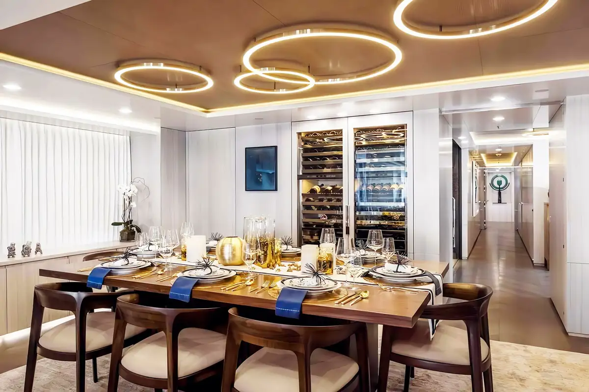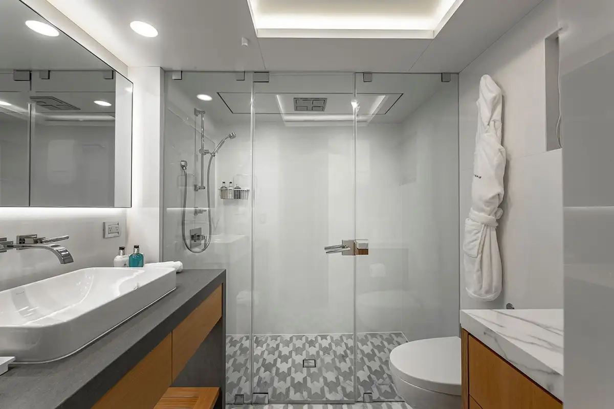 Yours is the exquisitely restful full beam master suite on the main deck with private office and marble en suite and there is a VIP suite next door for your nearest and dearest. Four en suite cabins on the lower deck, two double cabins and two convertible cabins, complete her sumptuous family friendly accommodation.