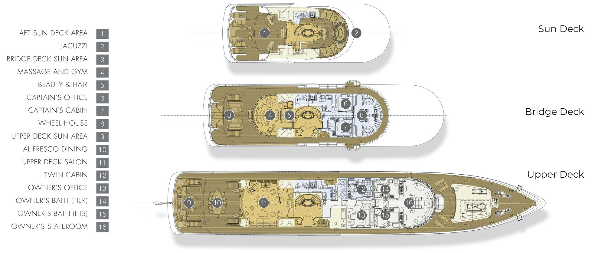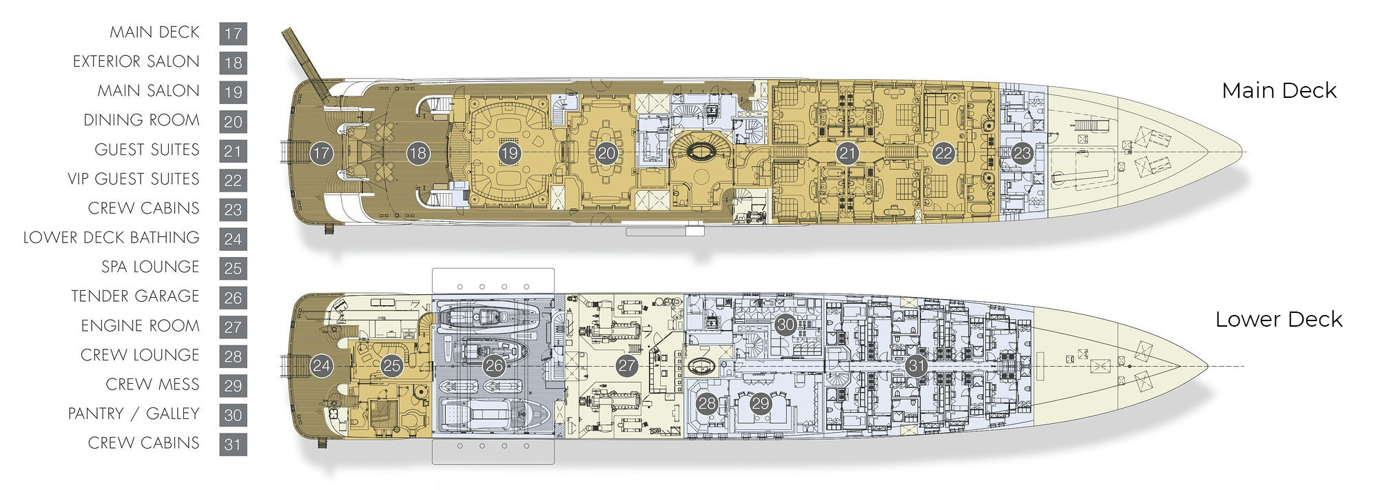 The bridge deck is all about pampering with a large massage and spa area and a beauty salon for hair, make-up and treatments. After your session relax on sun lounge or sun pads aft with a herbal tea as you take in the views or share stories with friends. When you're ready for more pampering, take the elevator down to the beach club with sauna, jacuzzi, rain shower and media room.