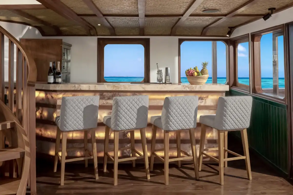 Dine in an underwater restaurant inspired by Maldivian coral reefs. Reach Subsix by speedboat, then descend a dramatic three-tier staircase. Below, enjoy cocktails at the clam-inspired bar, nestled in soft anemone chairs beneath waves of capiz shells.